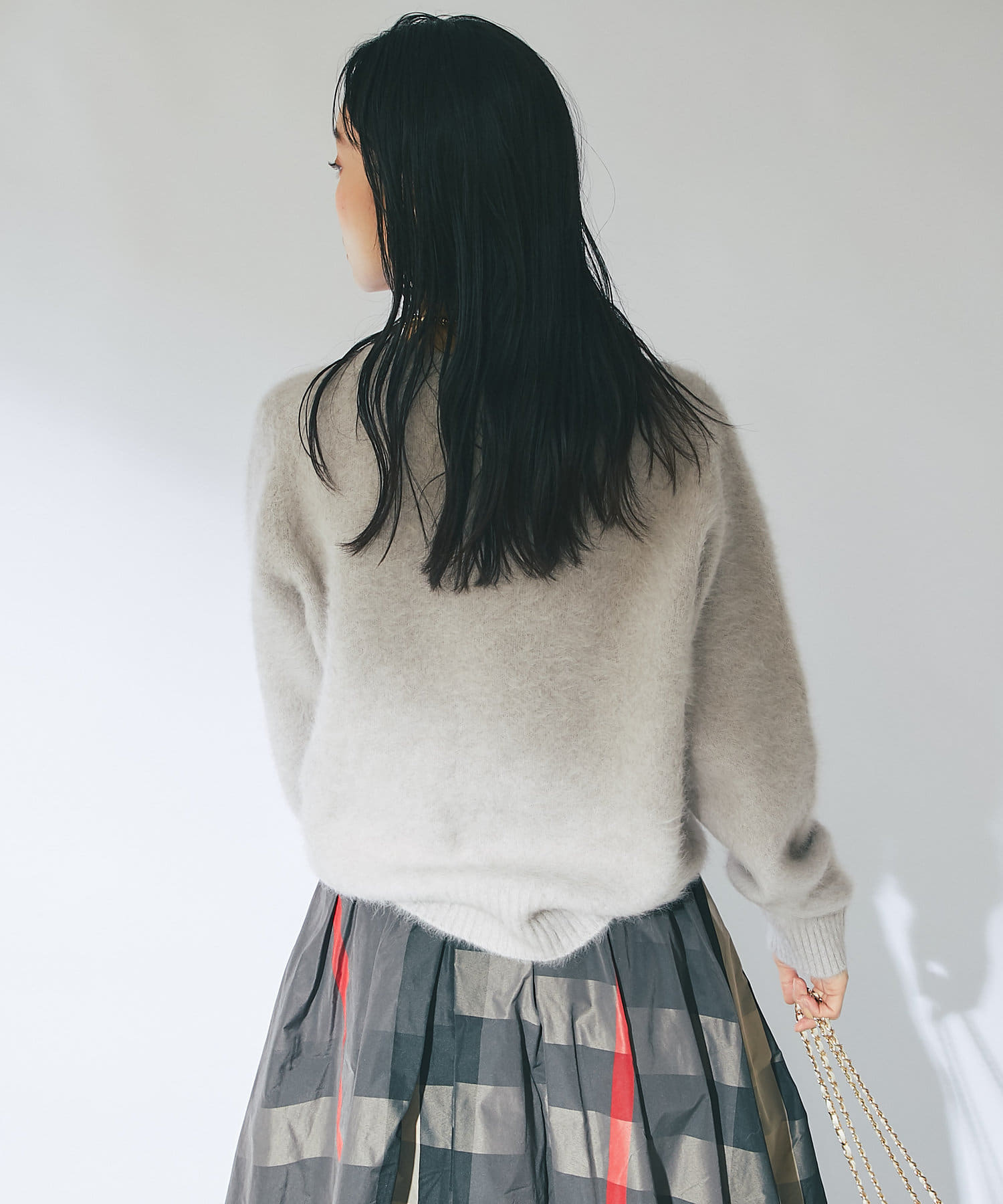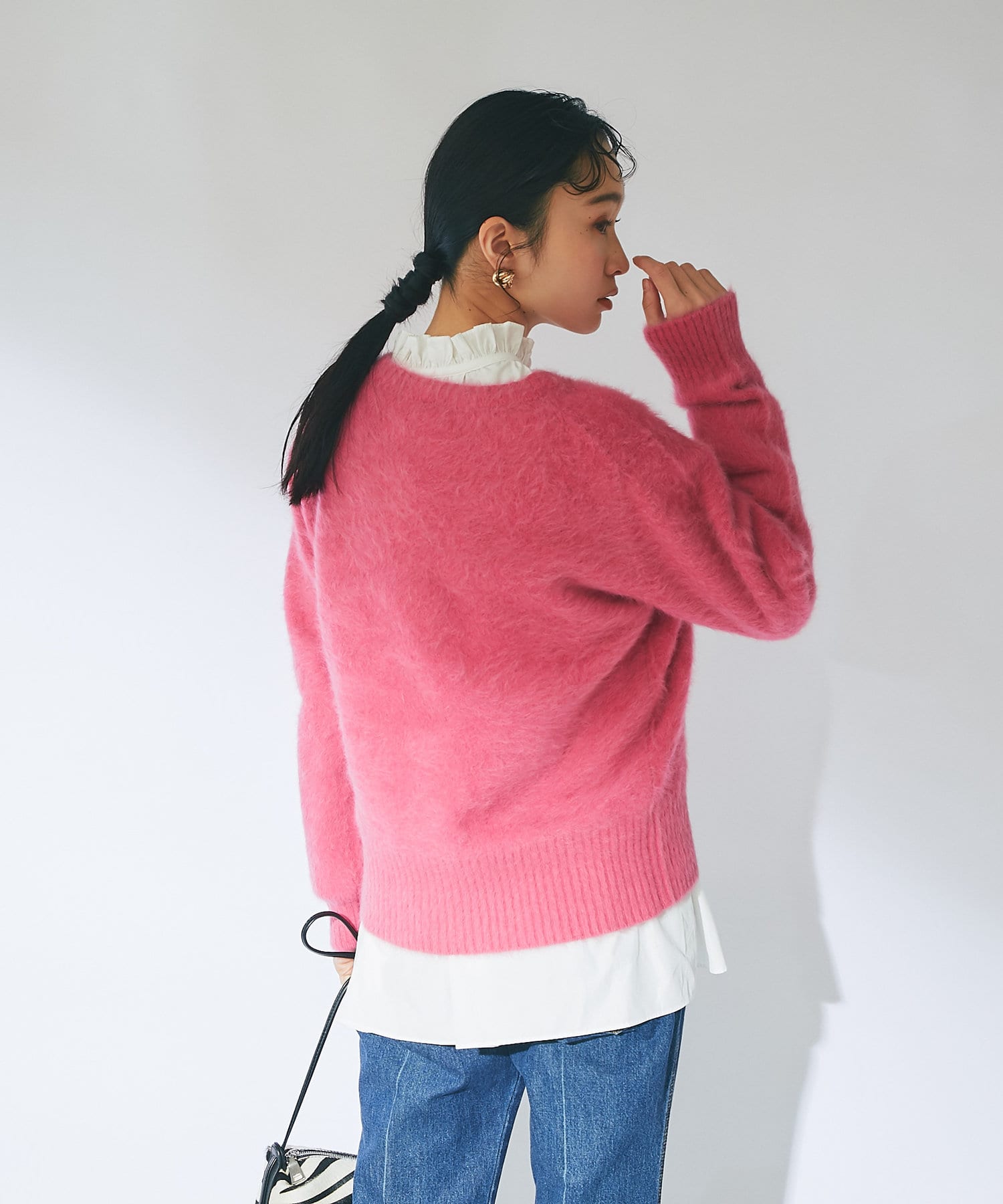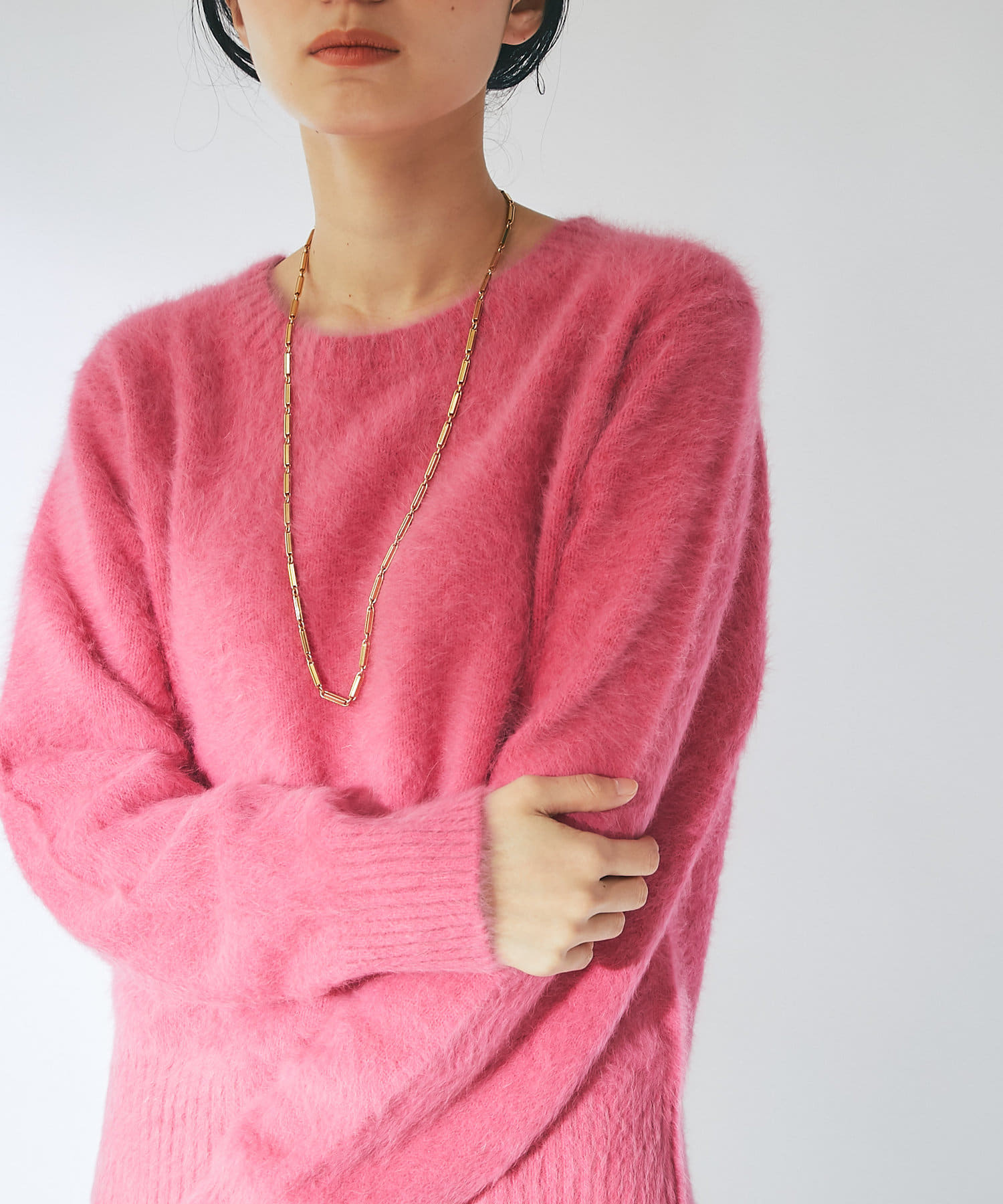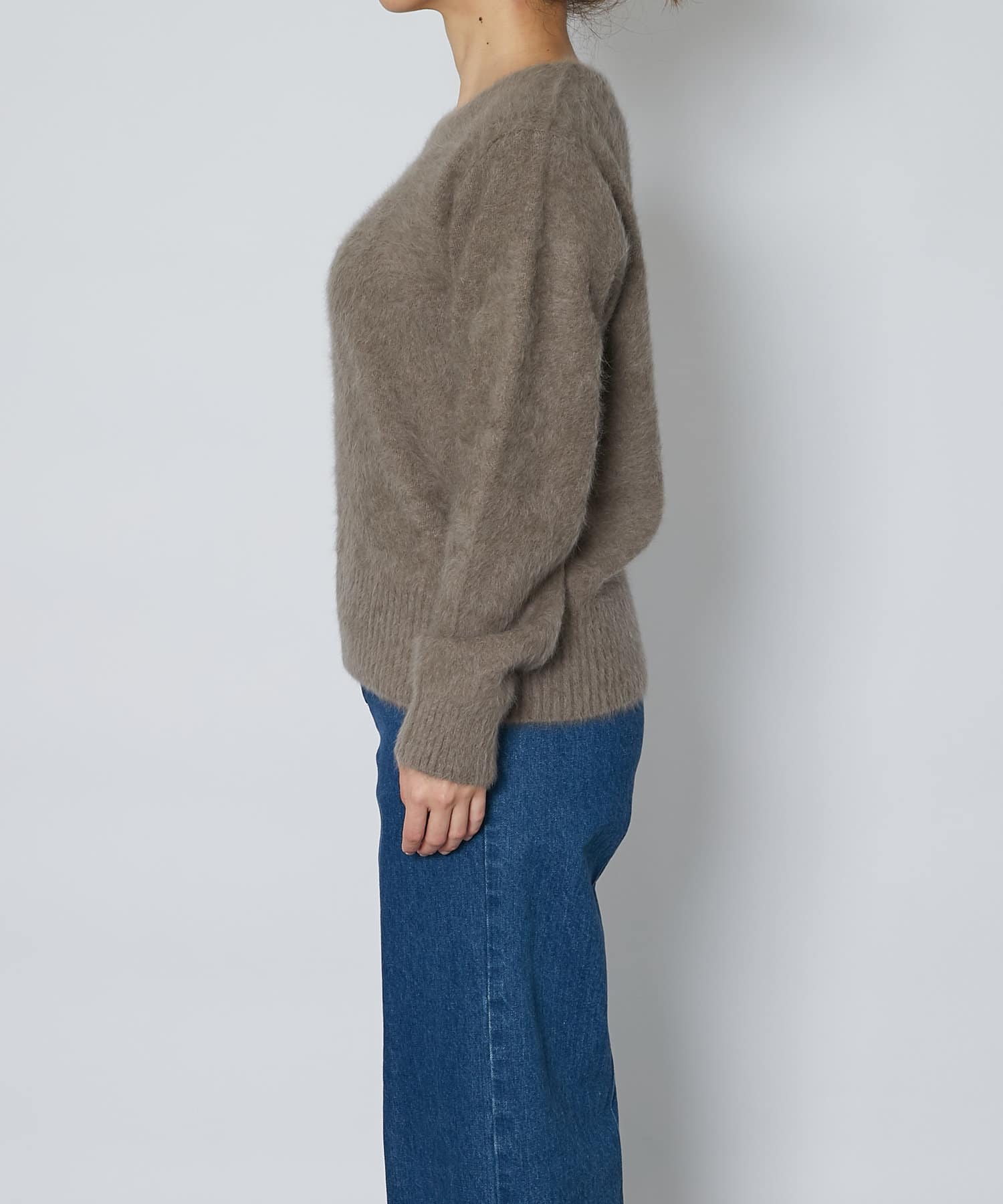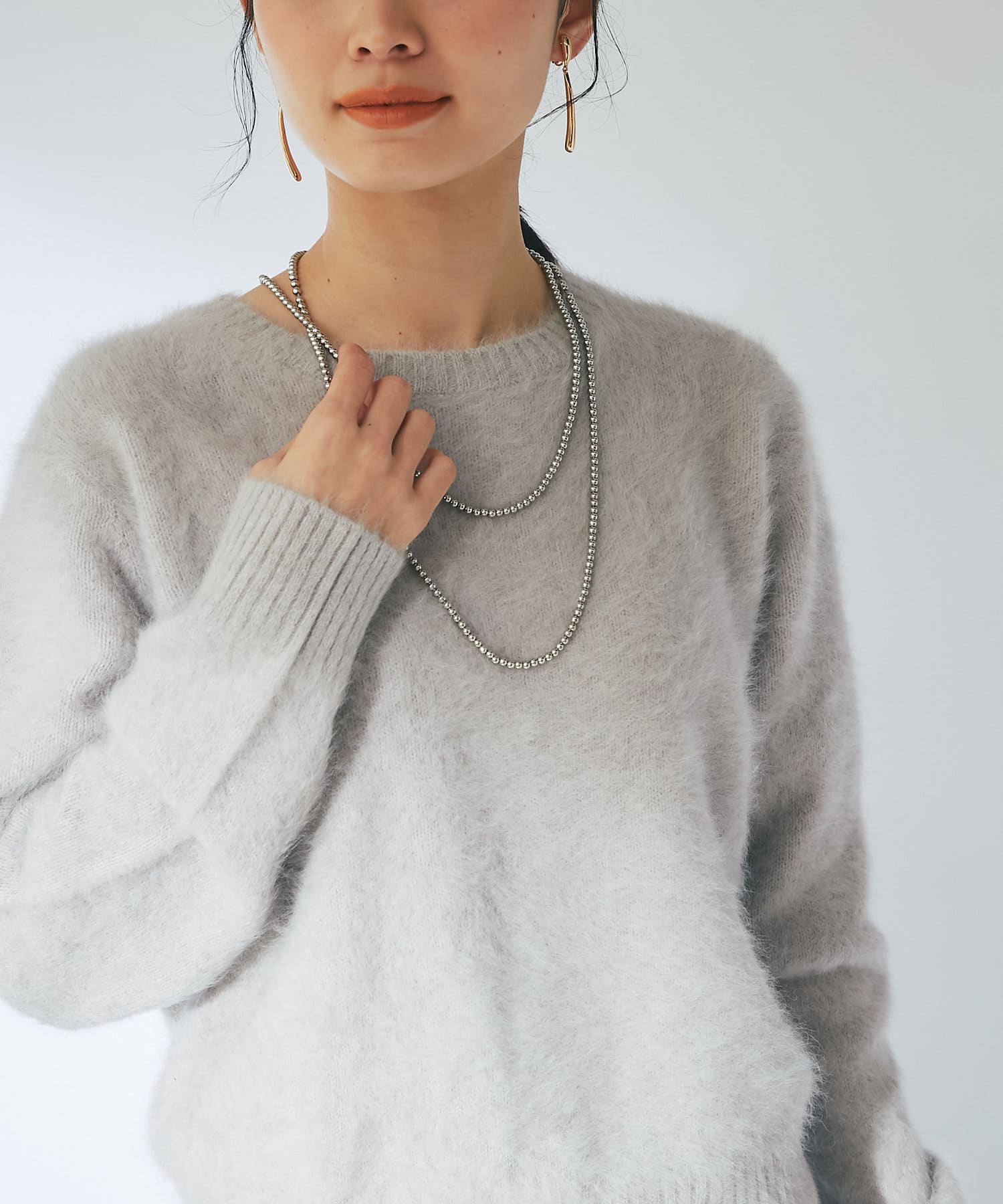 ふわふわとしたヘアリーなカシミヤ混フォックス素材で贅沢&シーズンムードたっぷりに仕上げたニット。