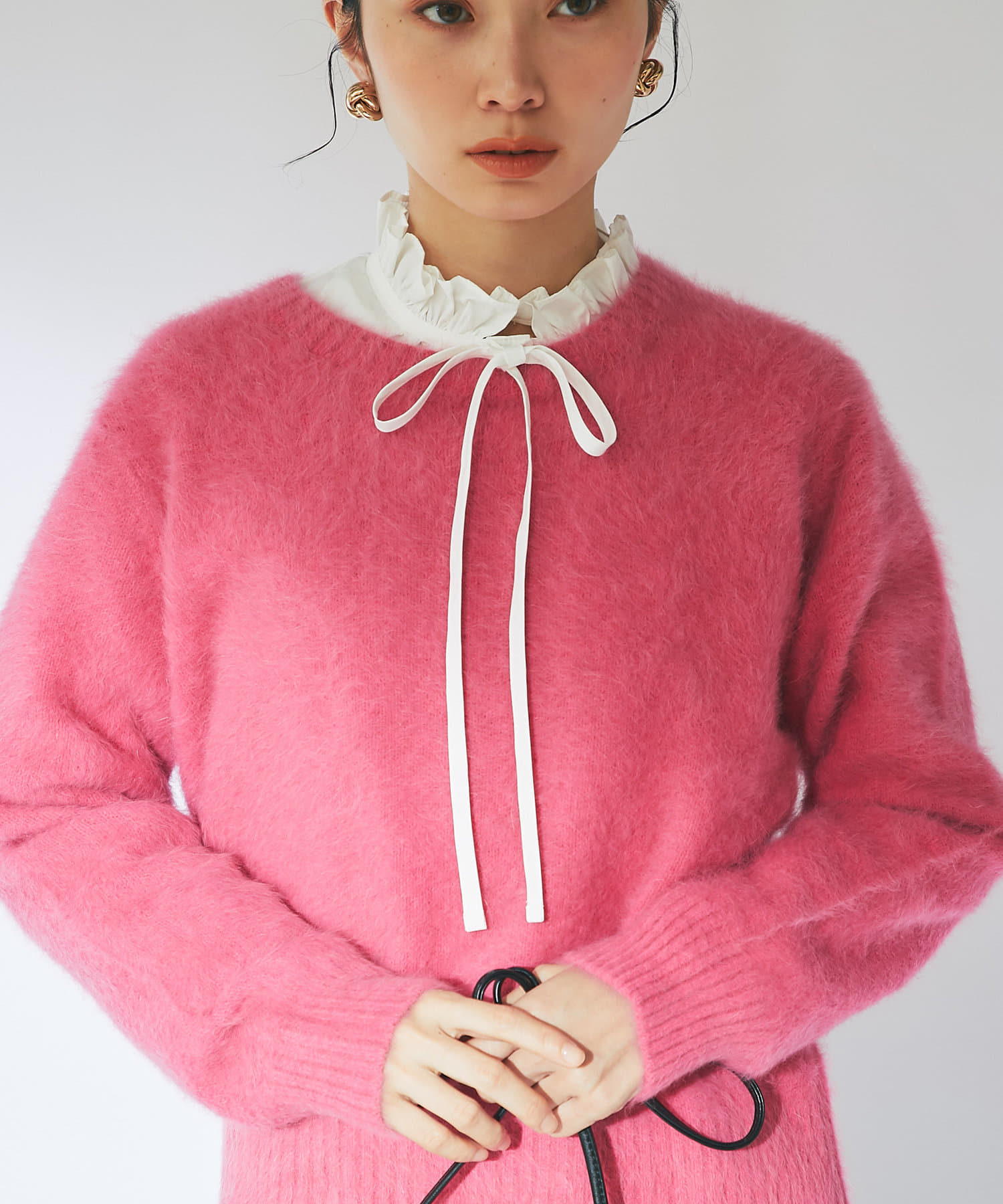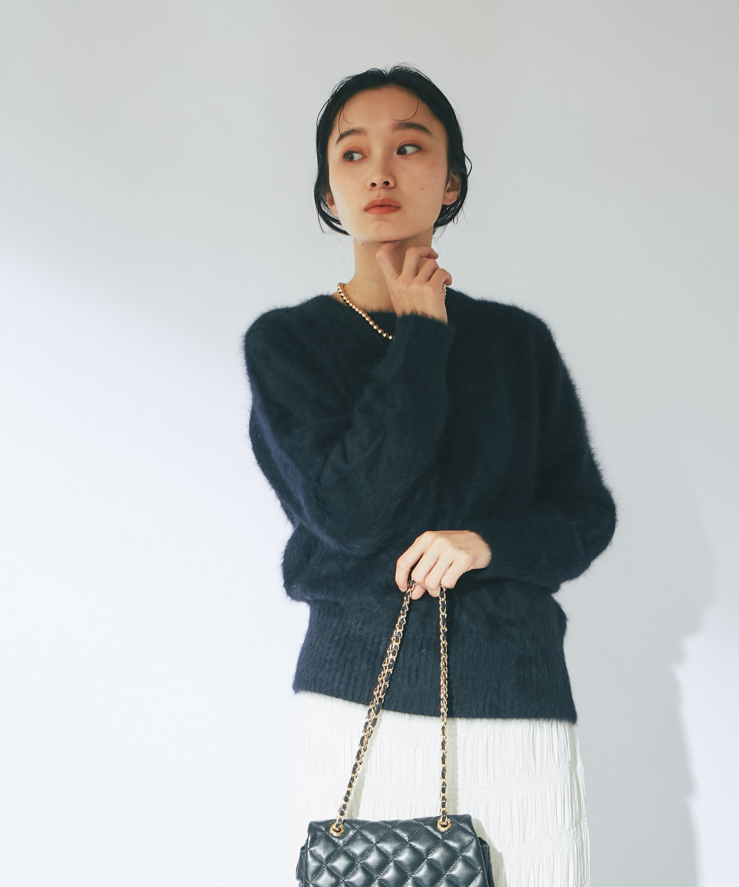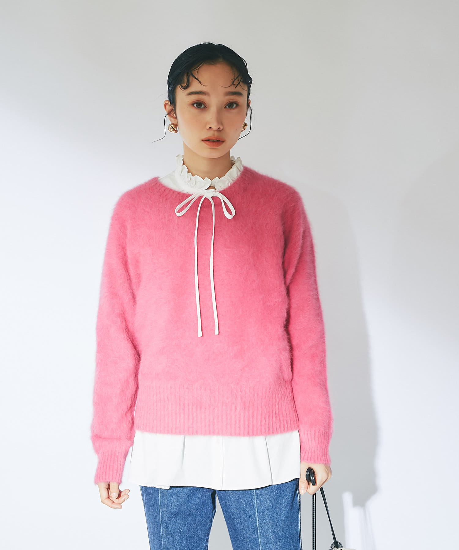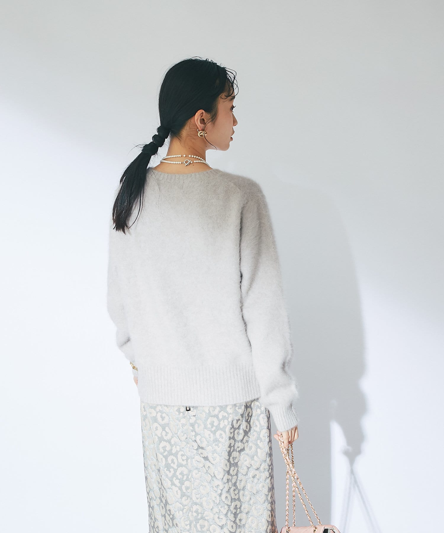 ふわふわとしたヘアリーなカシミヤ混フォックス素材で贅沢&シーズンムードたっぷりに仕上げたニット。