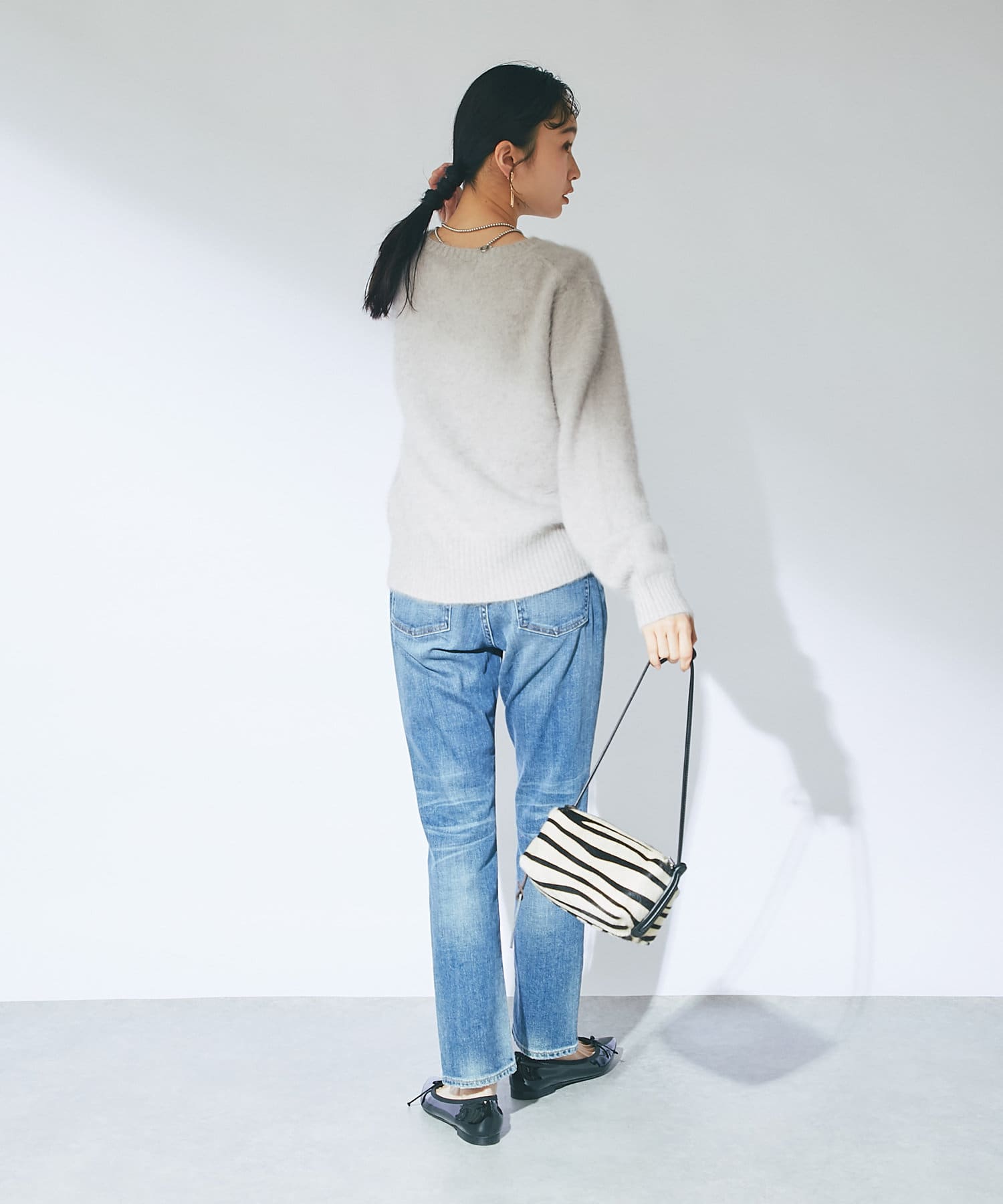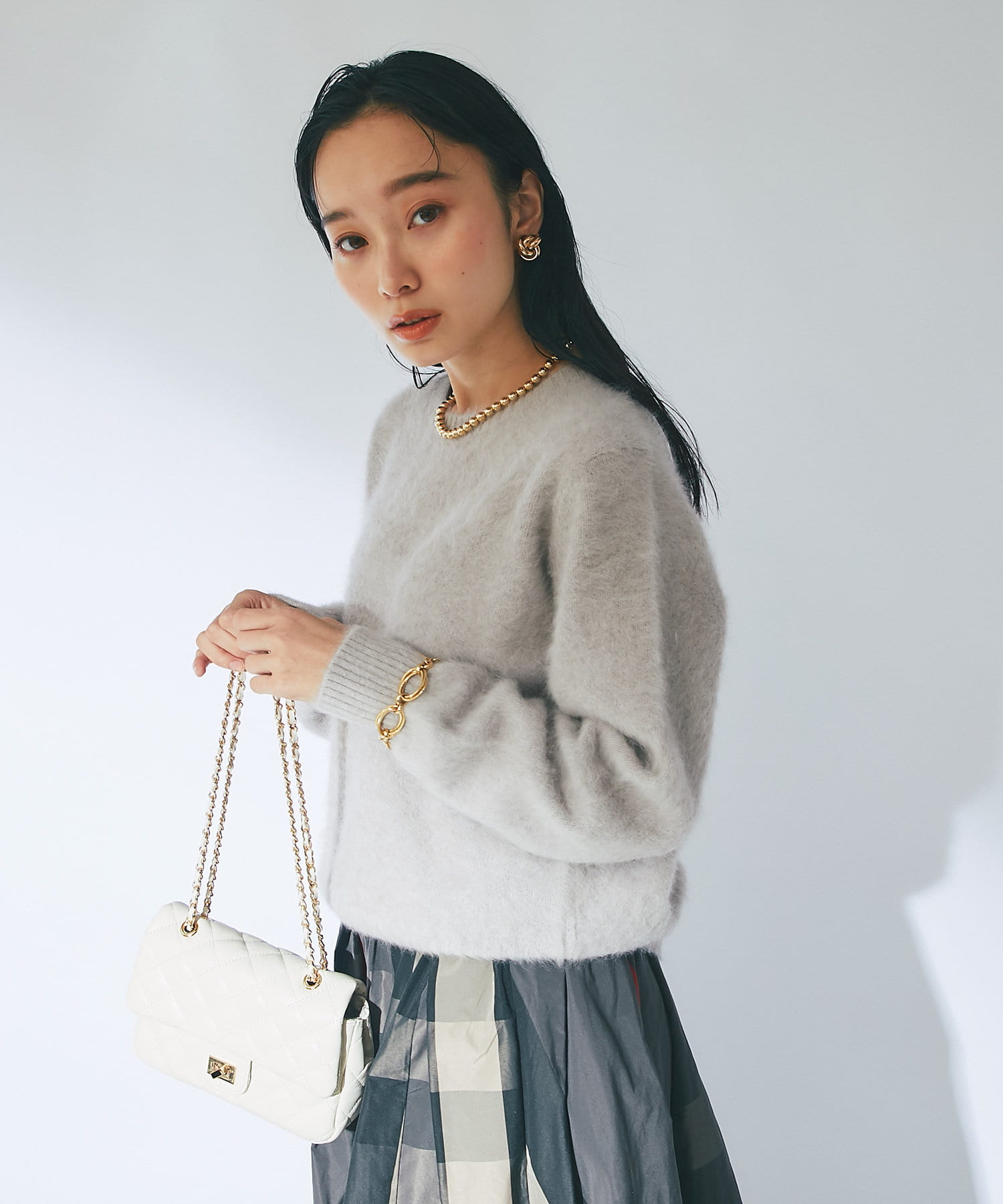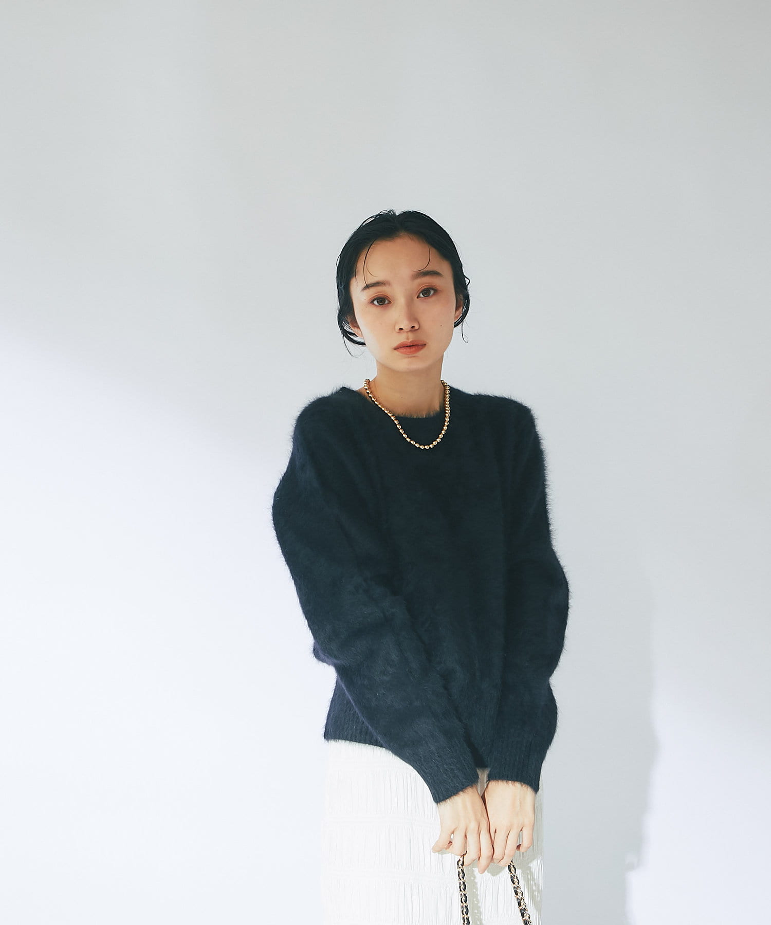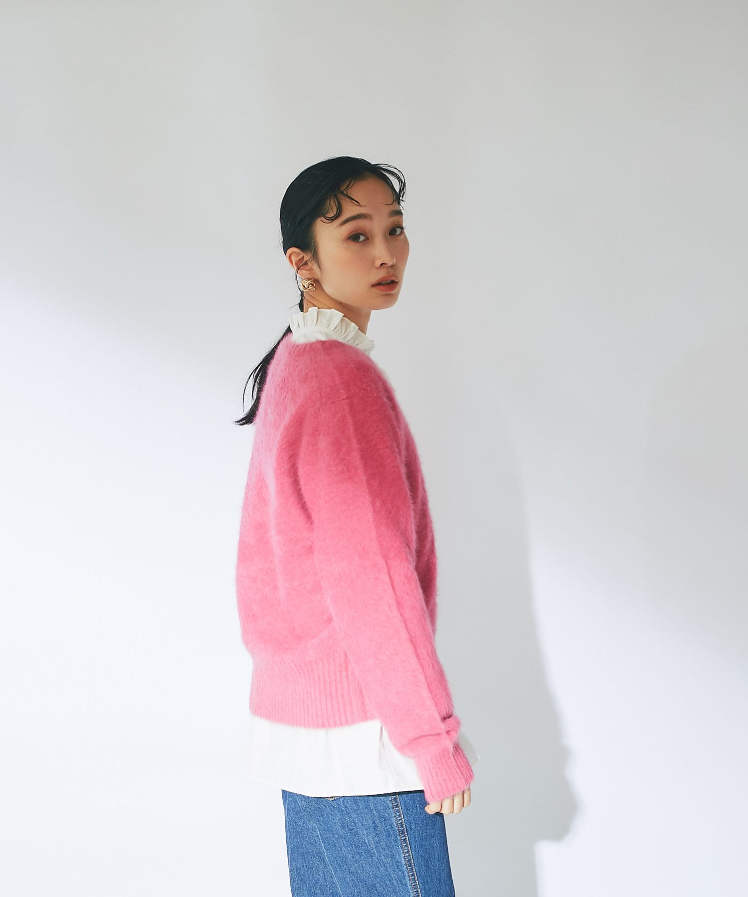 ふわふわとしたヘアリーなカシミヤ混フォックス素材で贅沢&シーズンムードたっぷりに仕上げたニット。