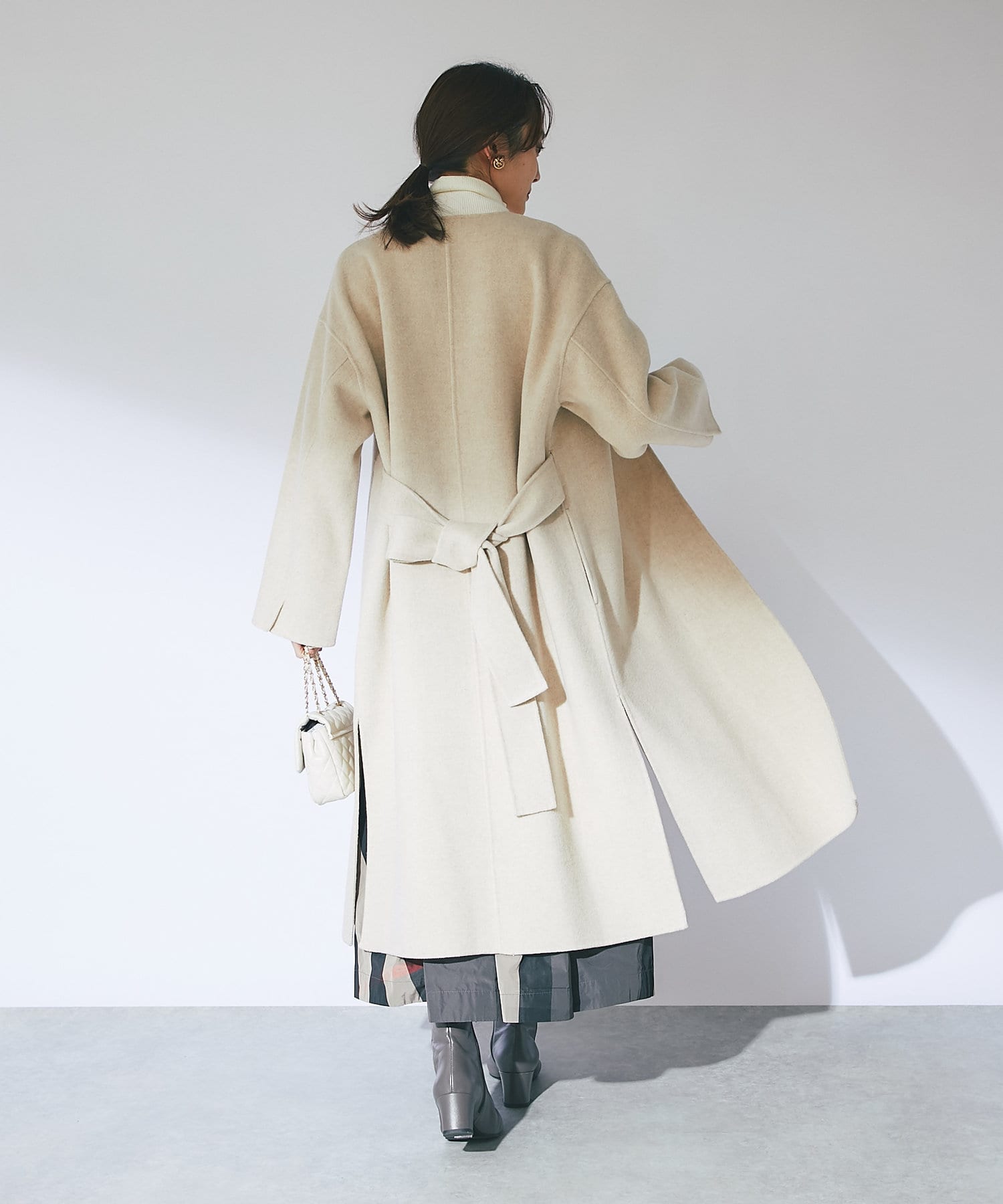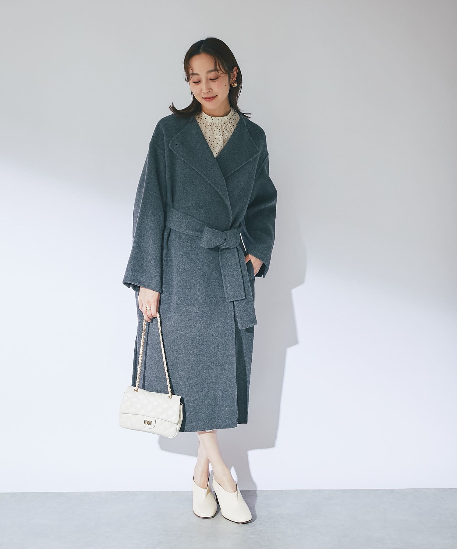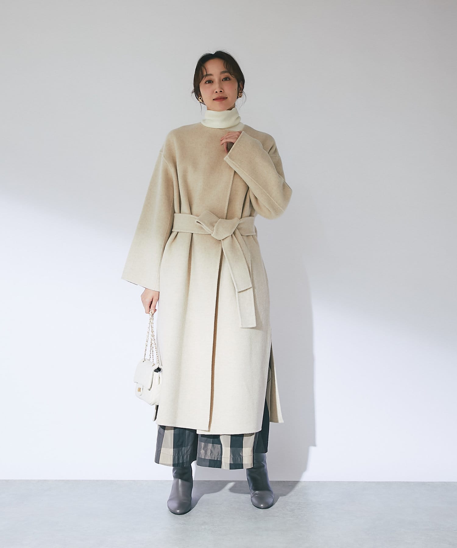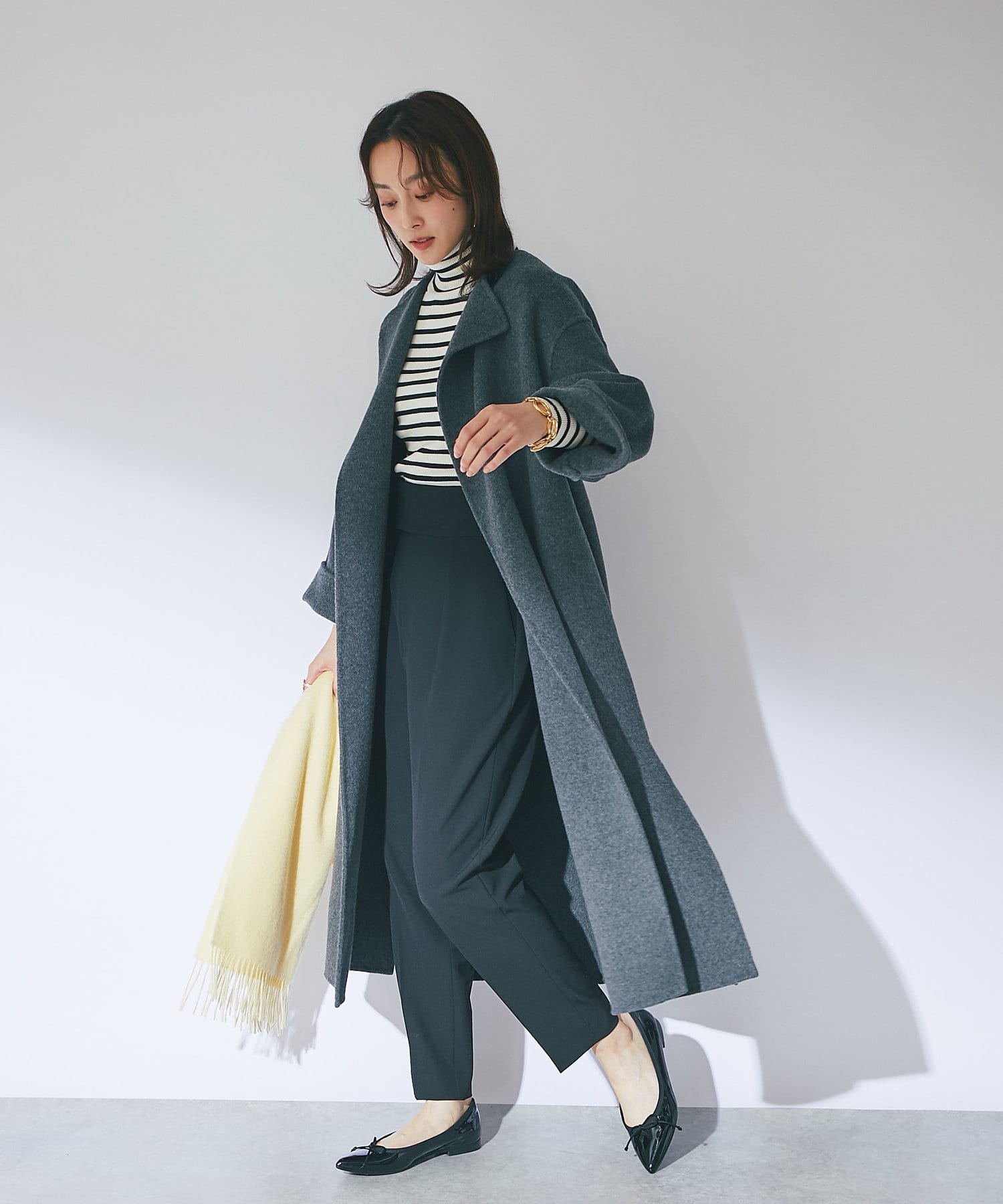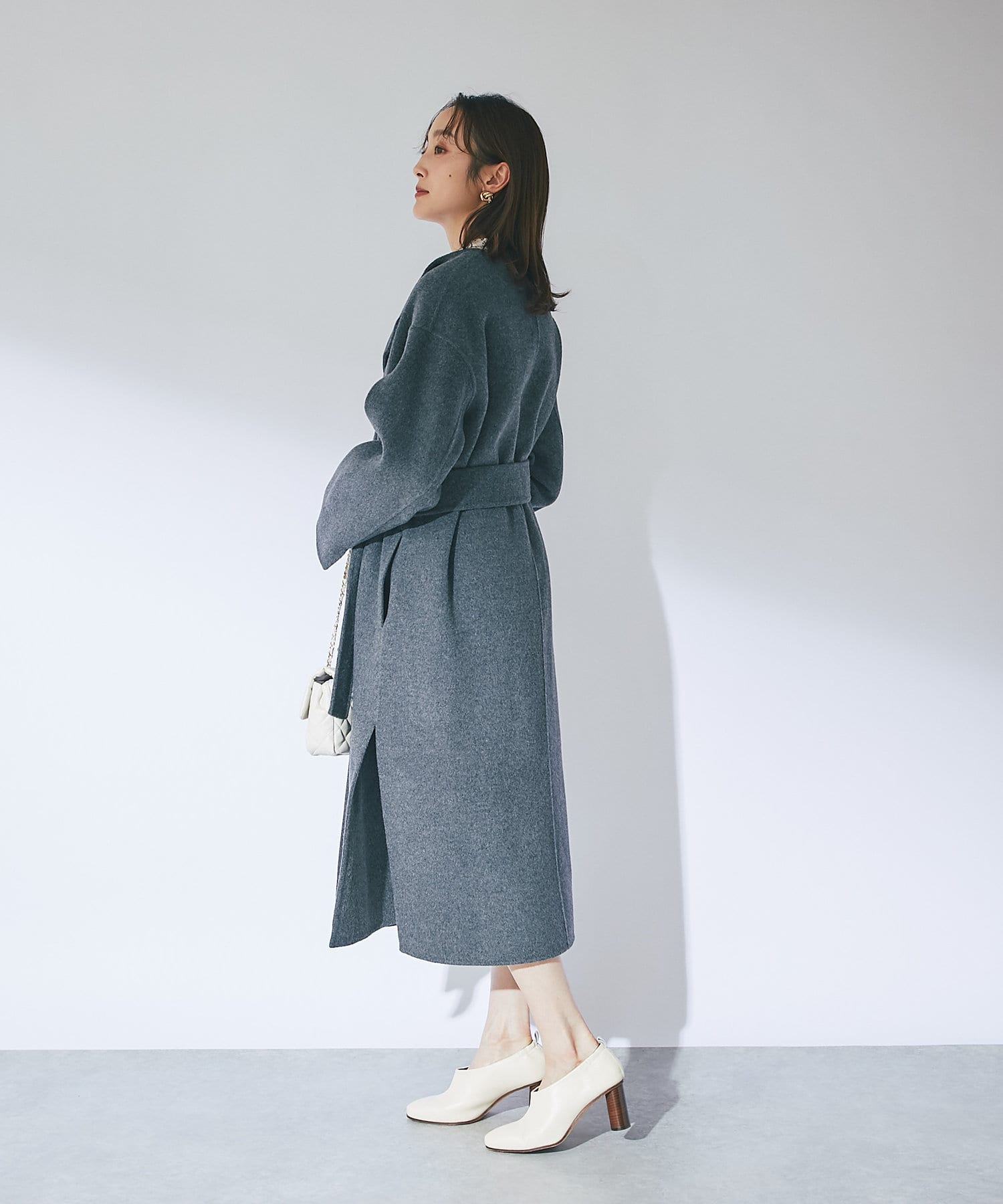 ロング丈のビーバーコートはウエストのベルトでスタイリングにメリハリを出せます◎