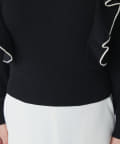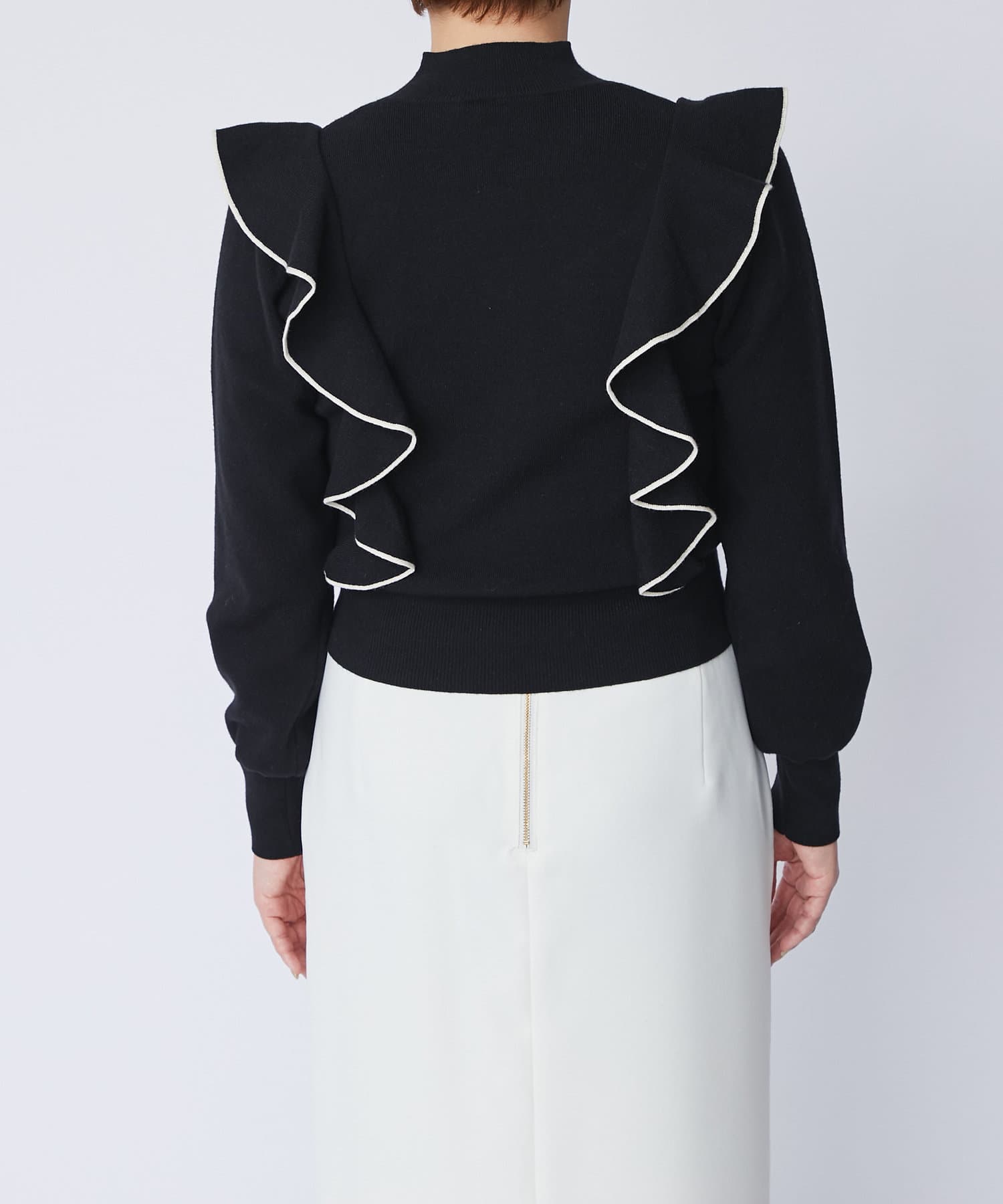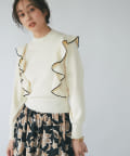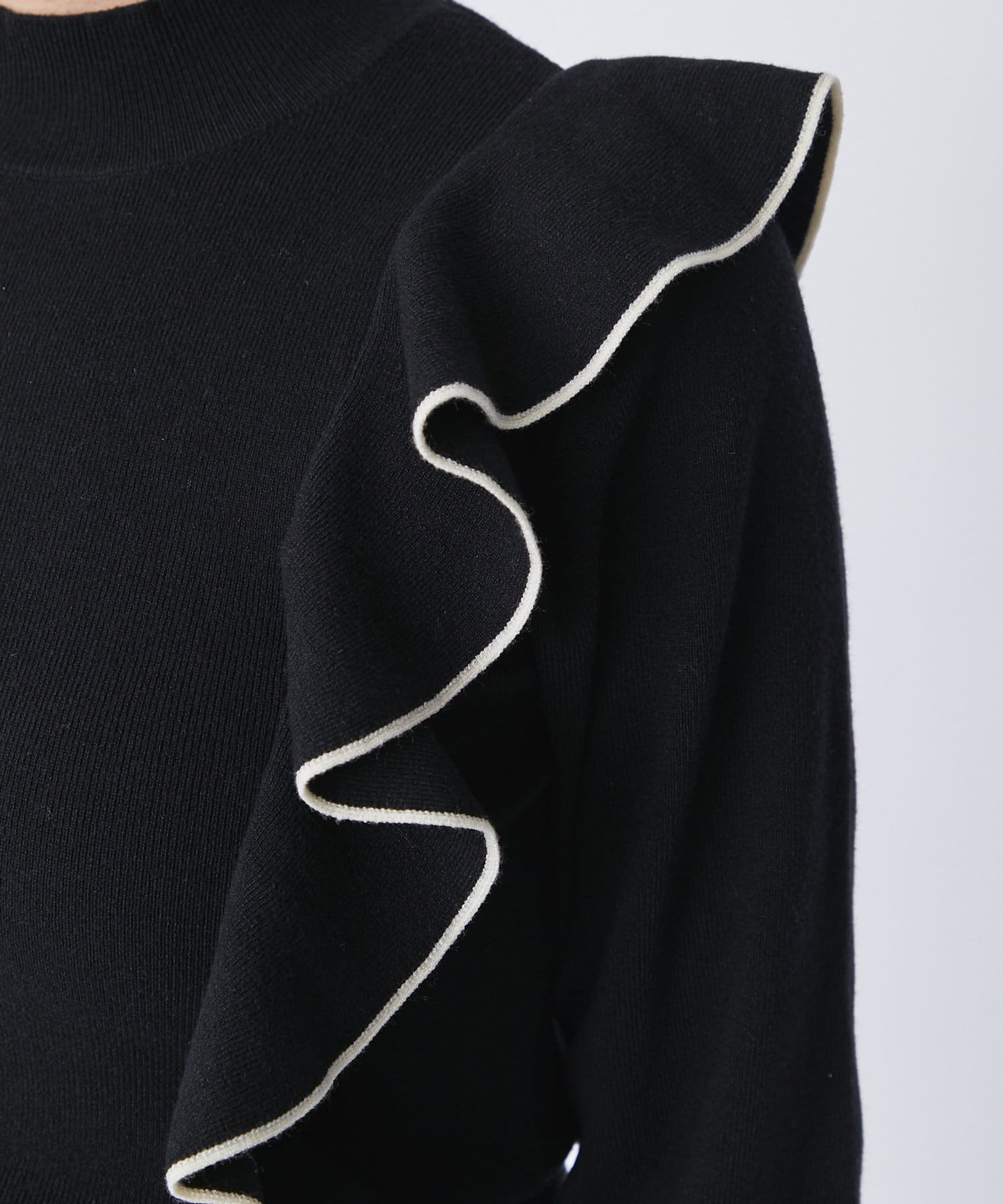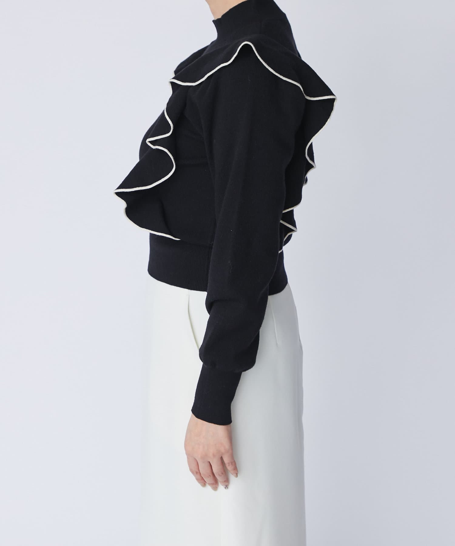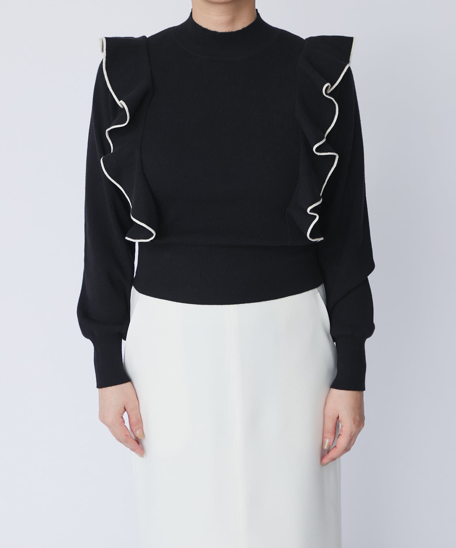 肩に入ったフリルがポイントのニットは大人フェミニンなモノトーンコーデアイテムです。