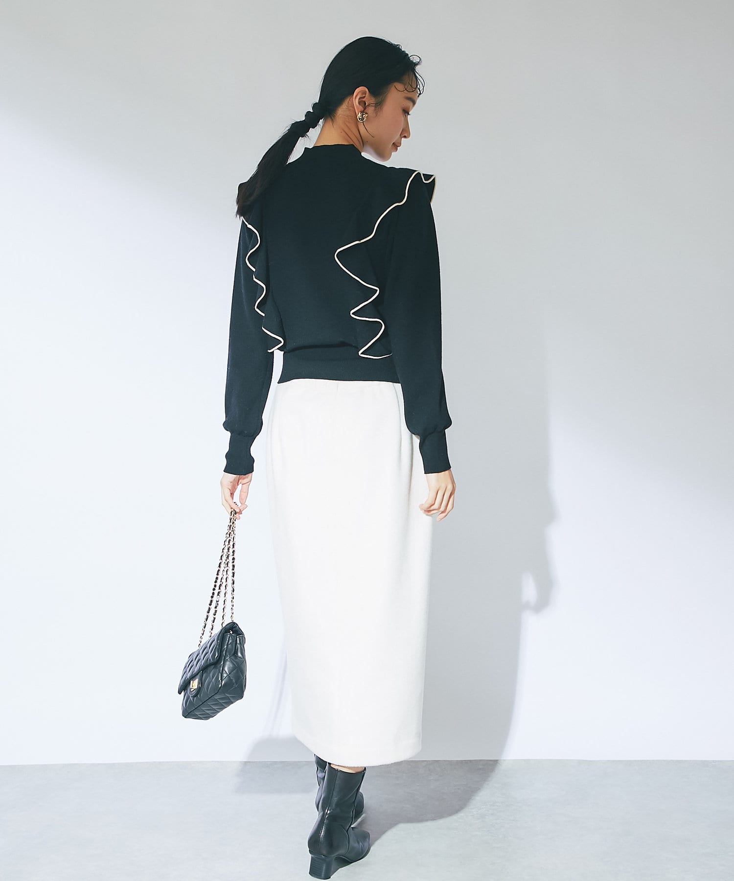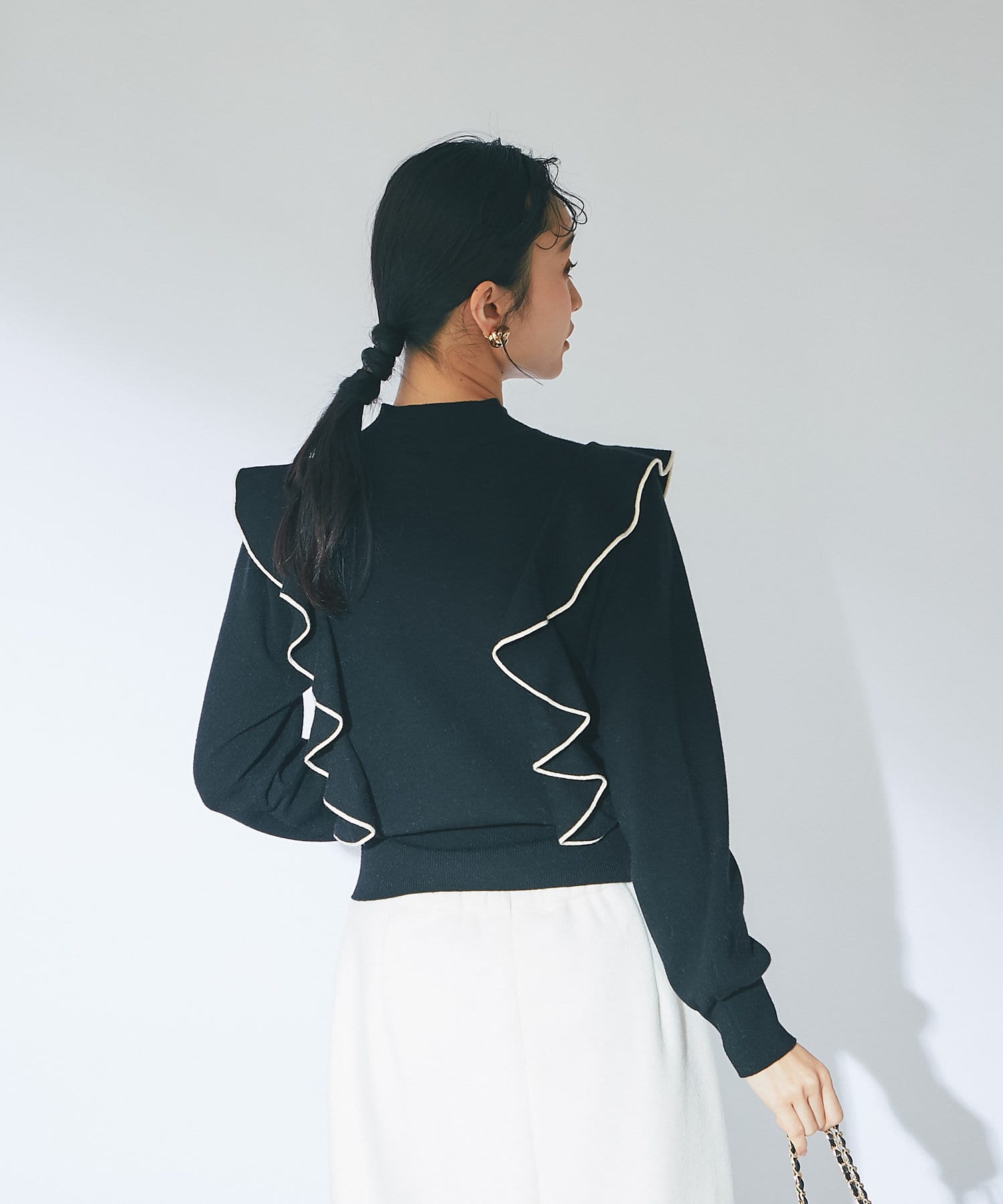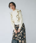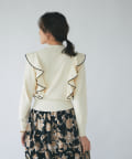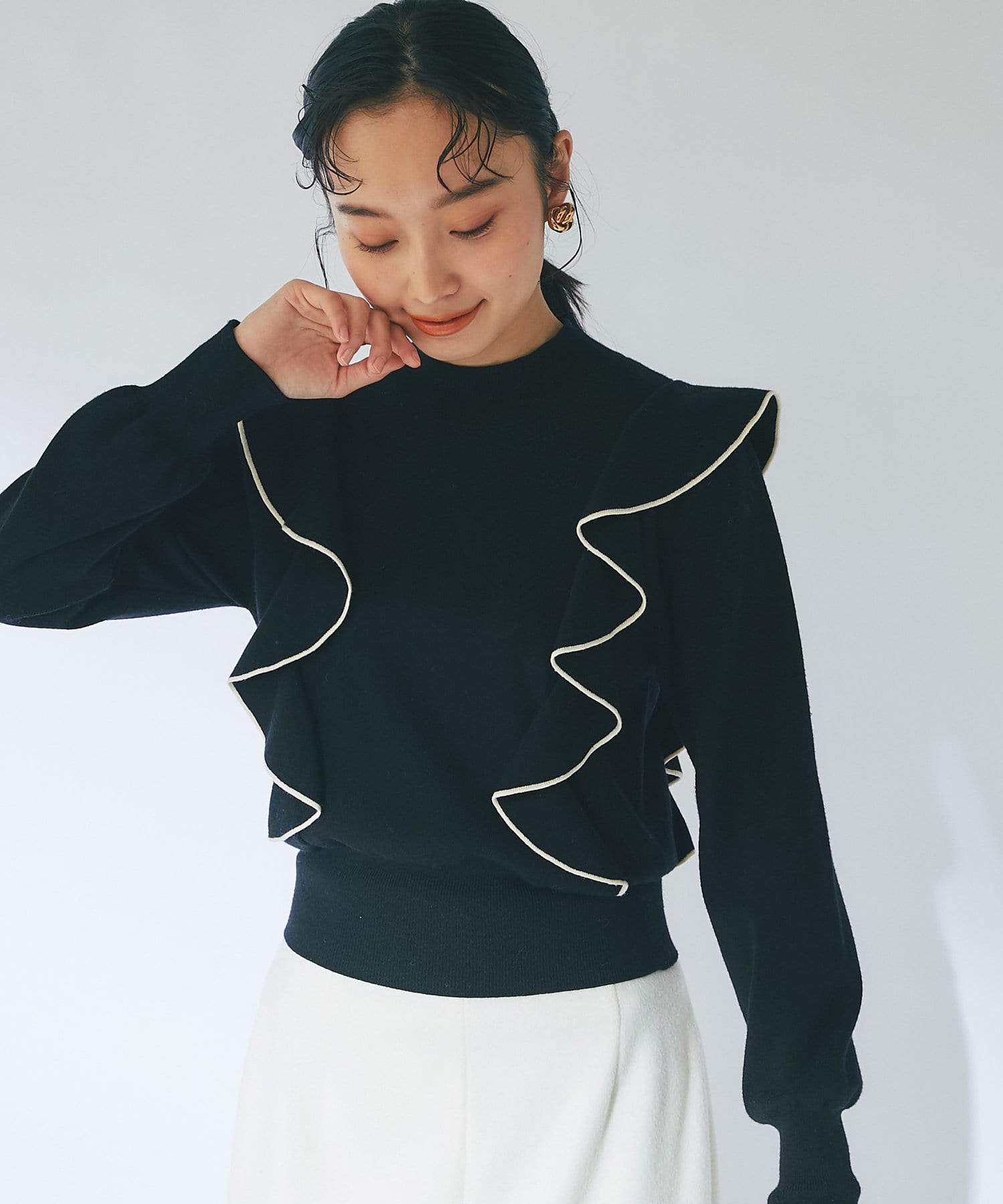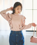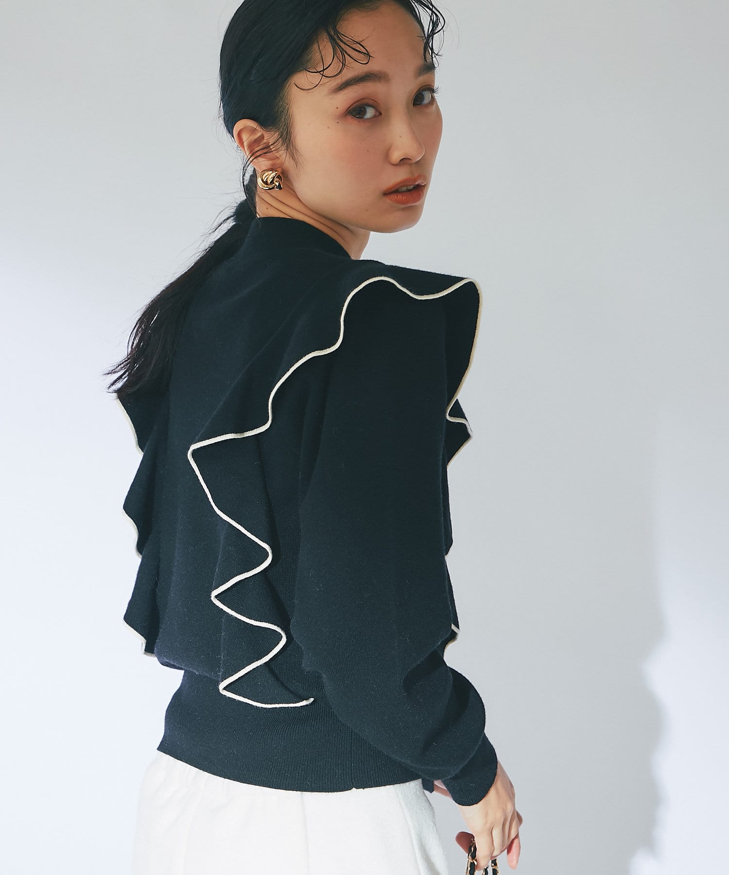 肩に入ったフリルがポイントのニットは大人フェミニンなモノトーンコーデアイテムです。
