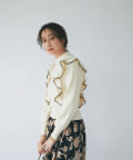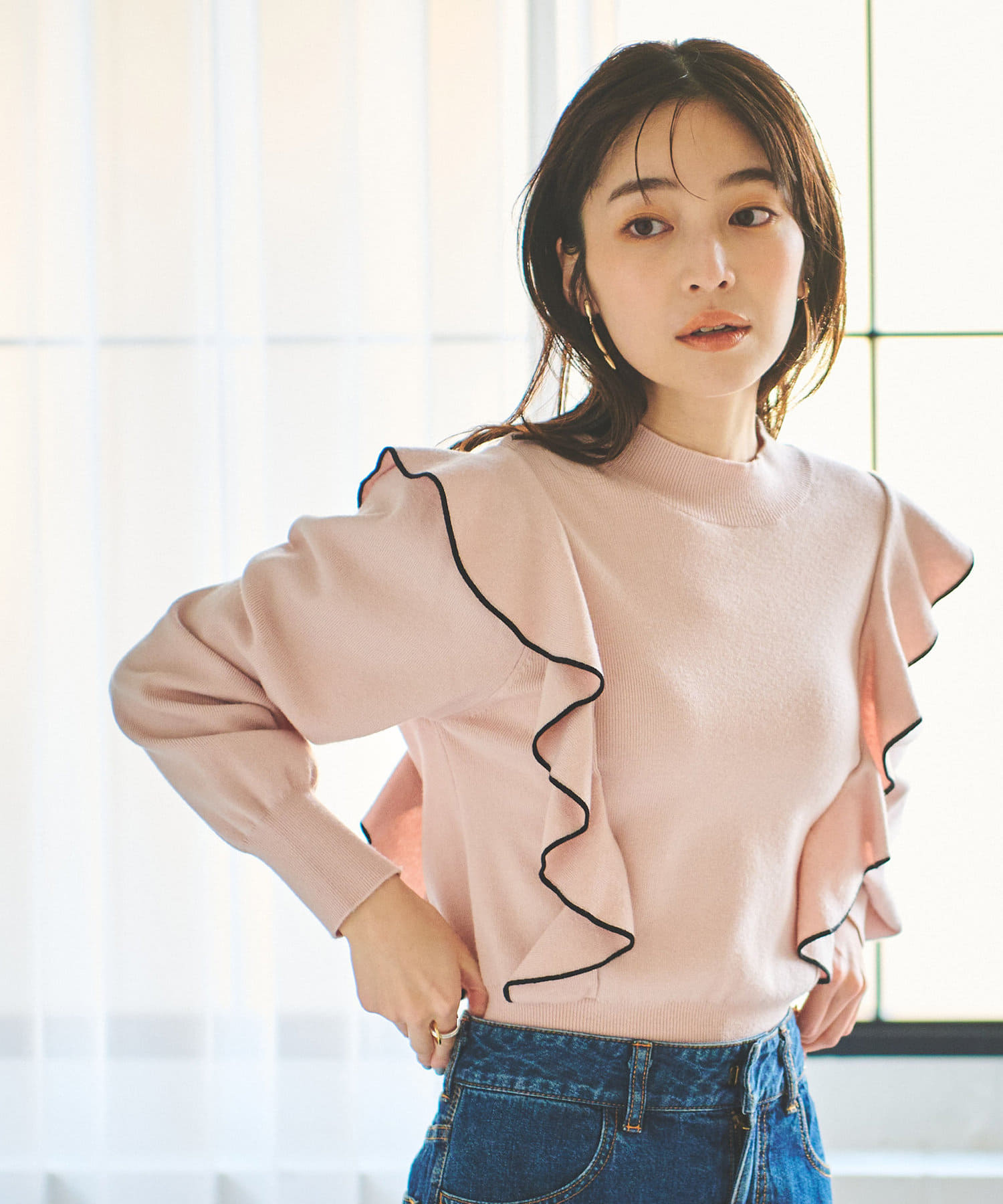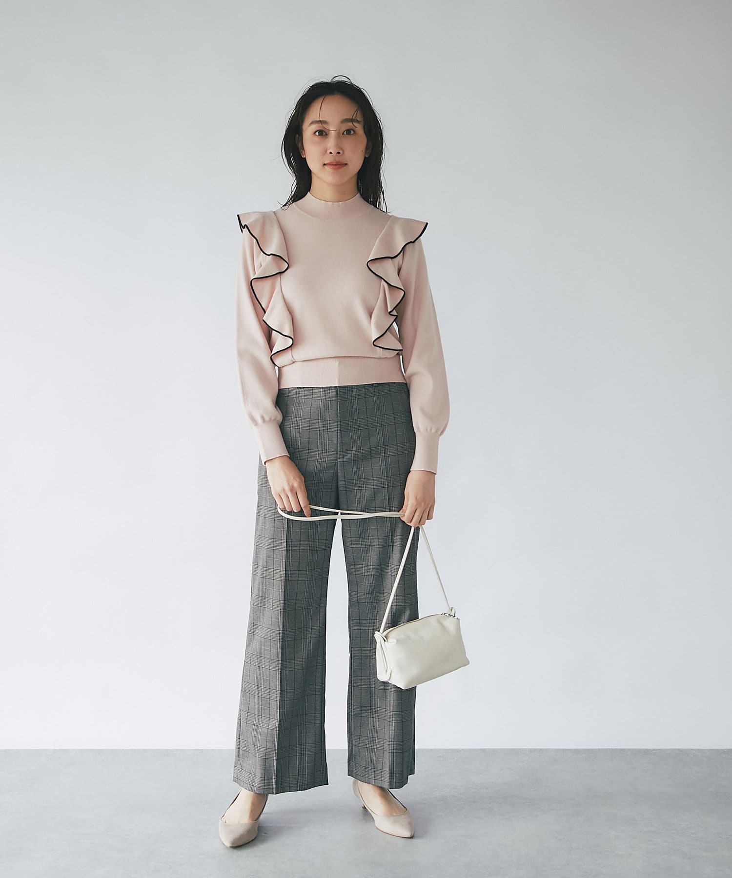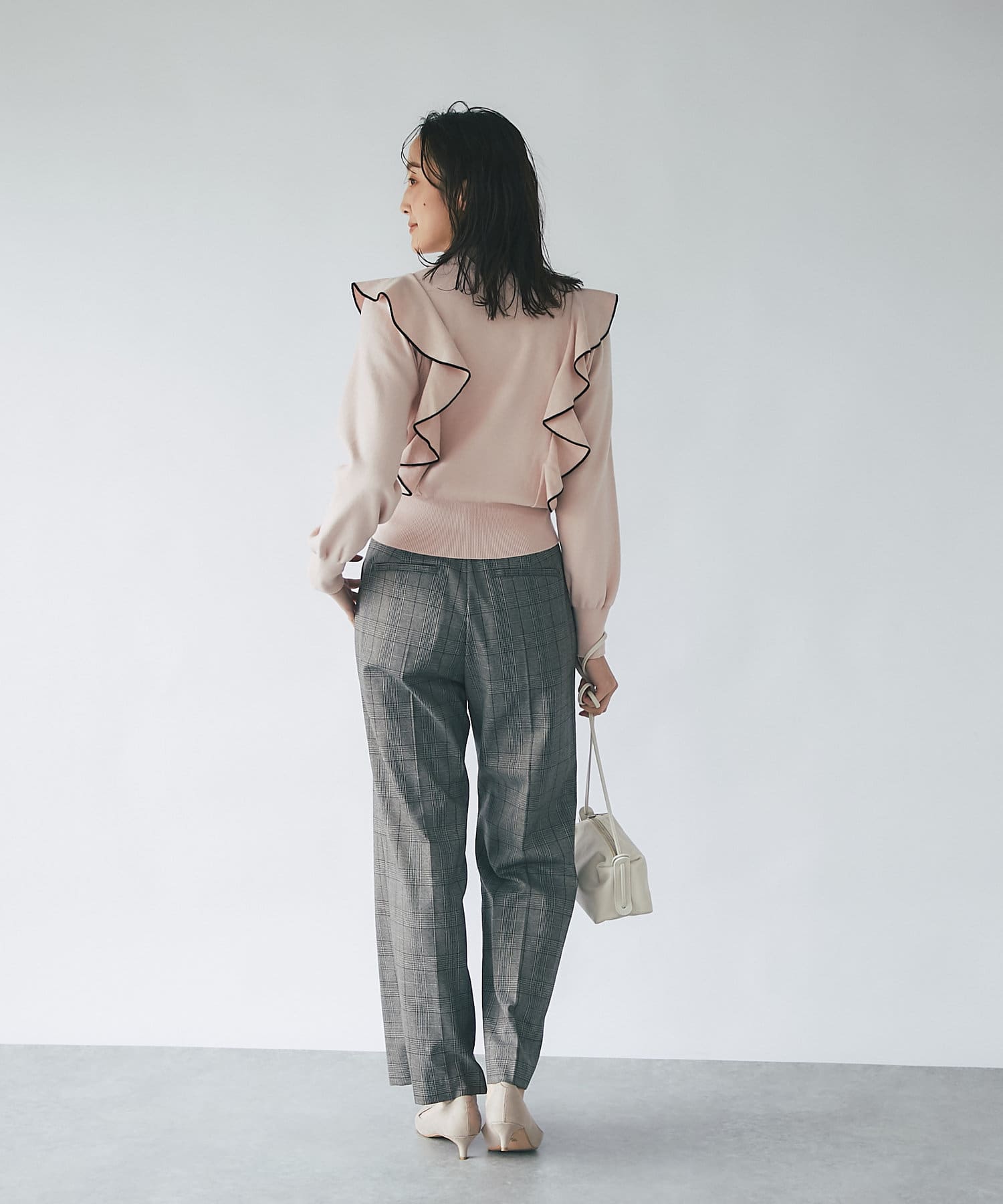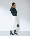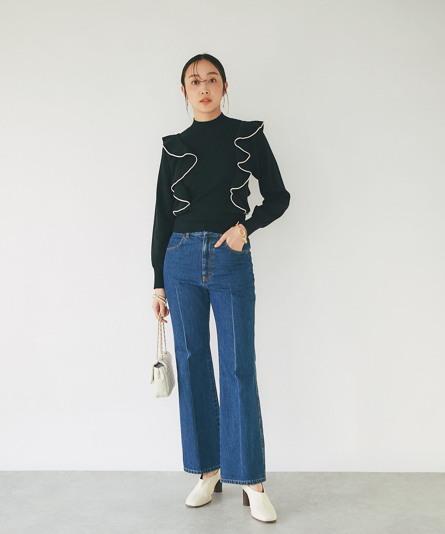 肩に入ったフリルがポイントのニットは大人フェミニンなモノトーンコーデアイテムです。