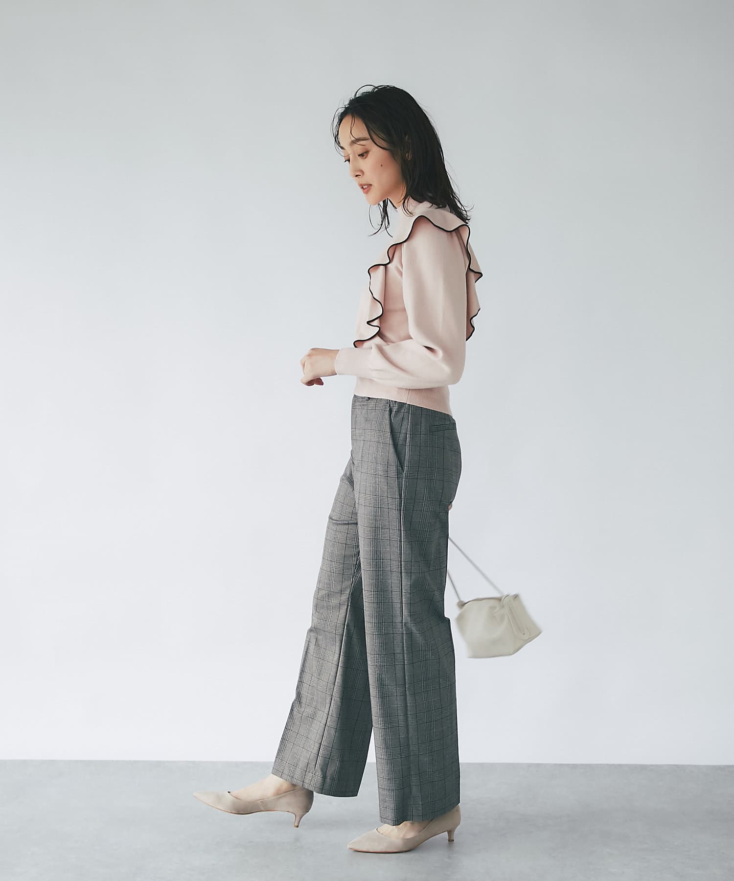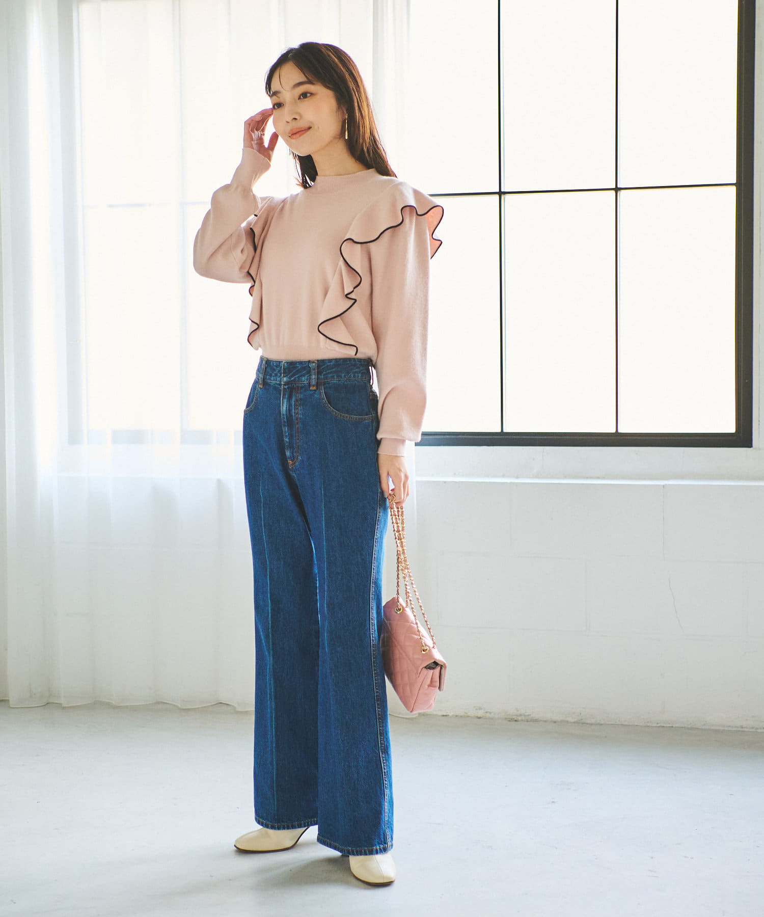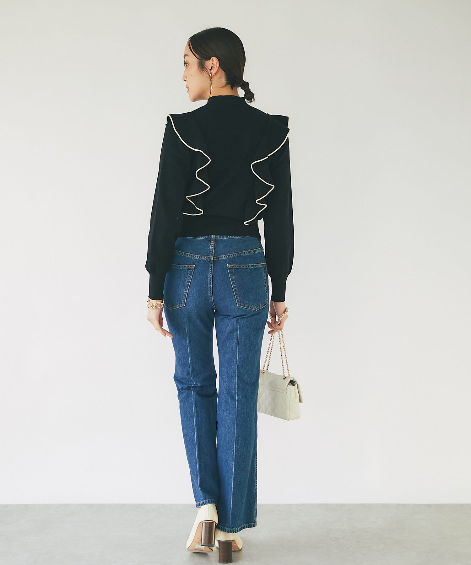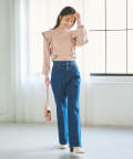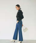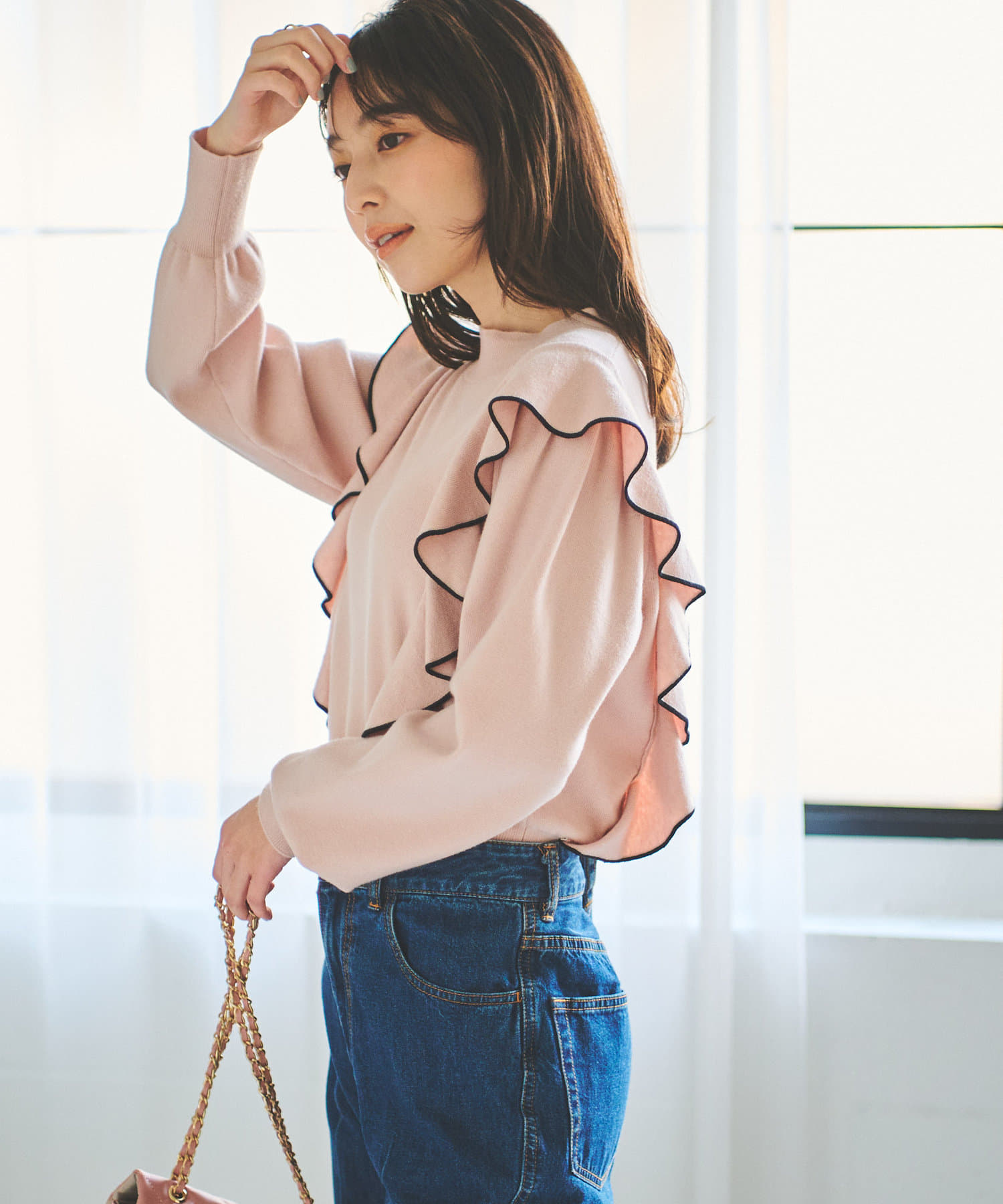 肩に入ったフリルがポイントのニットは大人フェミニンなモノトーンコーデアイテムです。