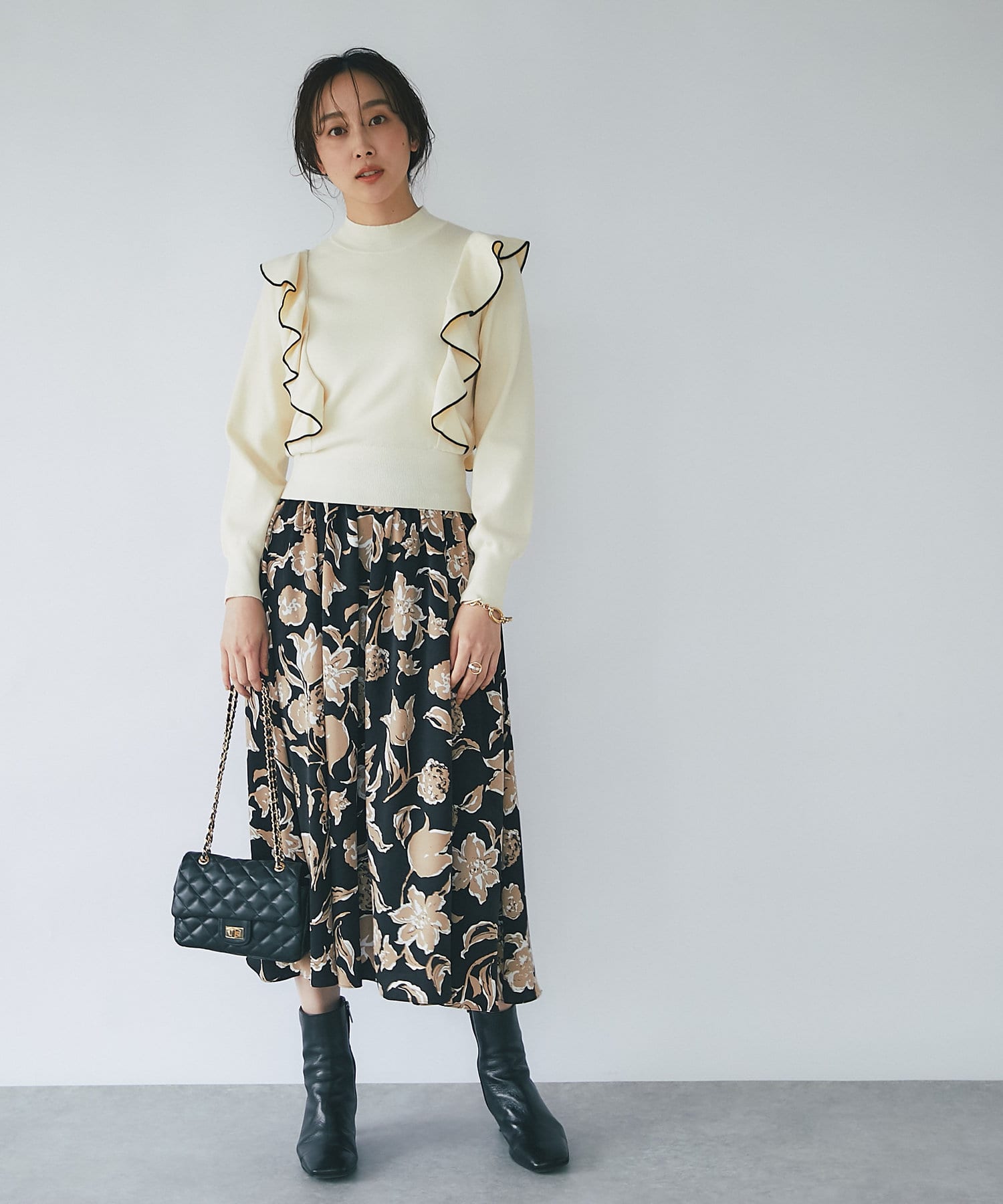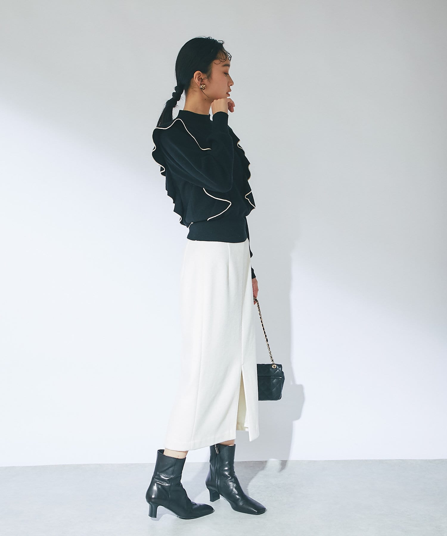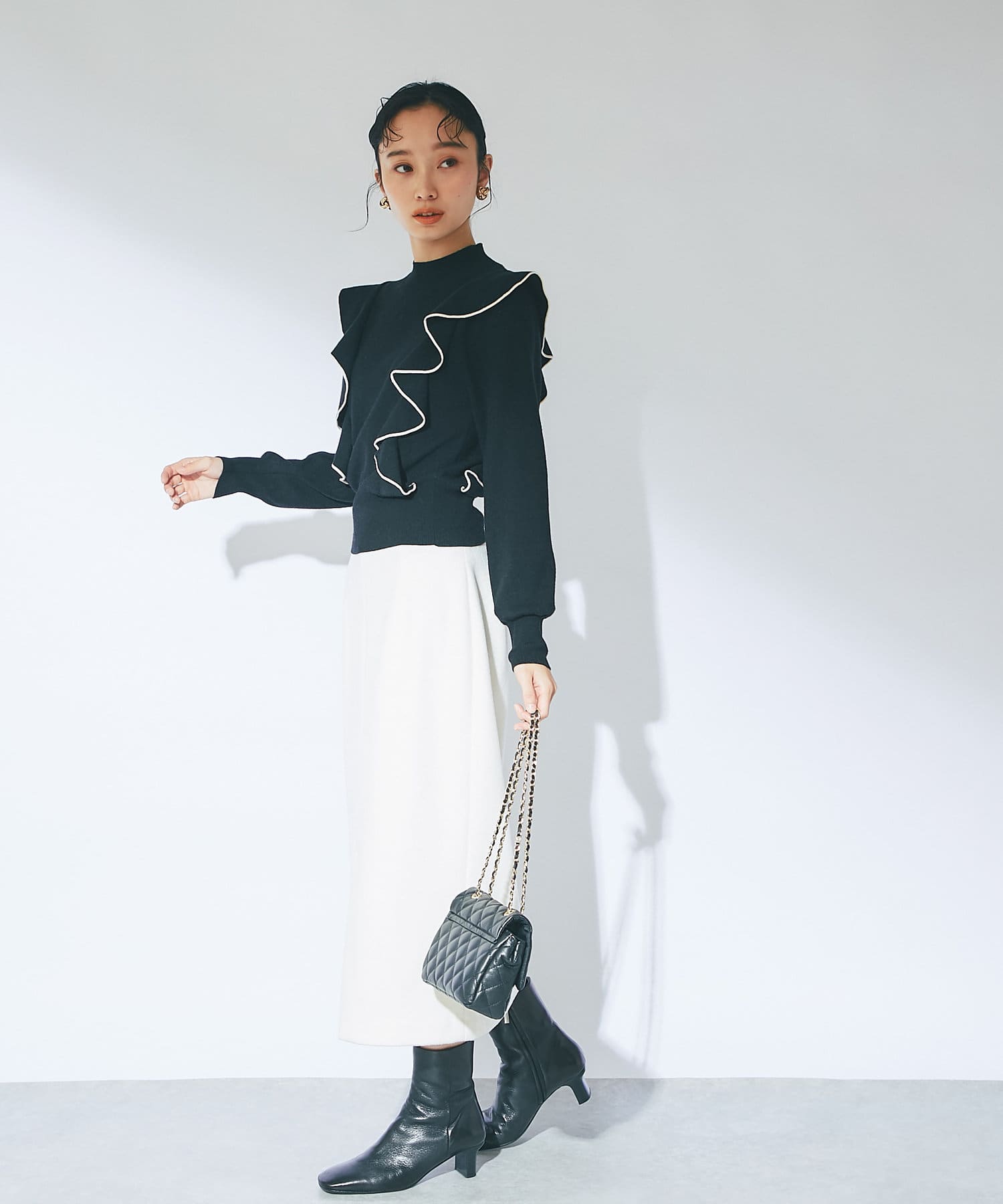 • モノトーンで合わせるとラッフルも甘過ぎずクールな印象に。