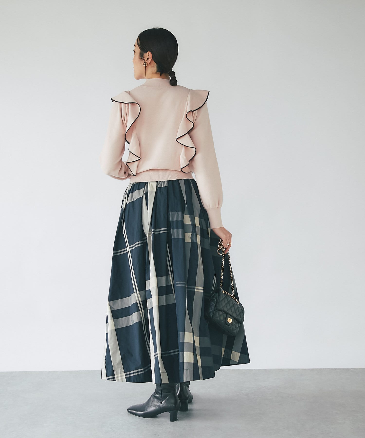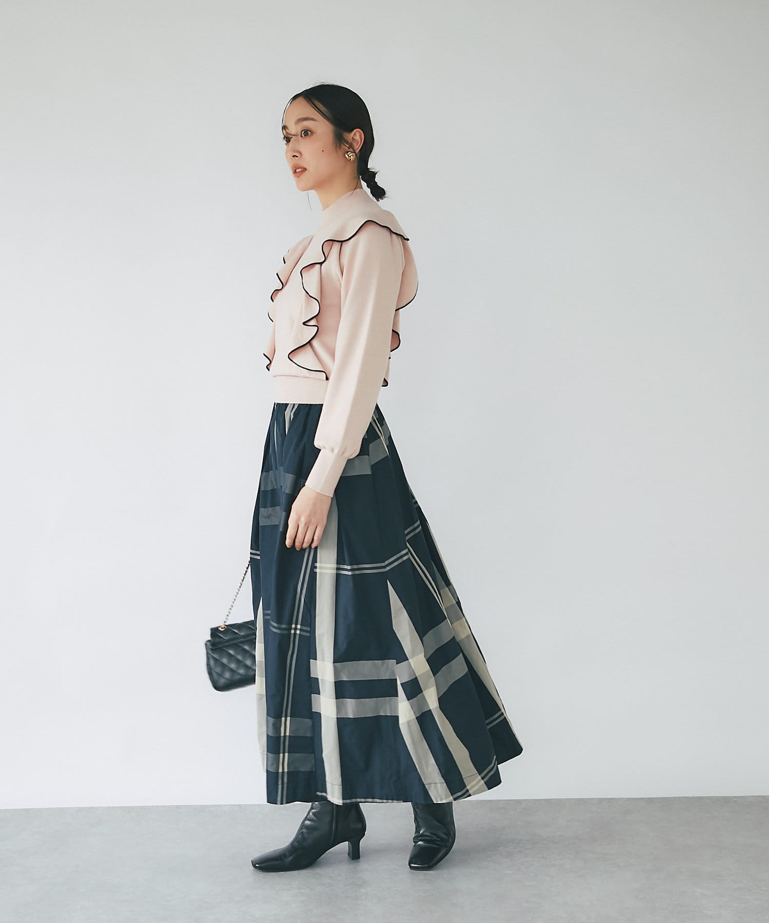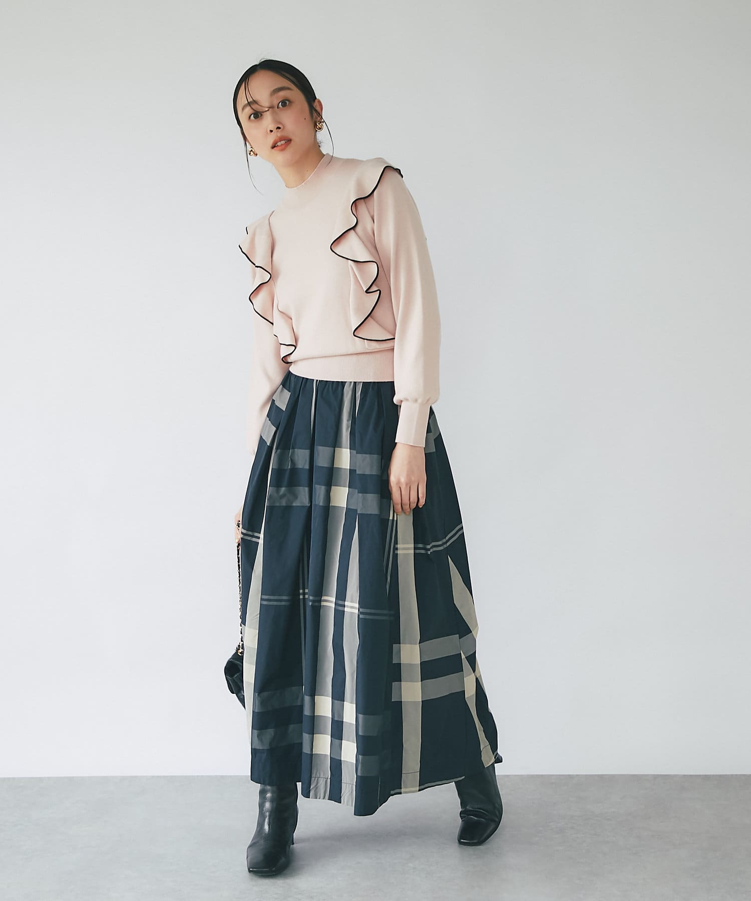 • モノトーンで合わせるとラッフルも甘過ぎずクールな印象に。