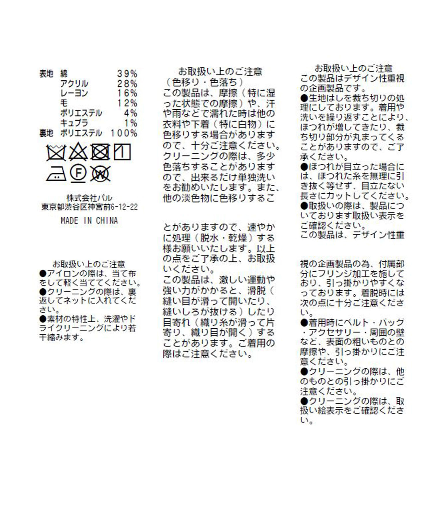品番 LBZ1031101A0002 素材 表地:綿39% アクリル28% レーヨン16% 毛12% ポリエステル4% キュプラ1%