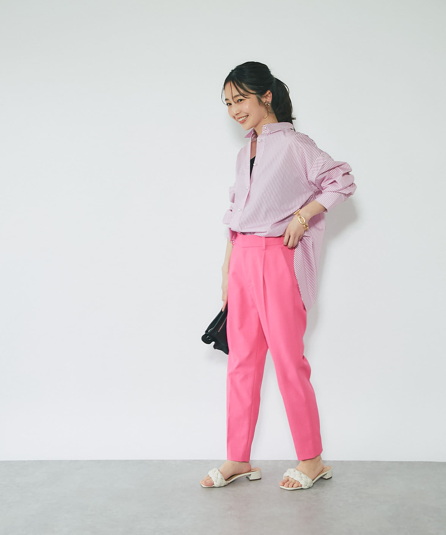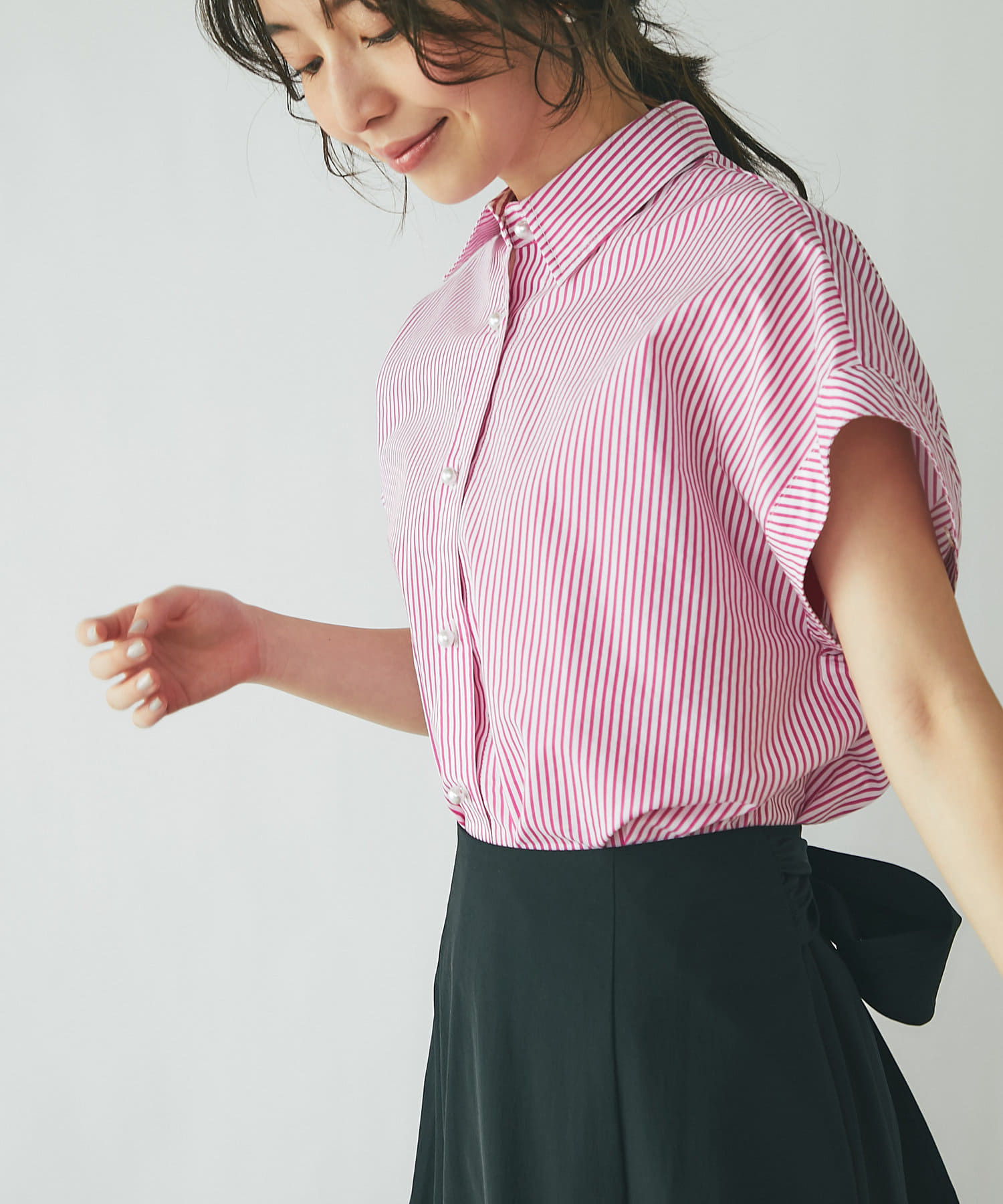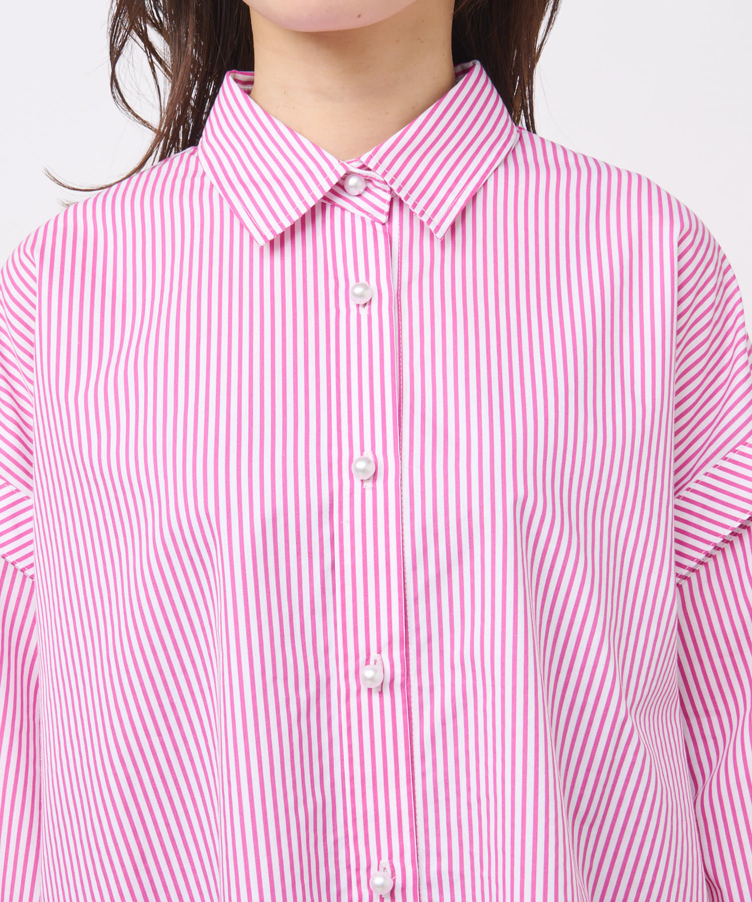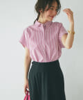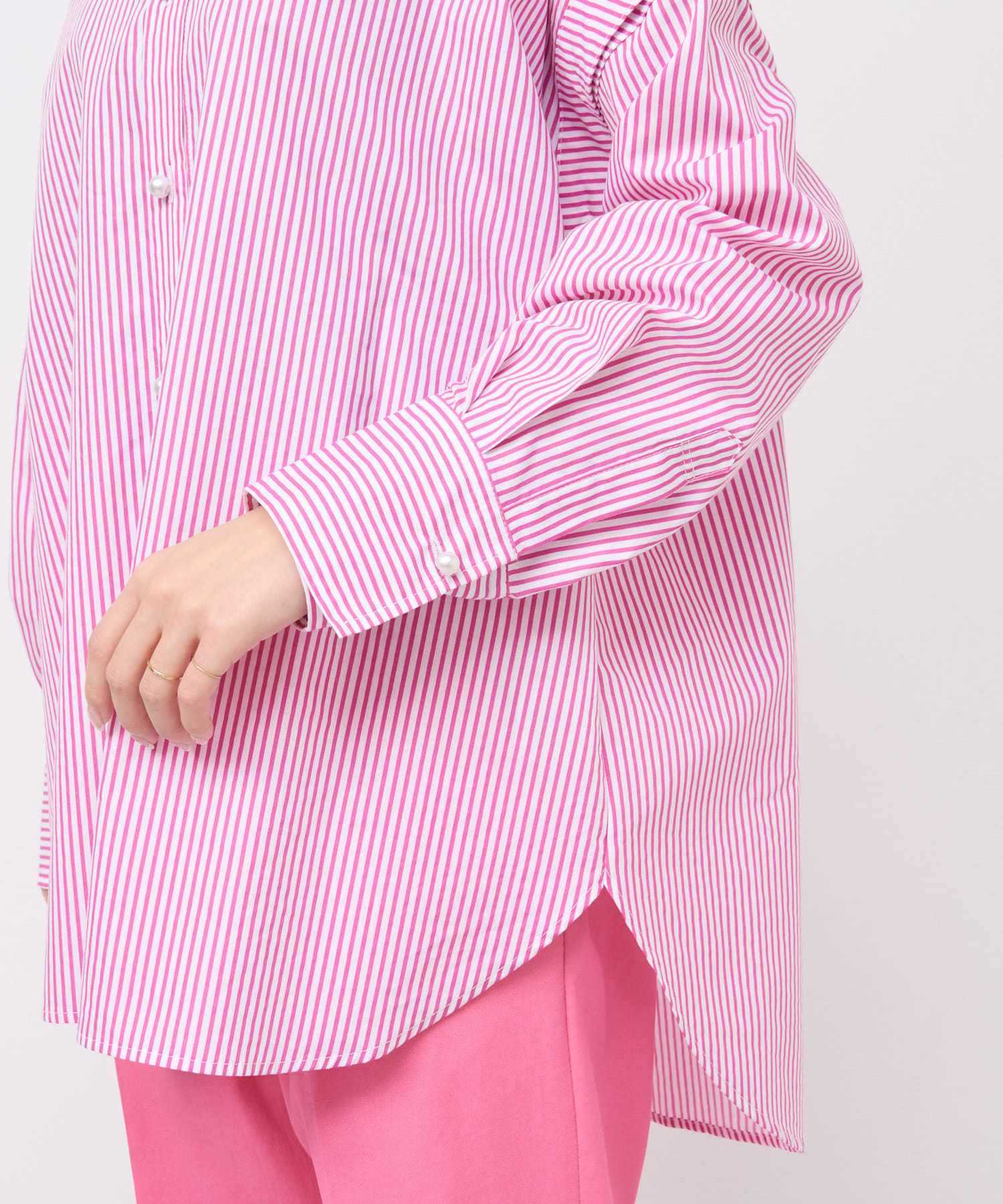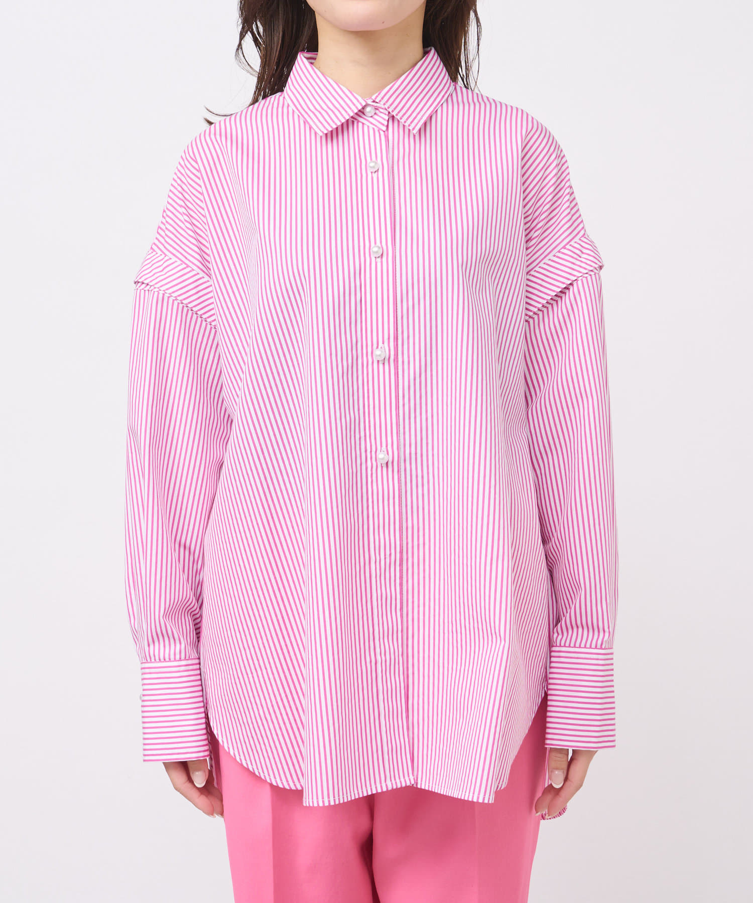 #大人カジュアル #きれいめカジュアル #上品カジュアル #上品 #パール #パールボタン #シャツ #上品シャツ #ピンク #ストライプ #総柄 #3WAY