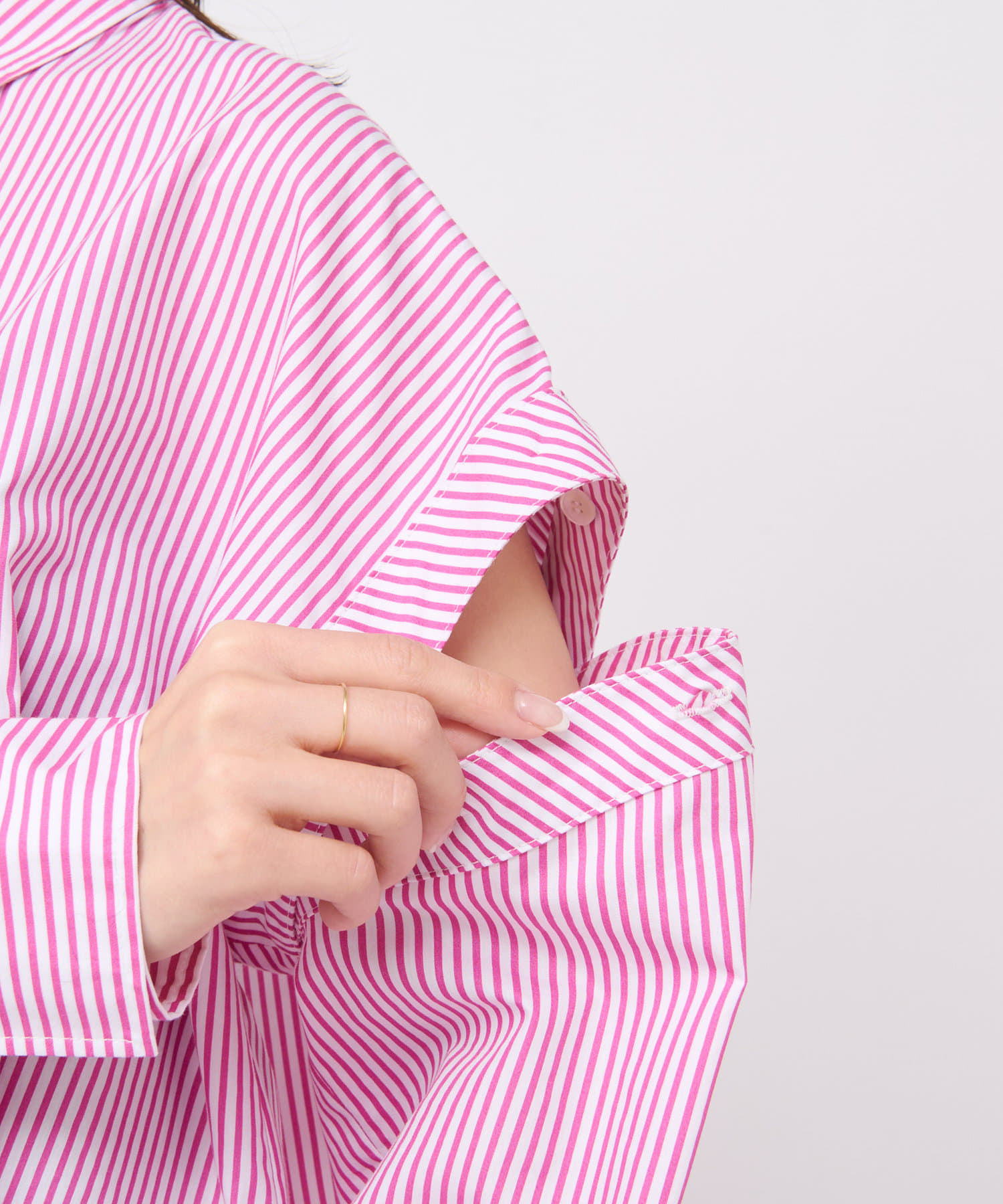 袖のボタンをはずして、オープンショルダーやノースリーブにできる3WAYデザインです。