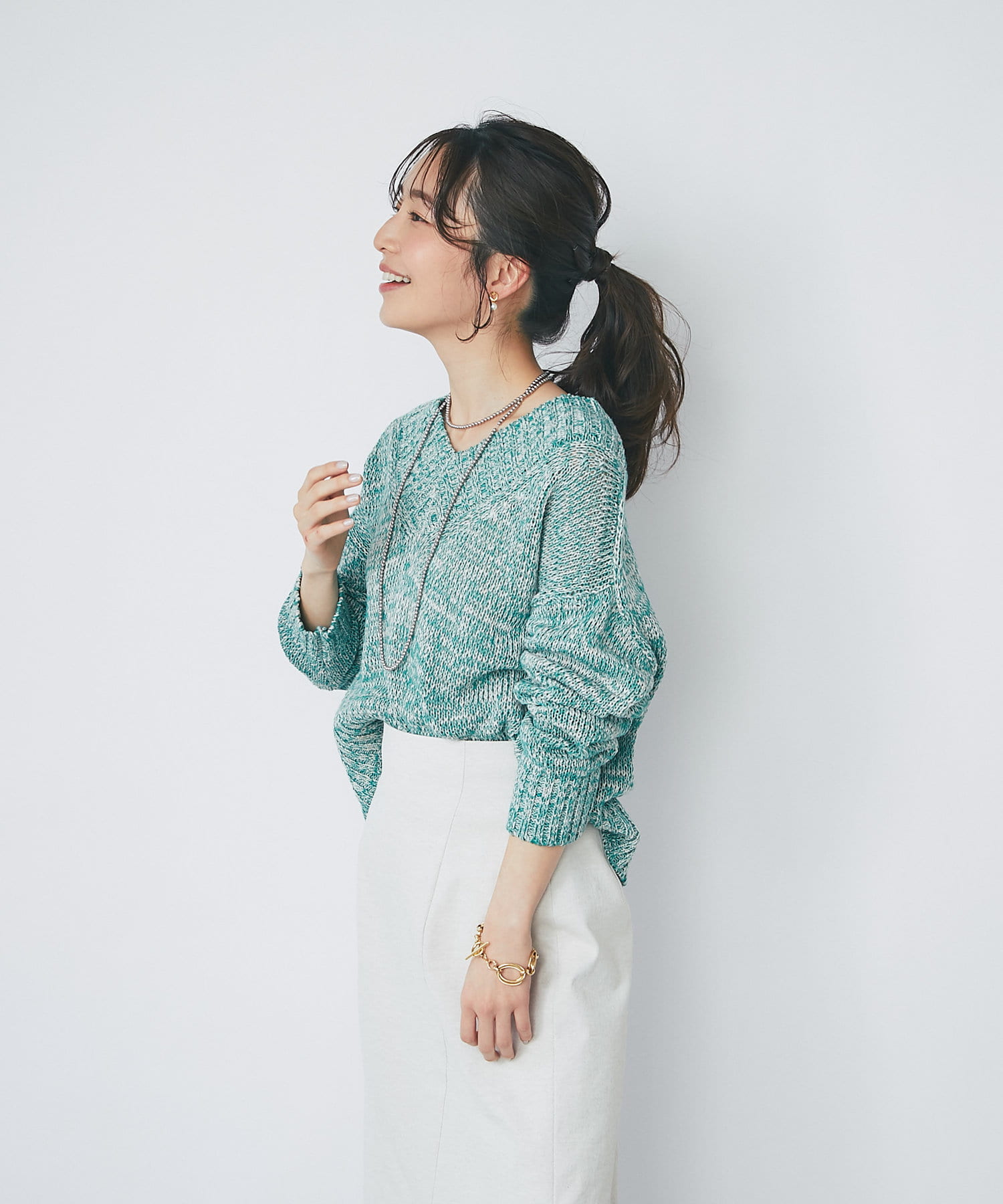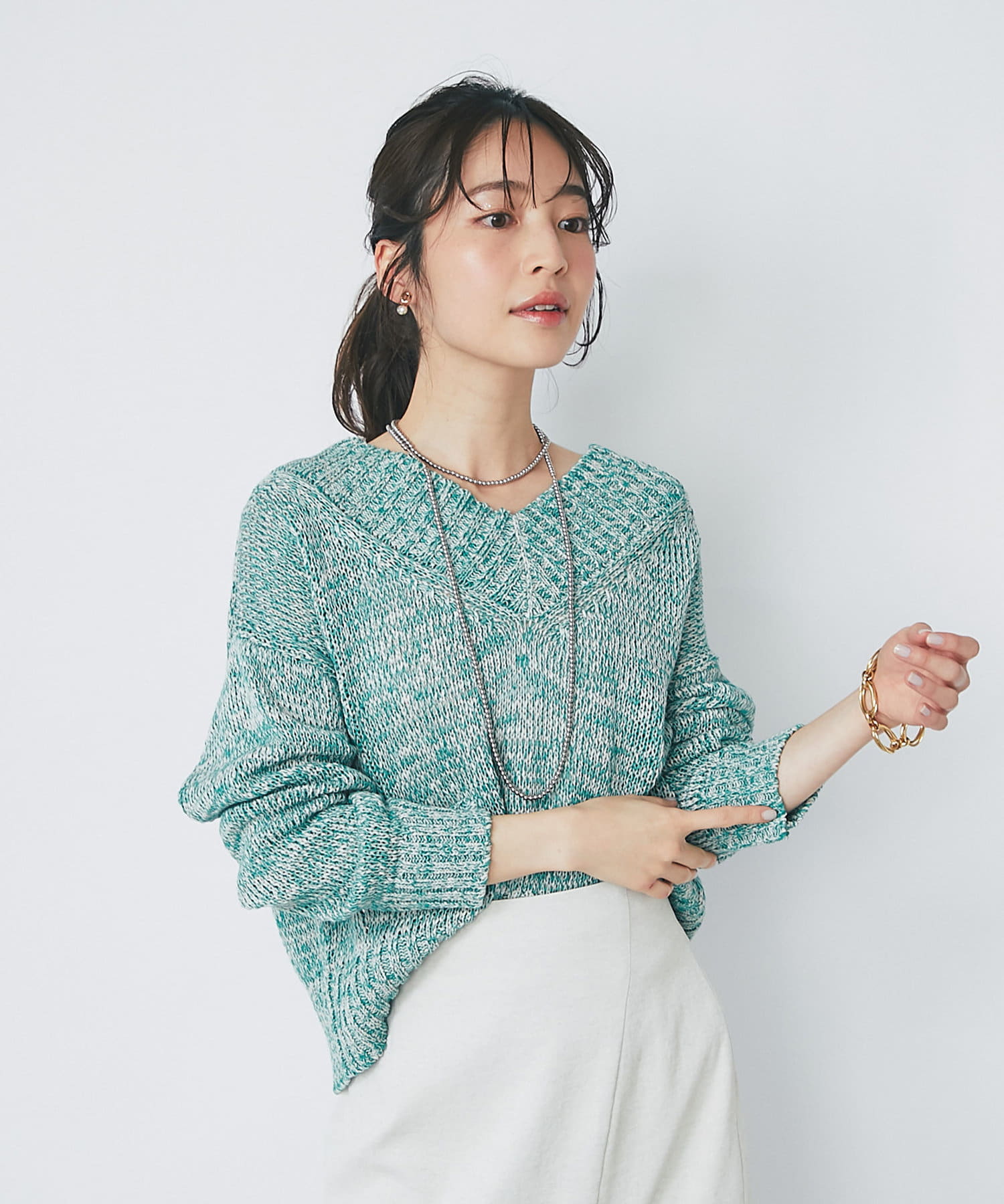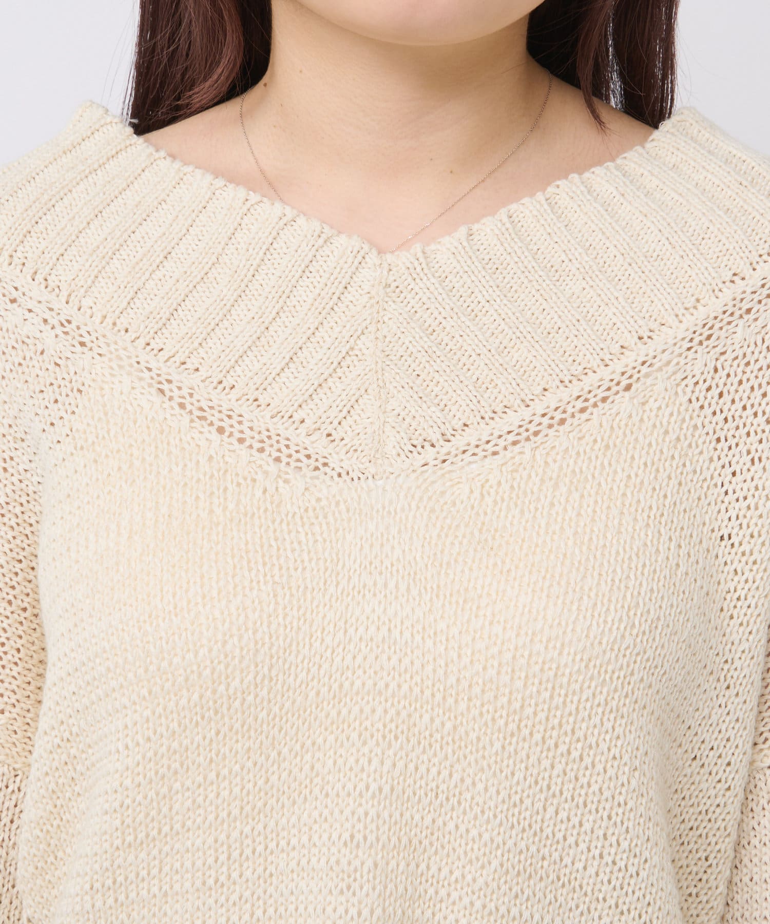 デコルテを美しく見せる、浅めVネックのデザインニット。