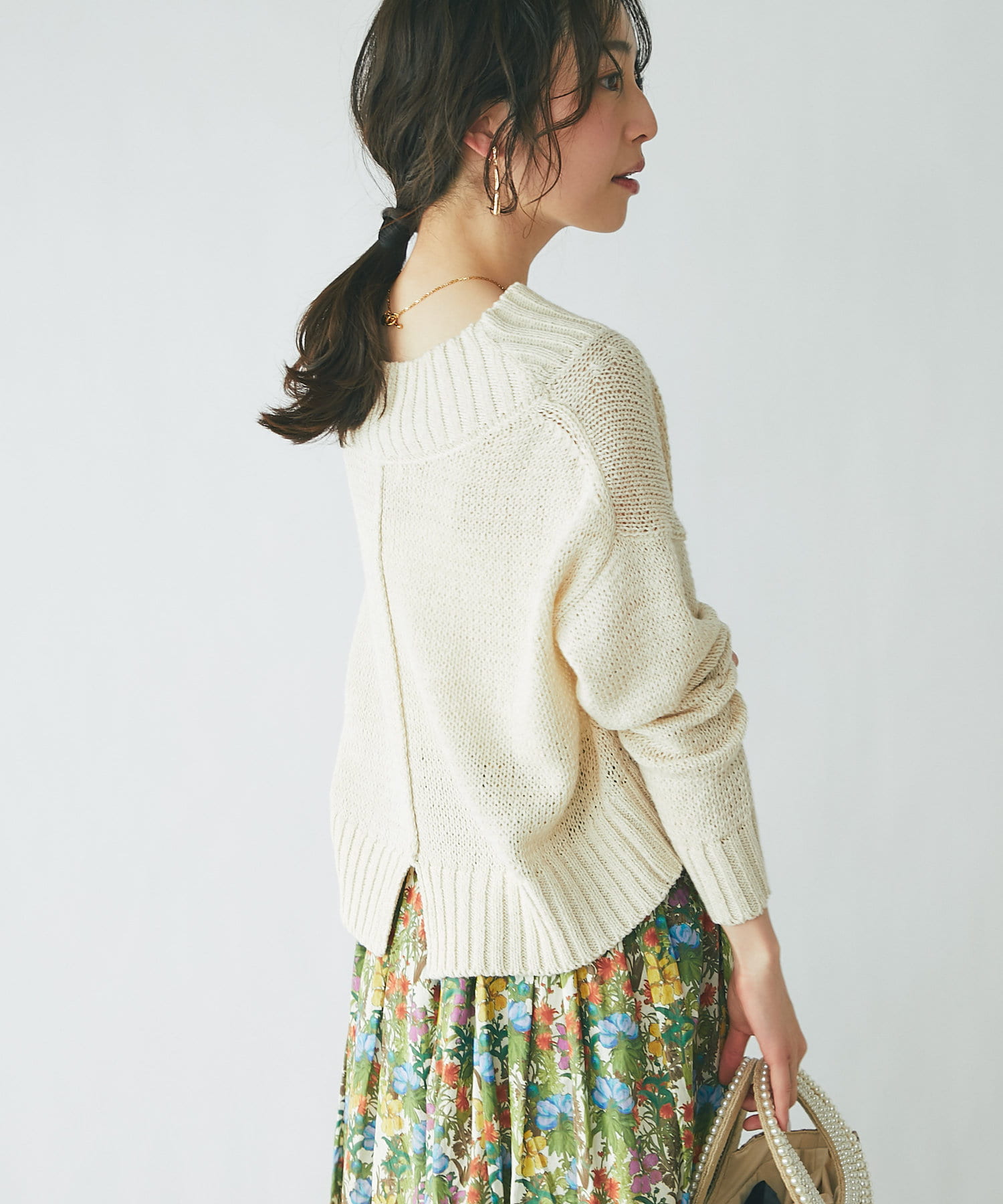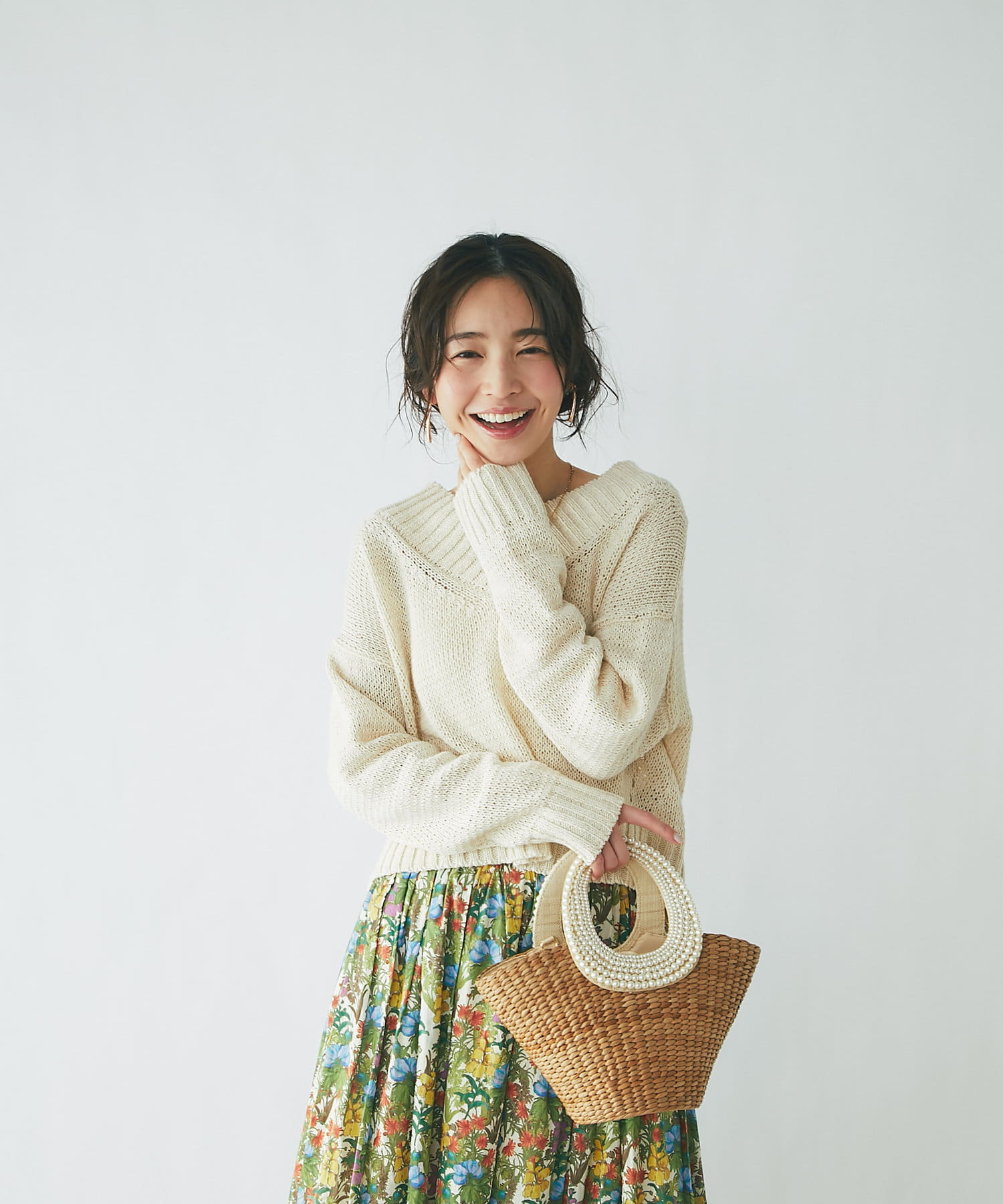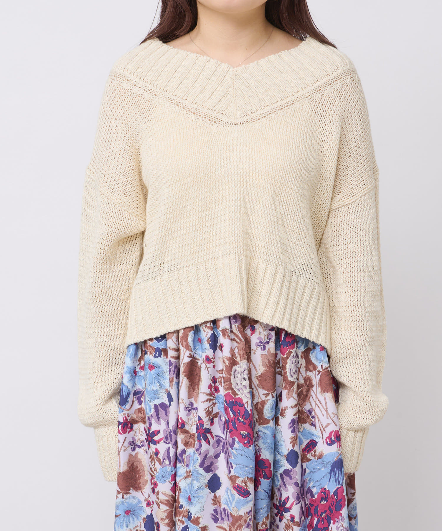 デコルテを美しく見せる、浅めVネックのデザインニット。