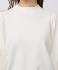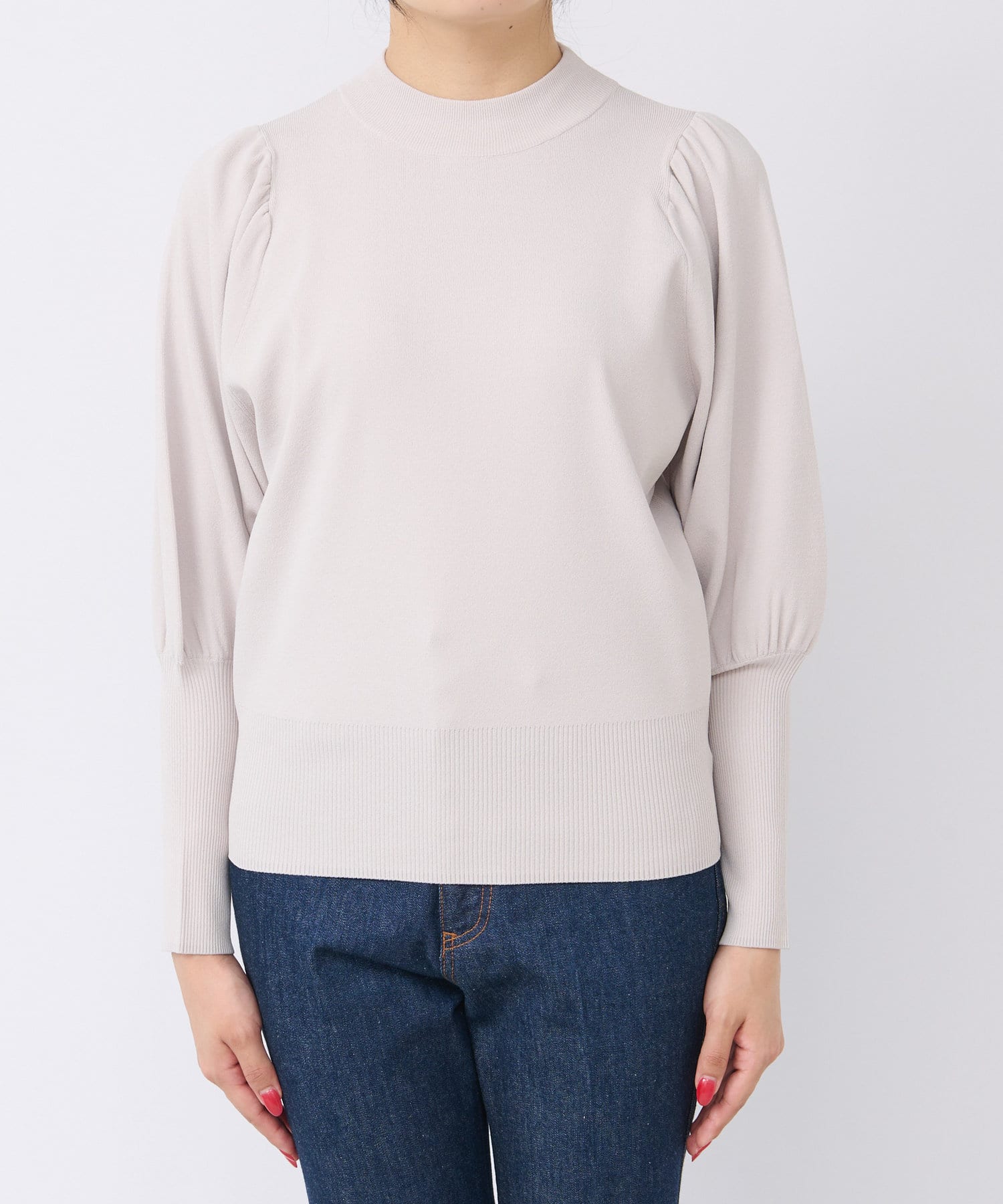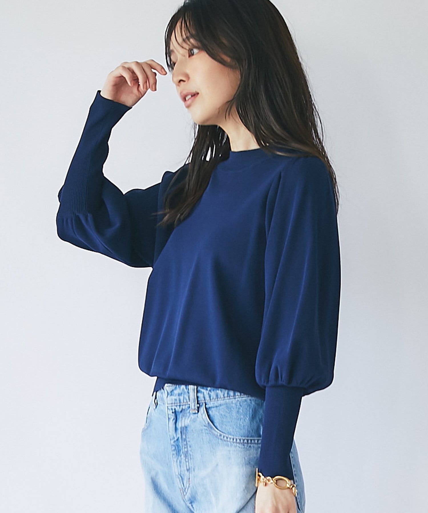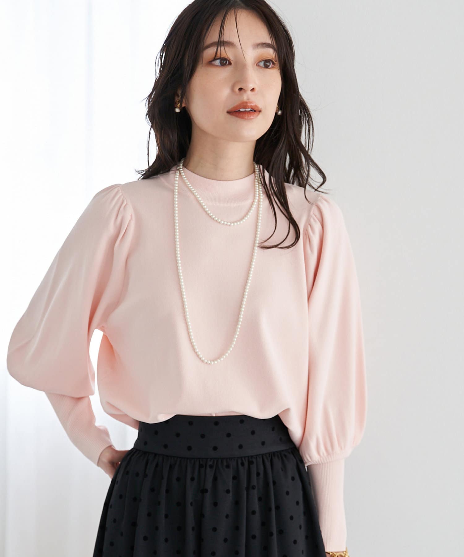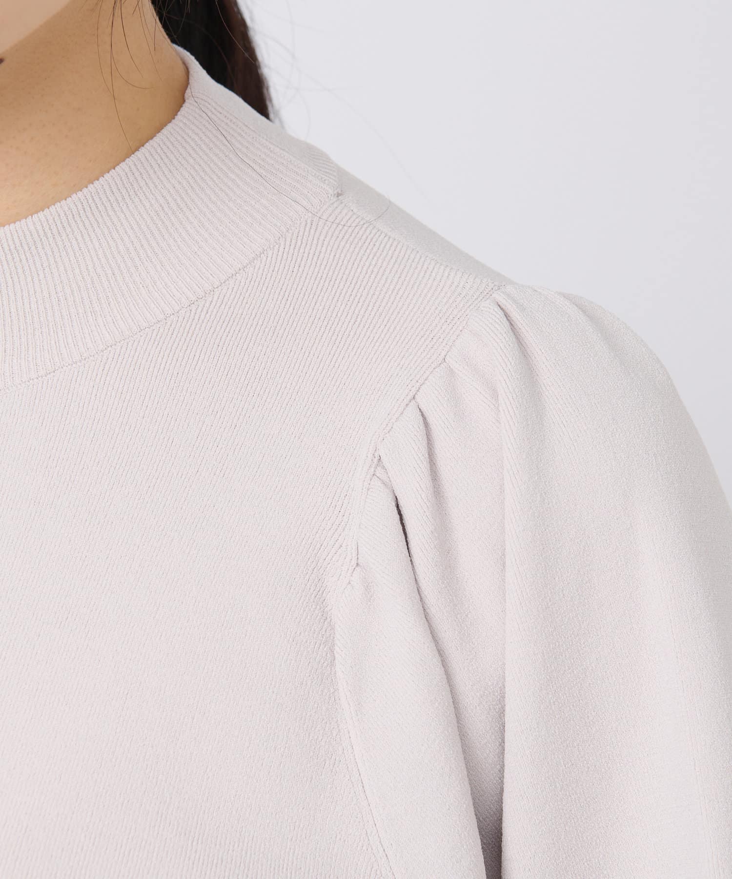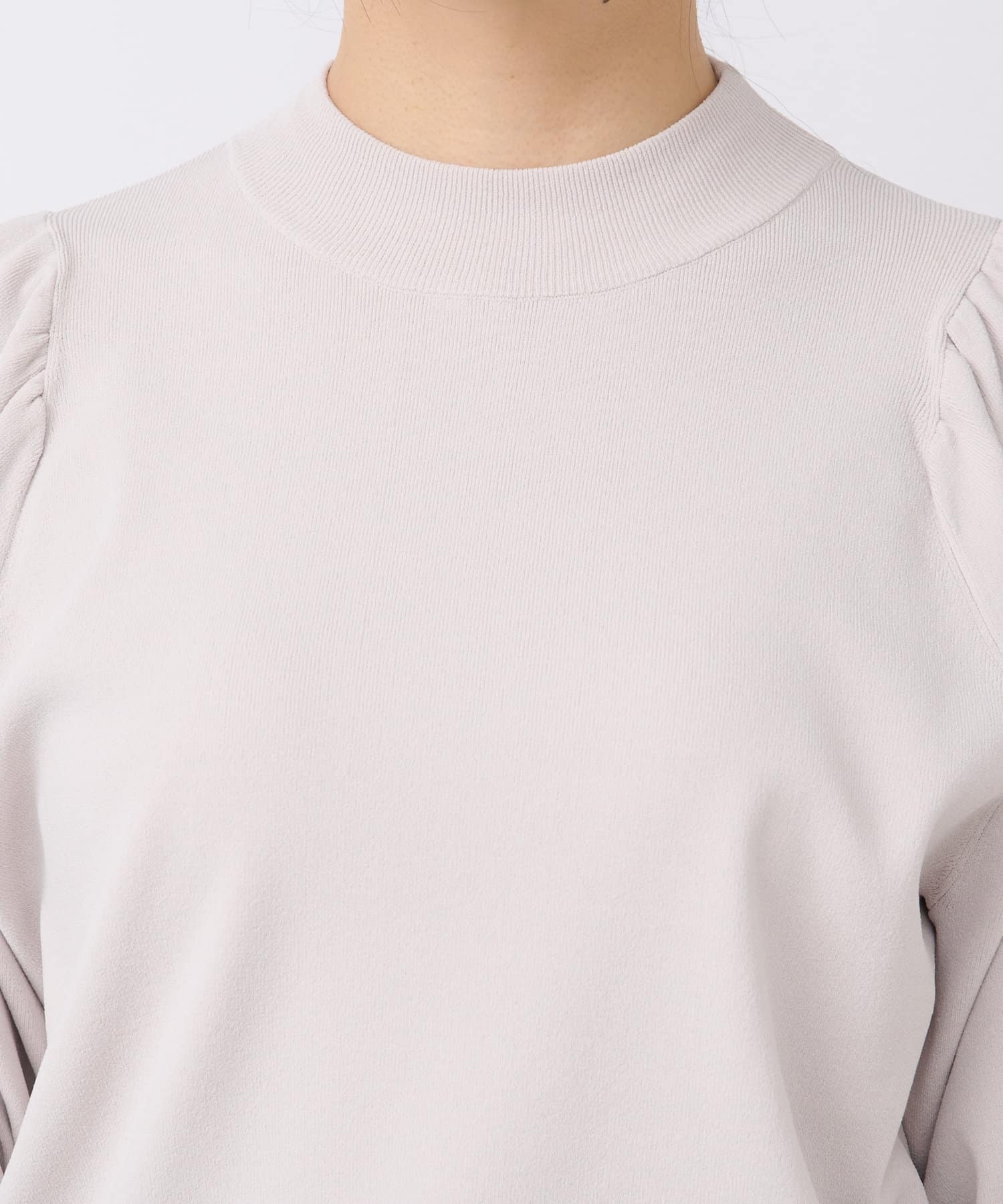 露出控えめなモックネックが着る人の美しさを引き立てる一枚。