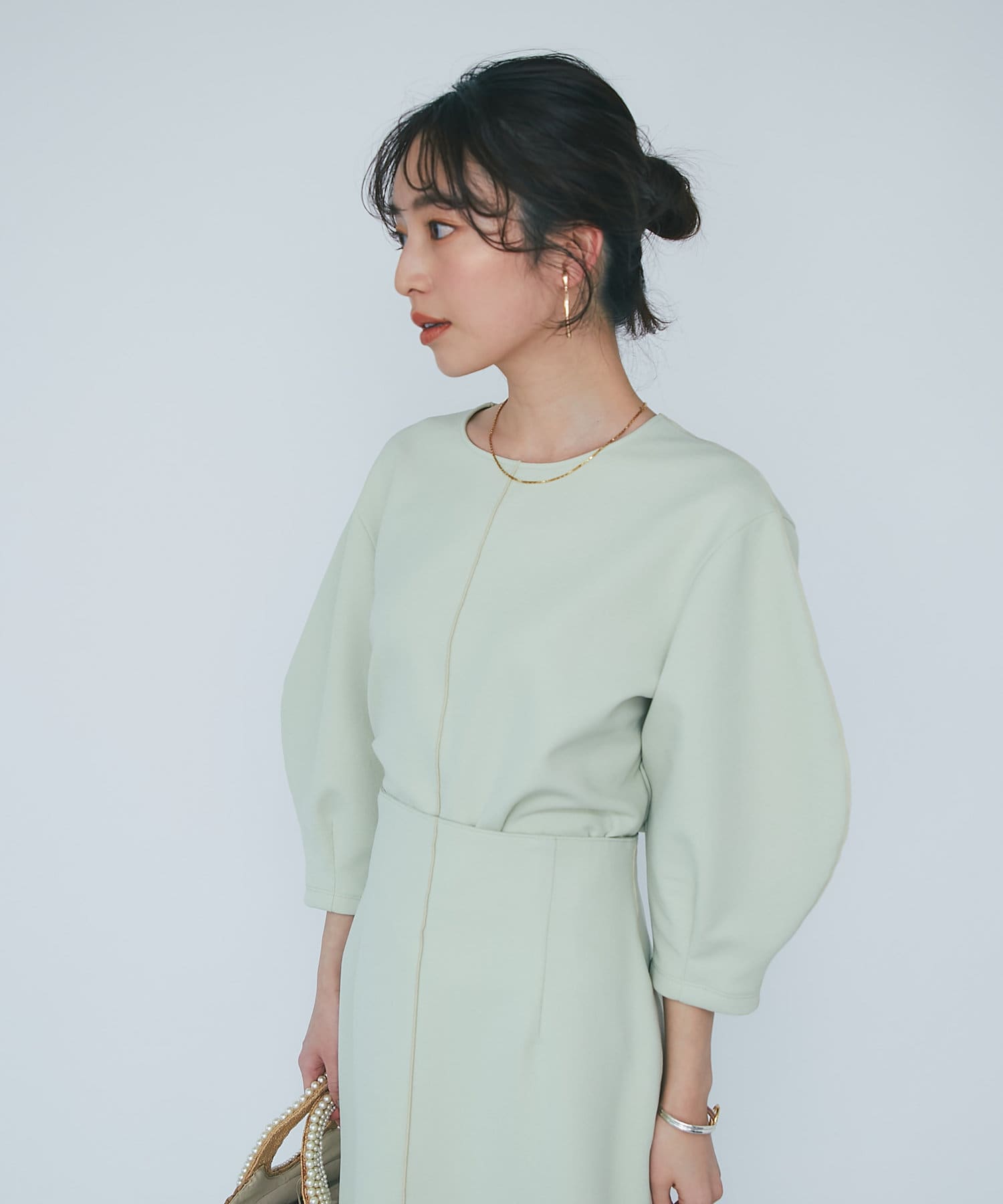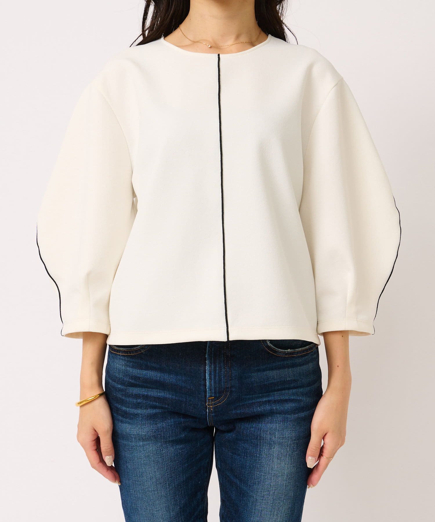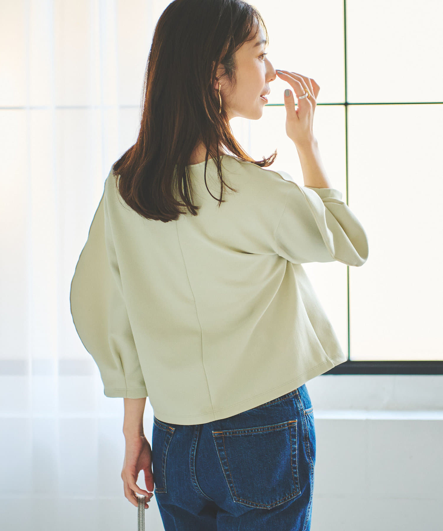 ランタンのような丸みのあるボリュームスリーブが目を引くカットソー。