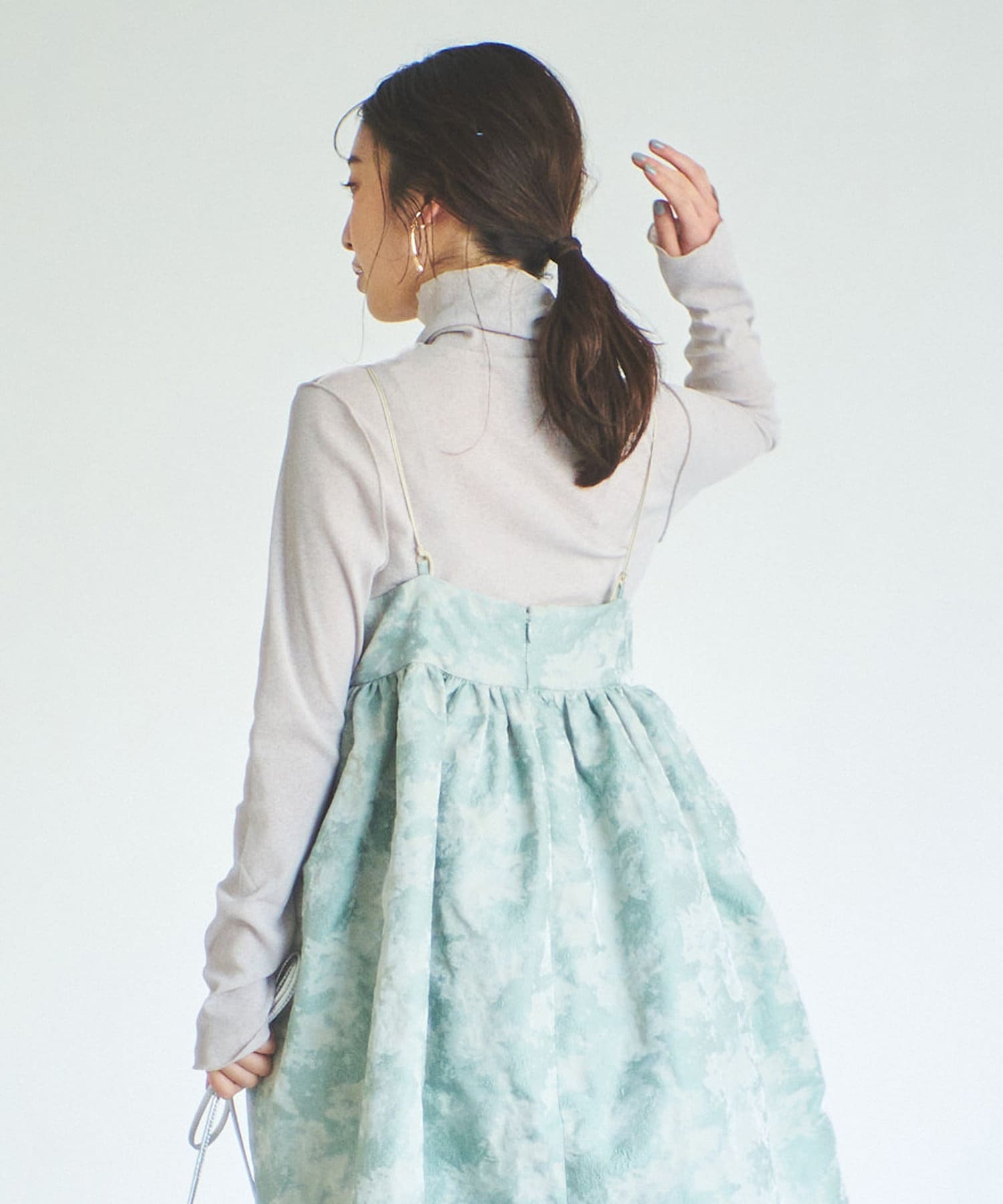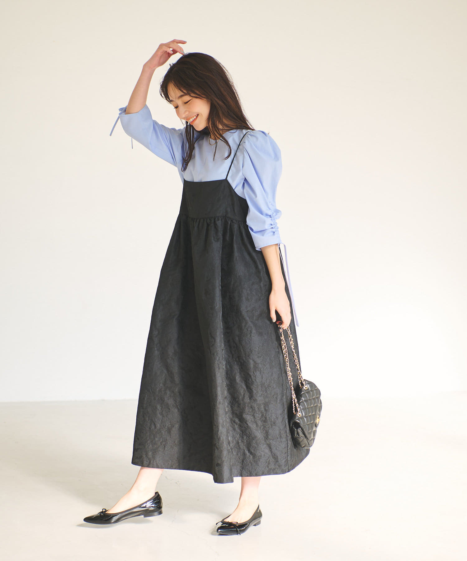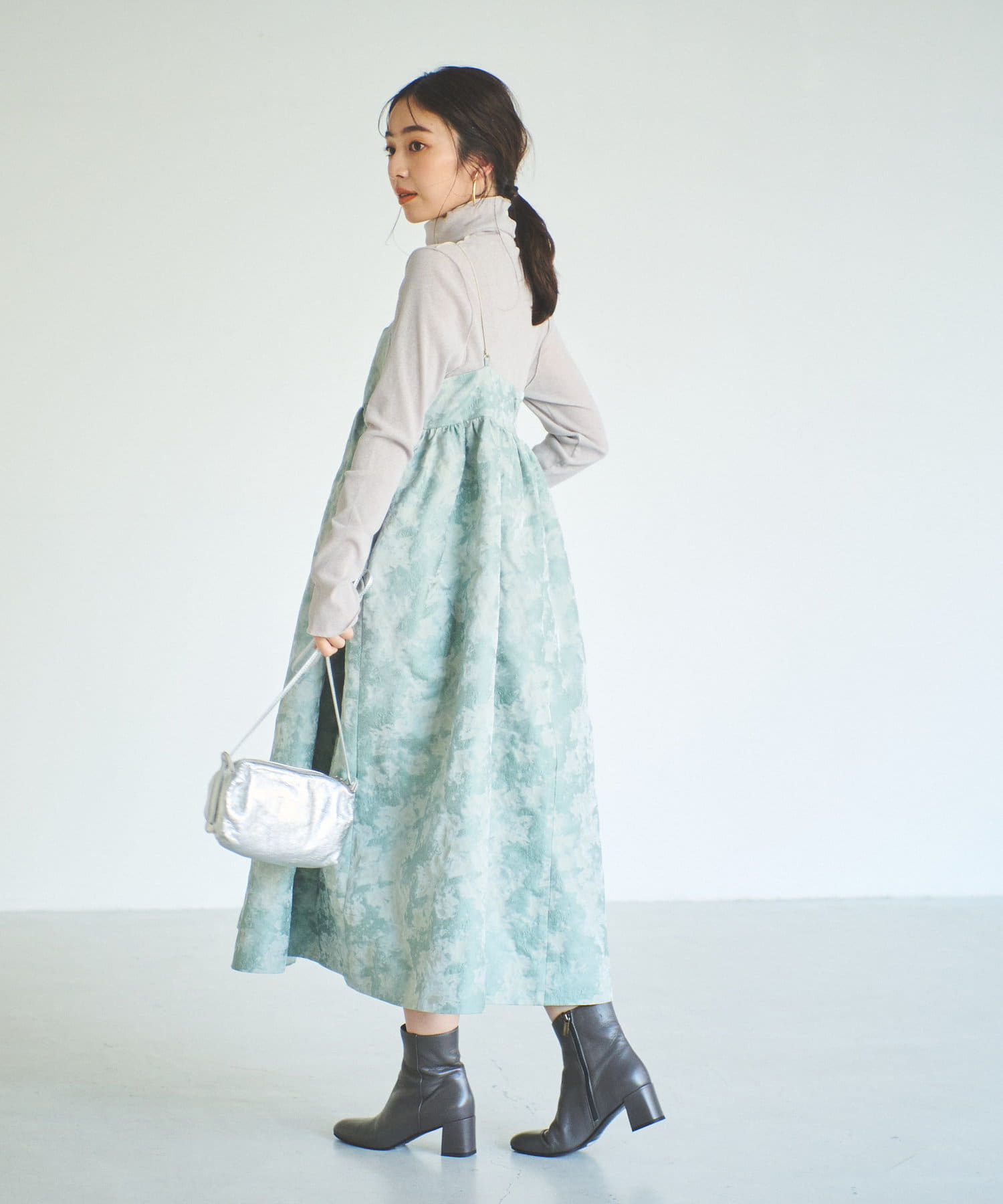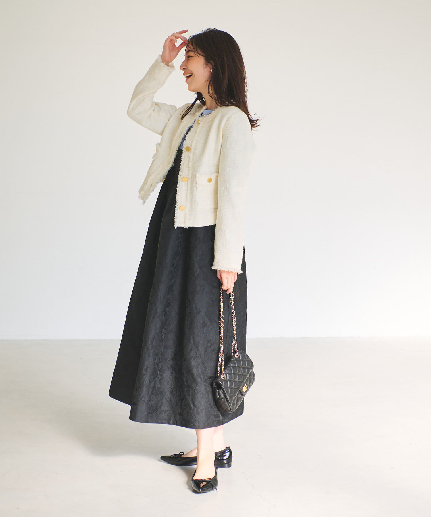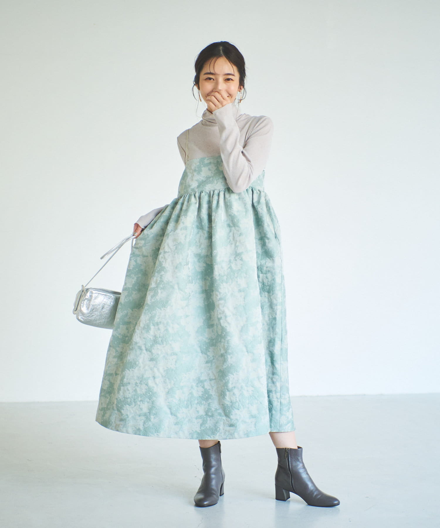 一枚で豪華なジャガードワンピースは、シンプルなトップスとのレイヤードがおすすめ。