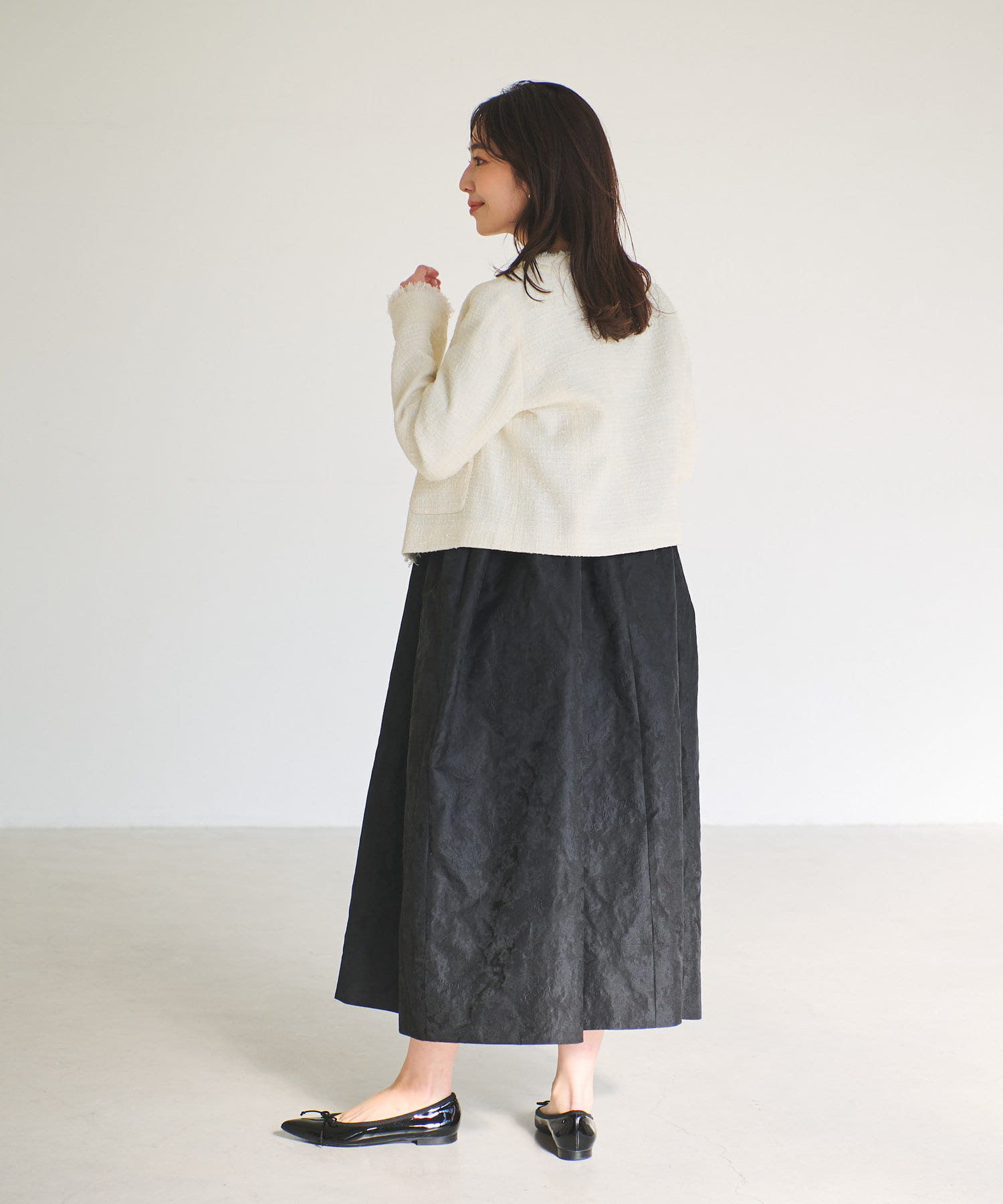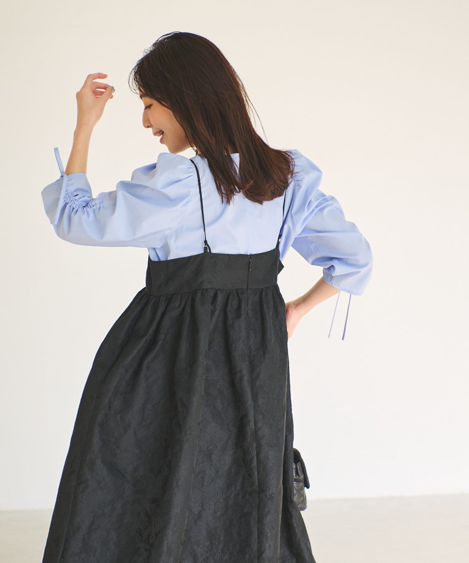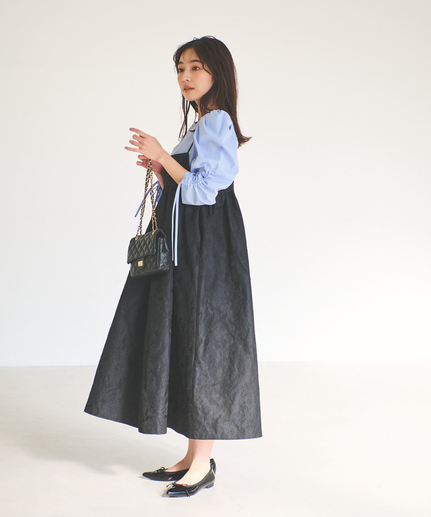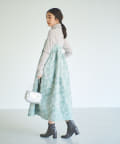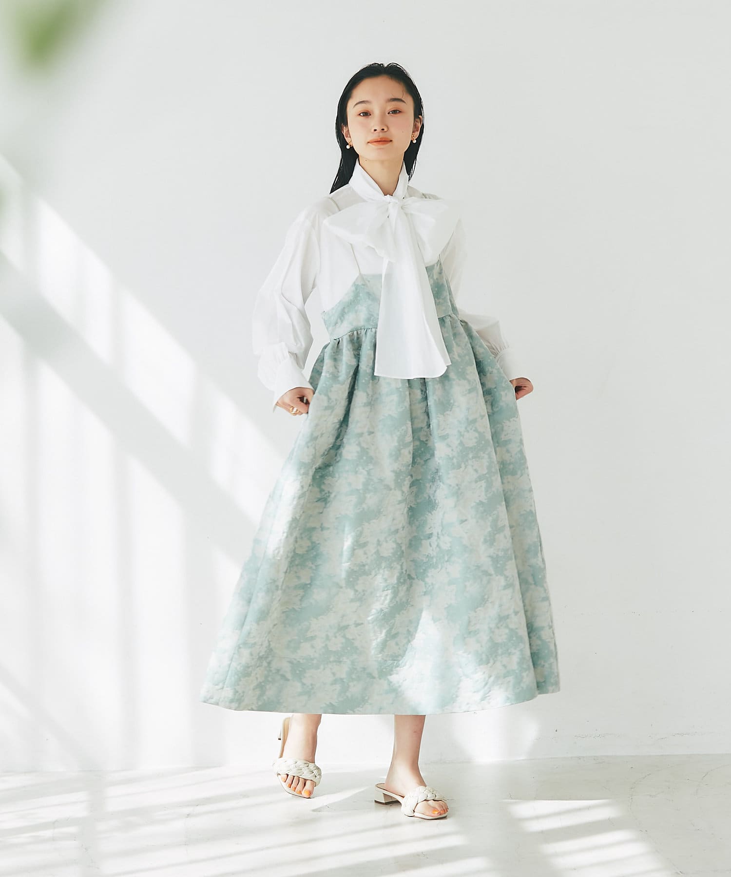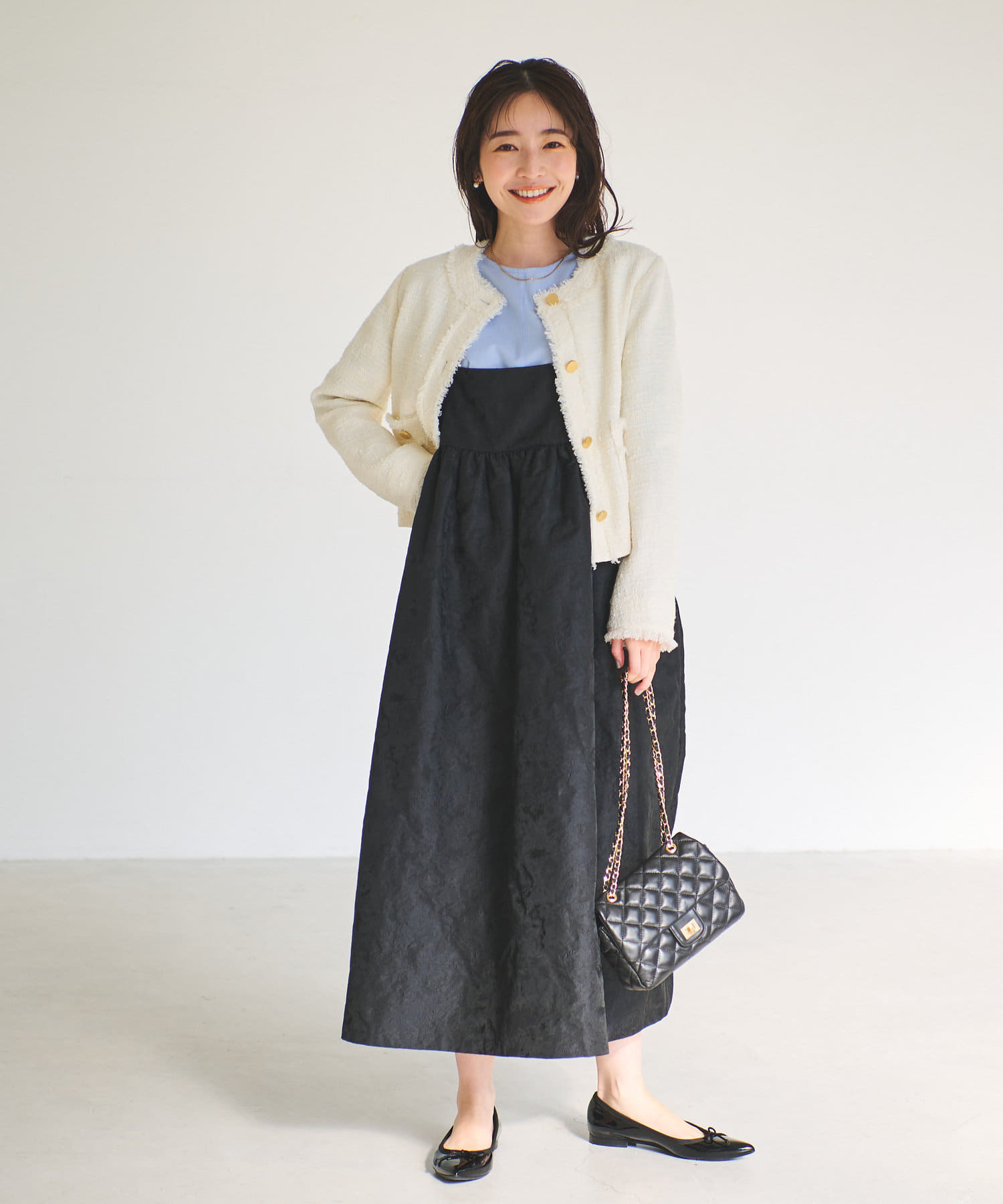 一枚で豪華なジャガードワンピースは、シンプルなトップスとのレイヤードがおすすめ。