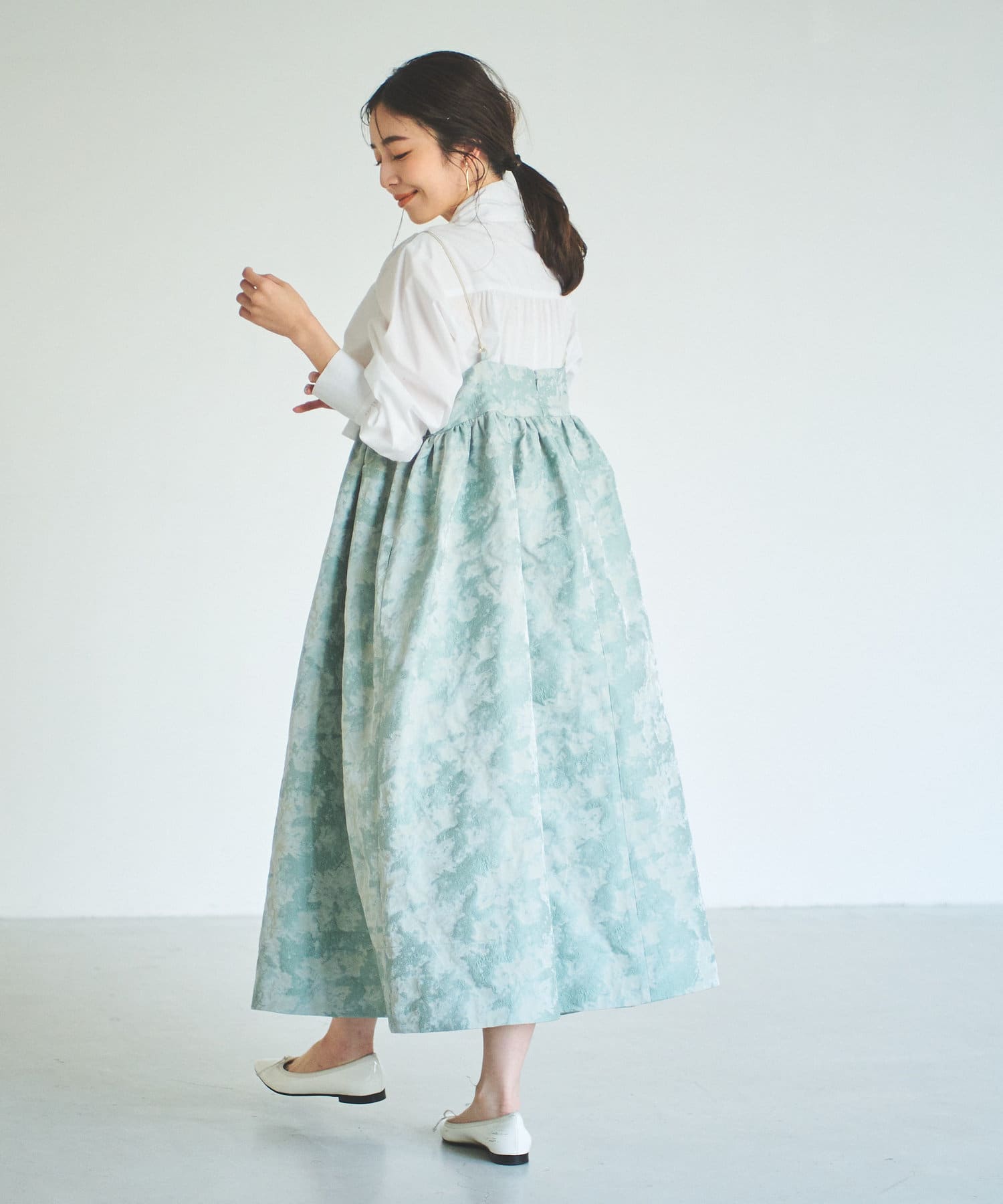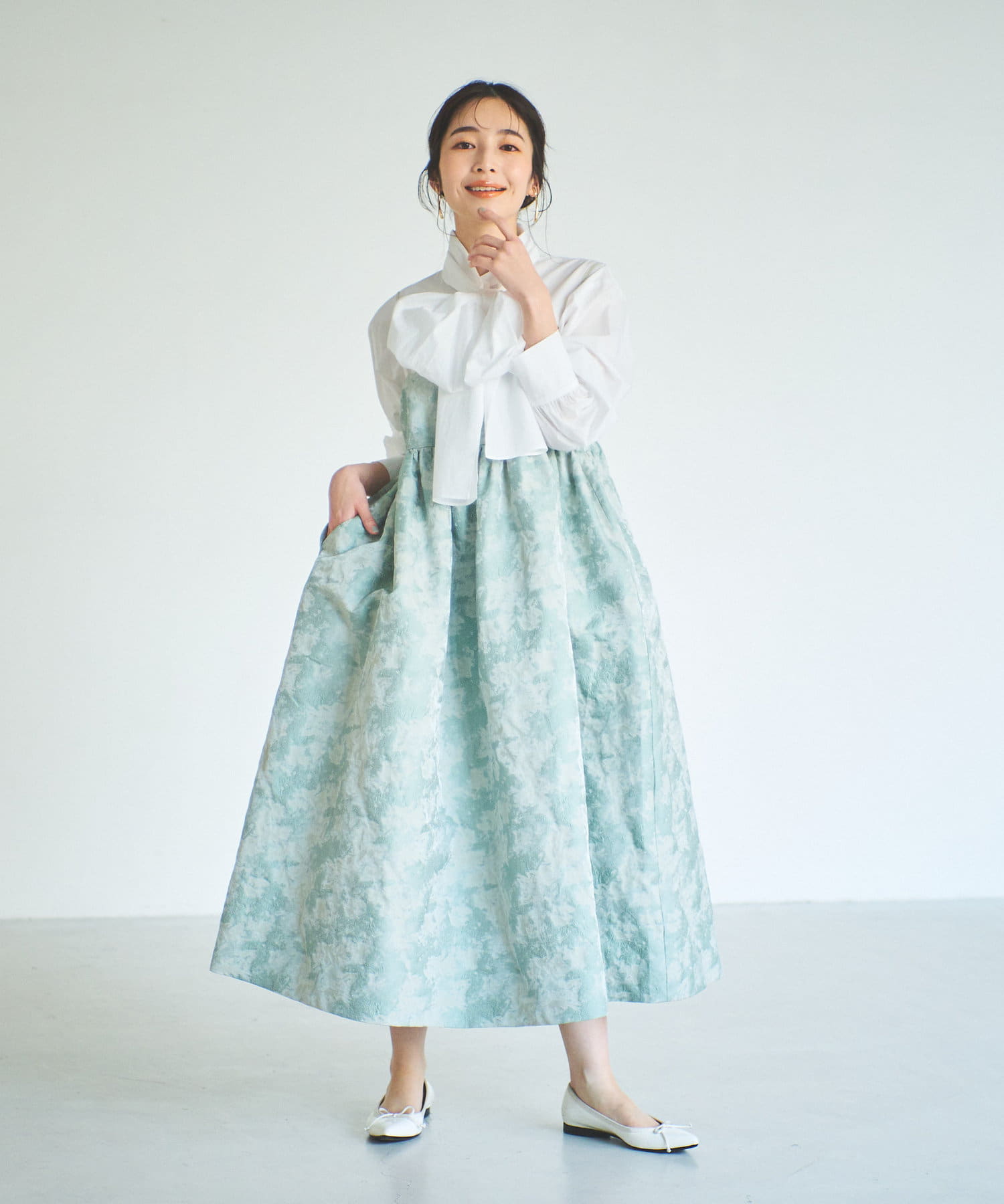 似たようなデザインがあっても、こういうカラーでジャガード生地って見かけないので、他とかぶらない特別なワンピースという感じです。