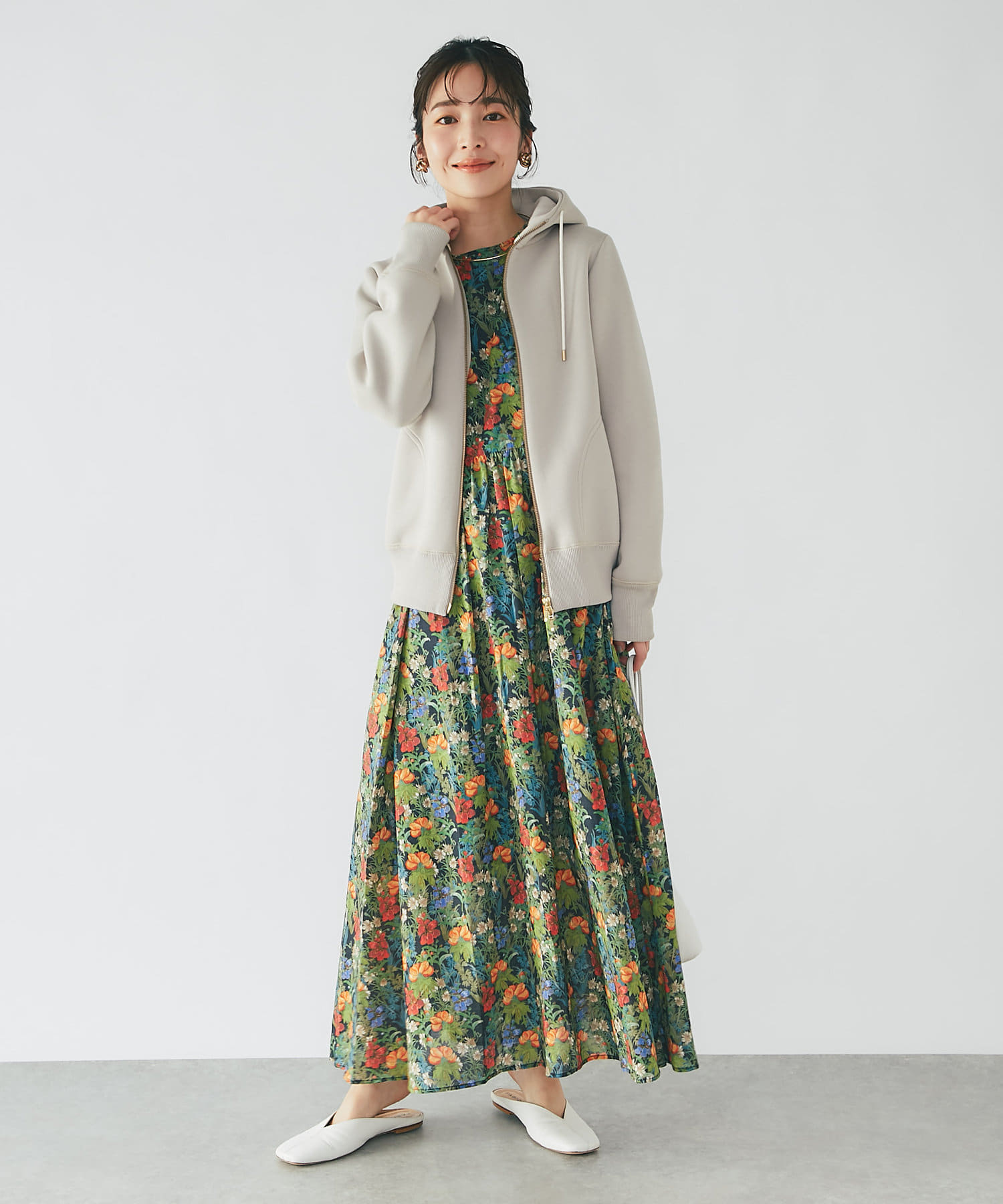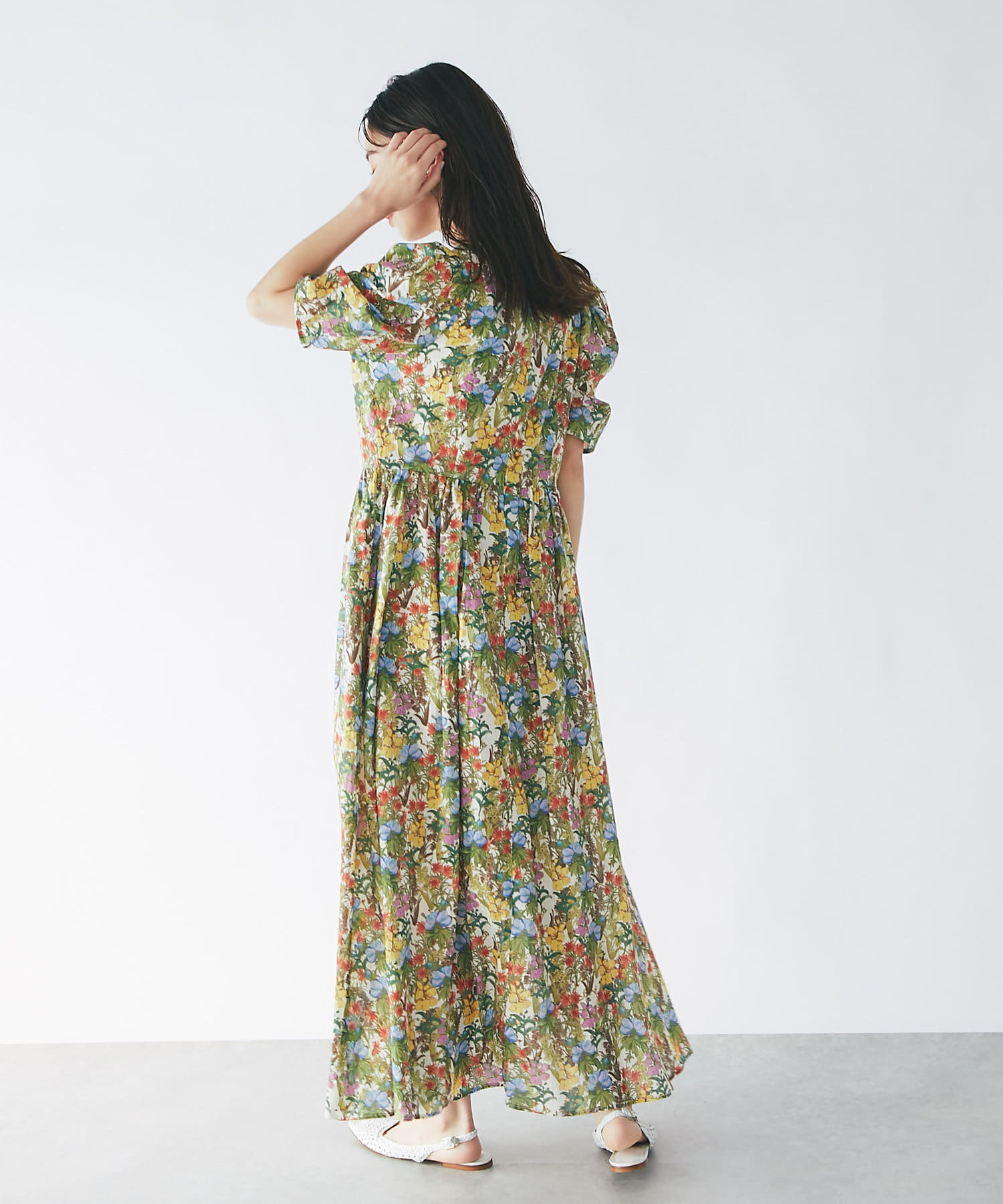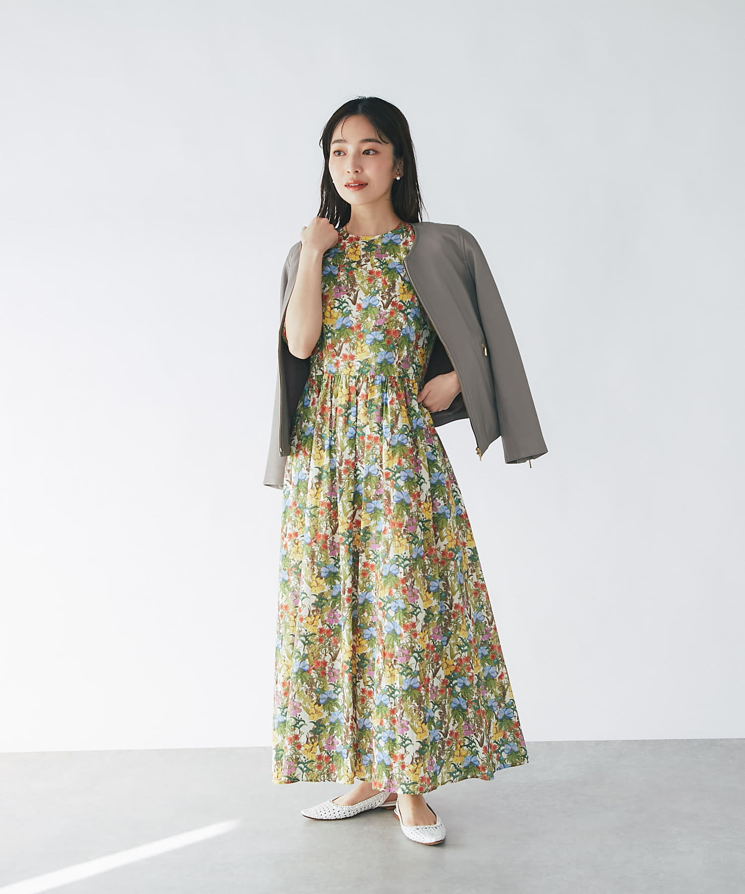 フラワープリントが存在感をアピールする華やかなロングワンピース。