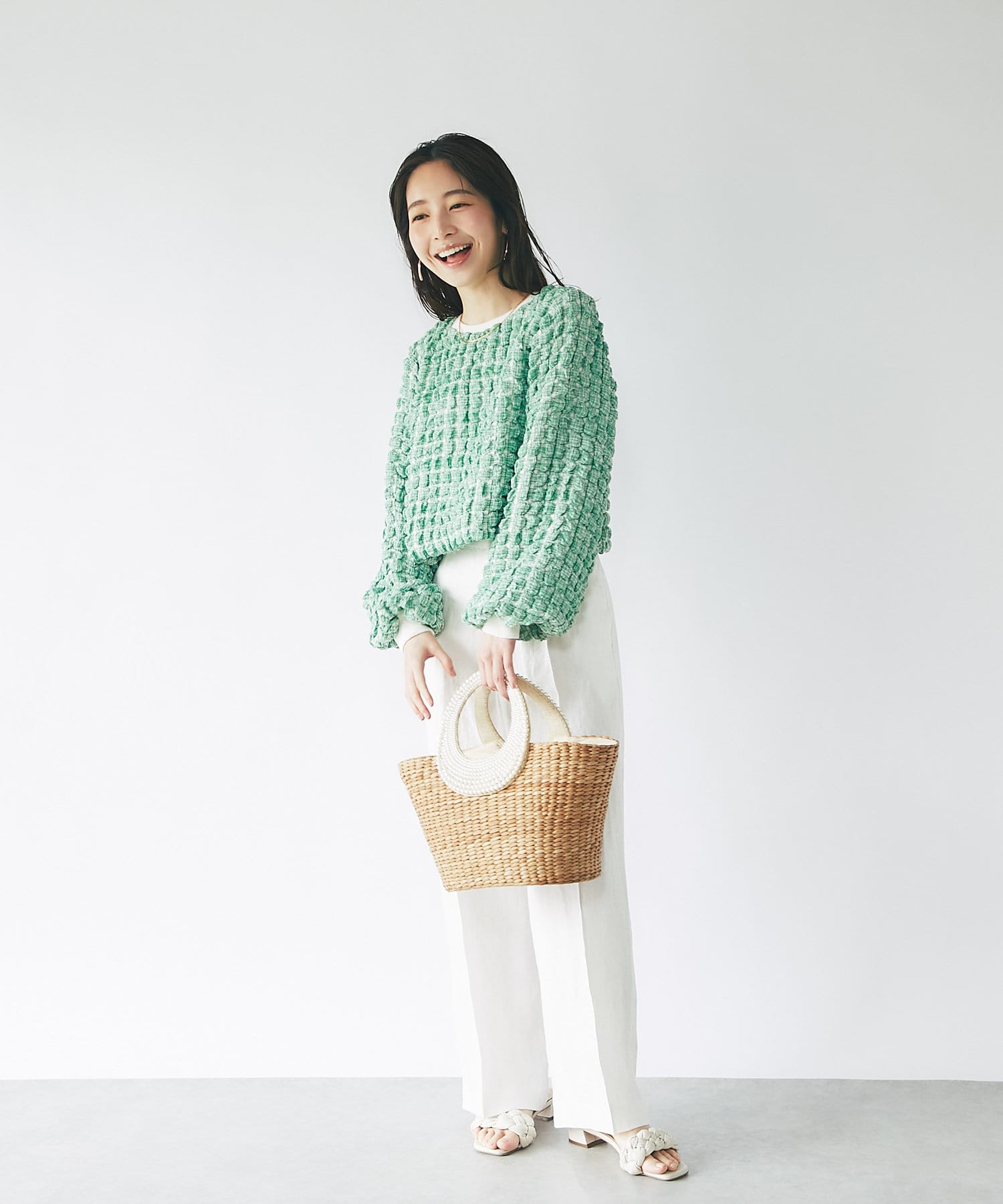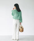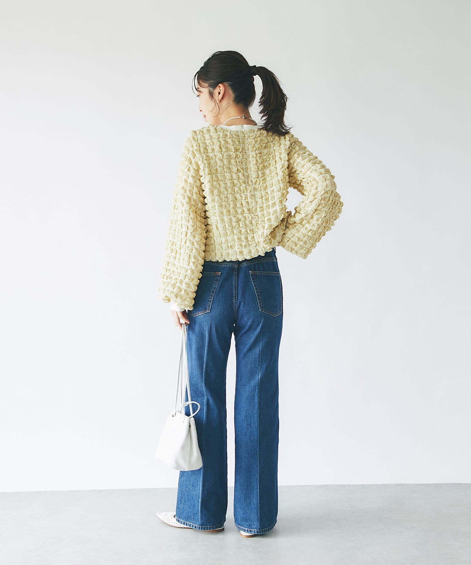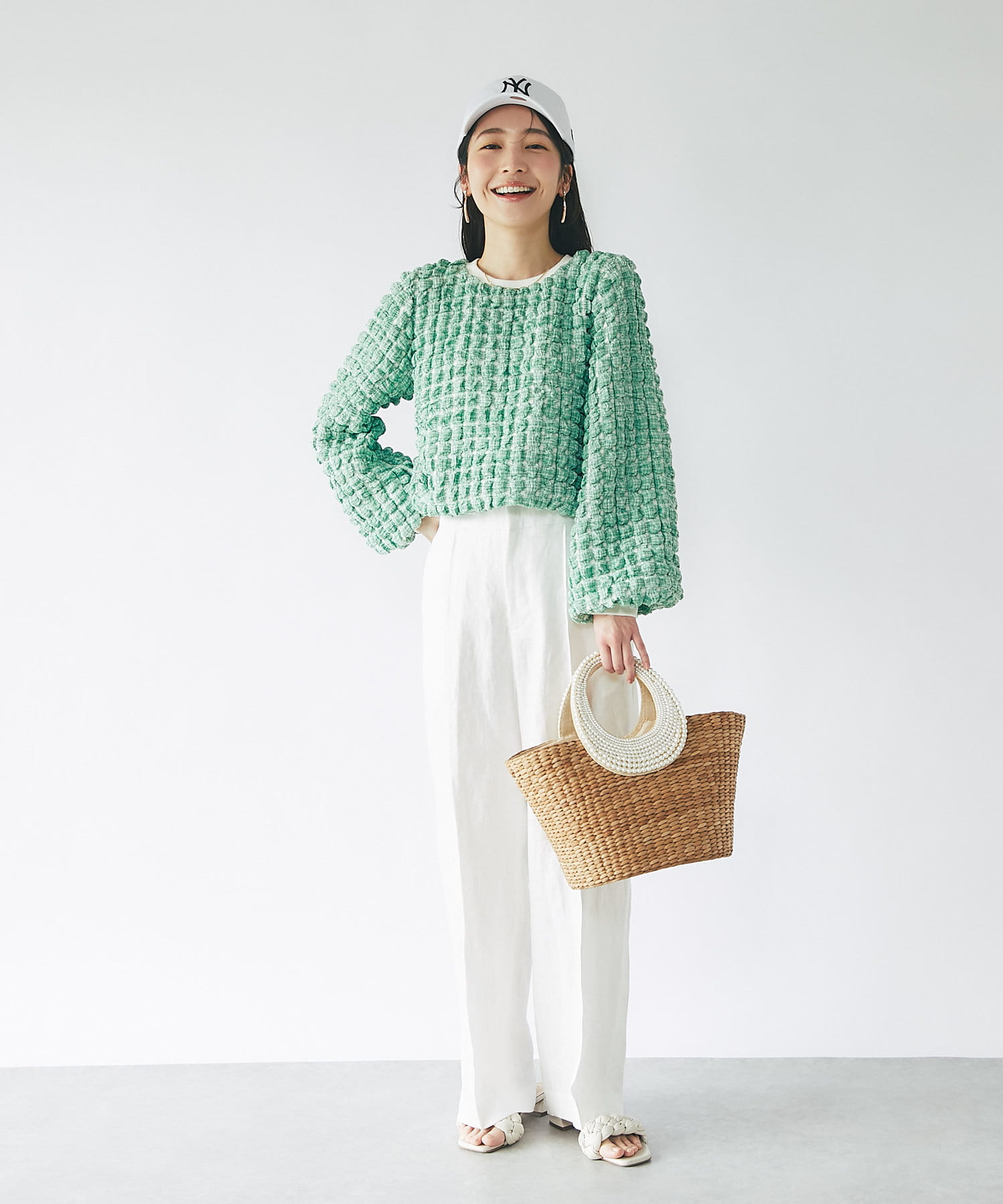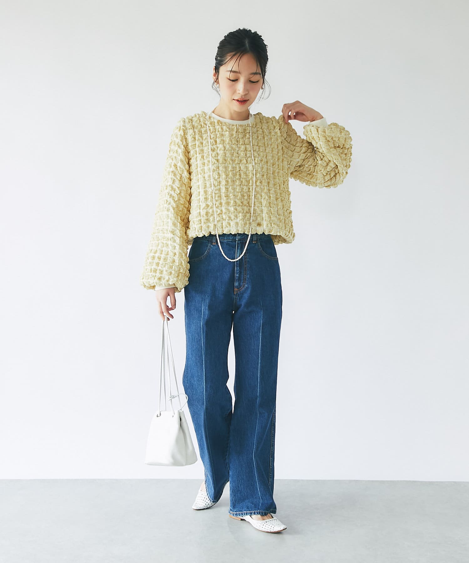 トレンドのクロップド丈で、ハイウエストのボトムと合わせることで脚長効果にも期待できます。