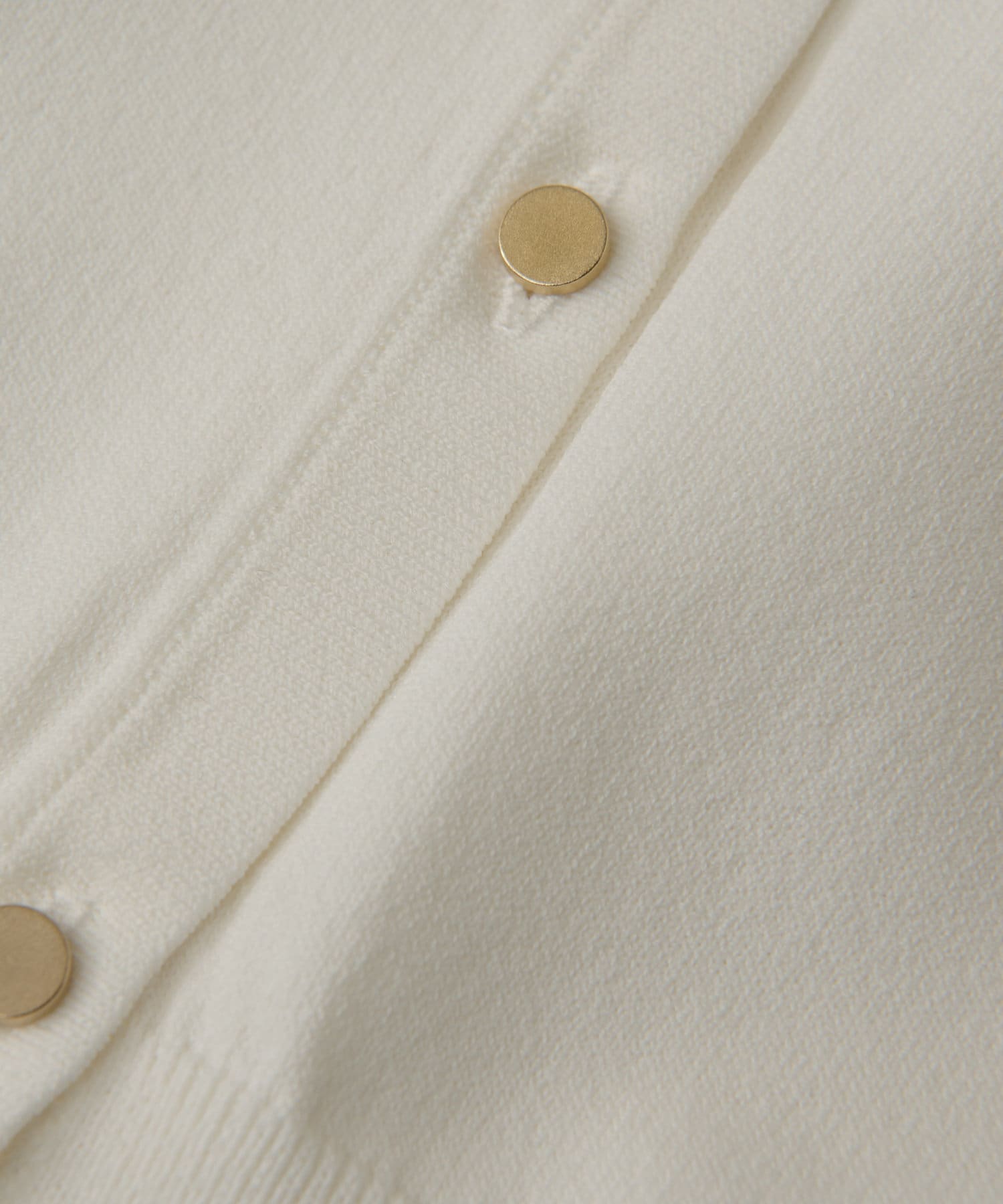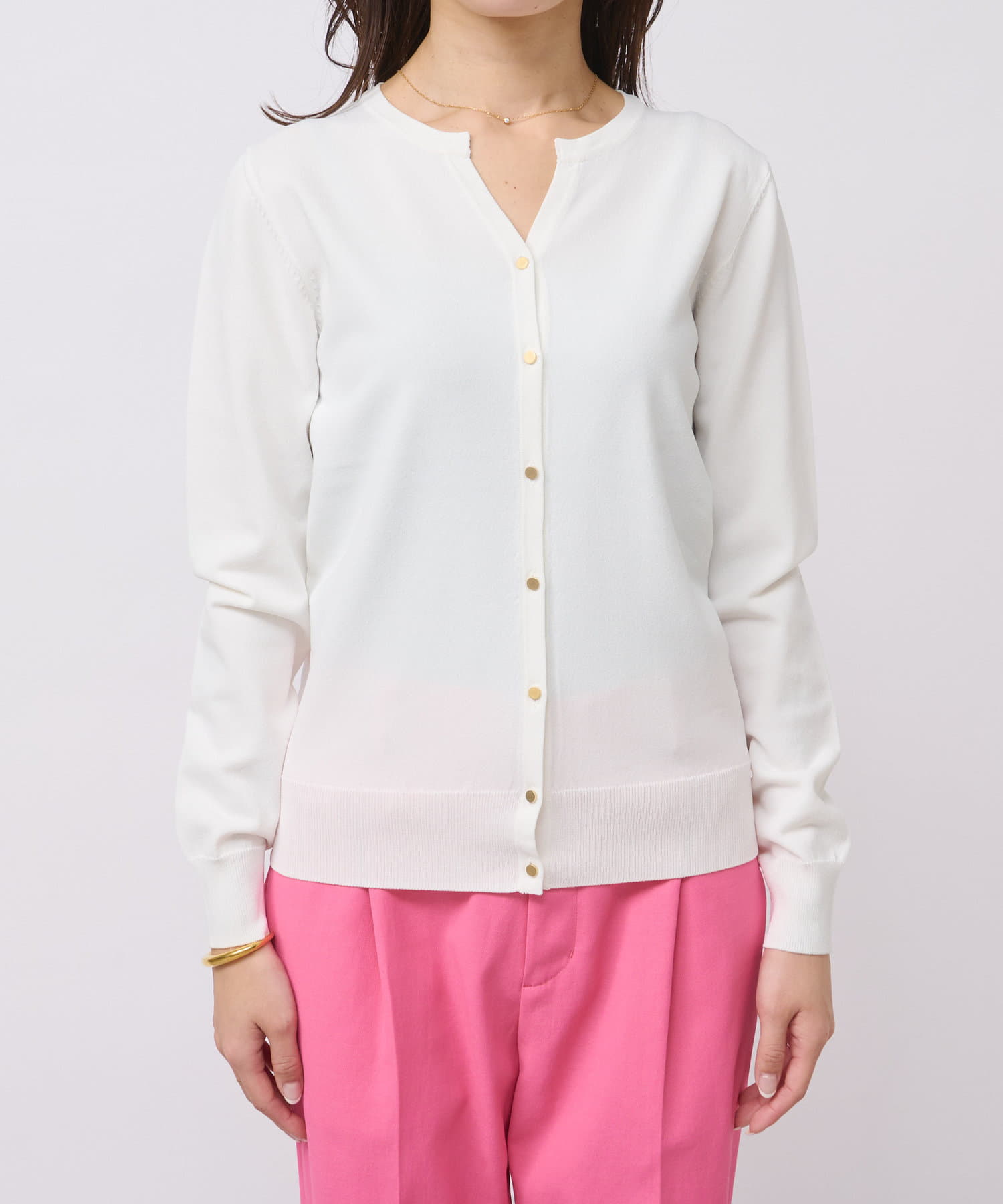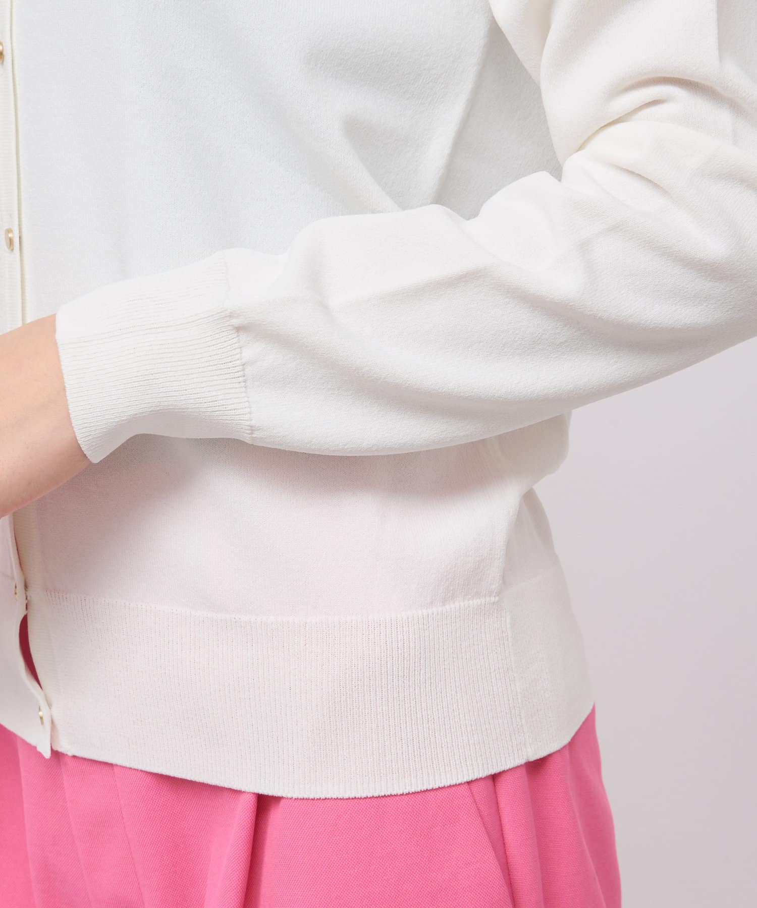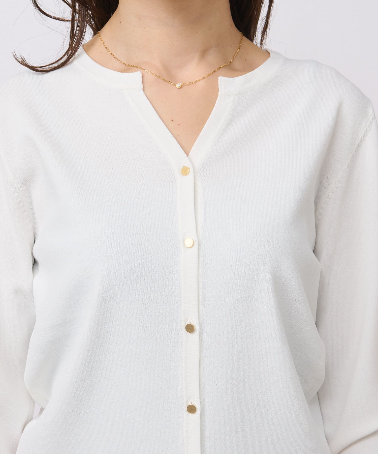 鎖骨をきれいに見せてくれるスキッパーネックのフェミニンなカーディガン。