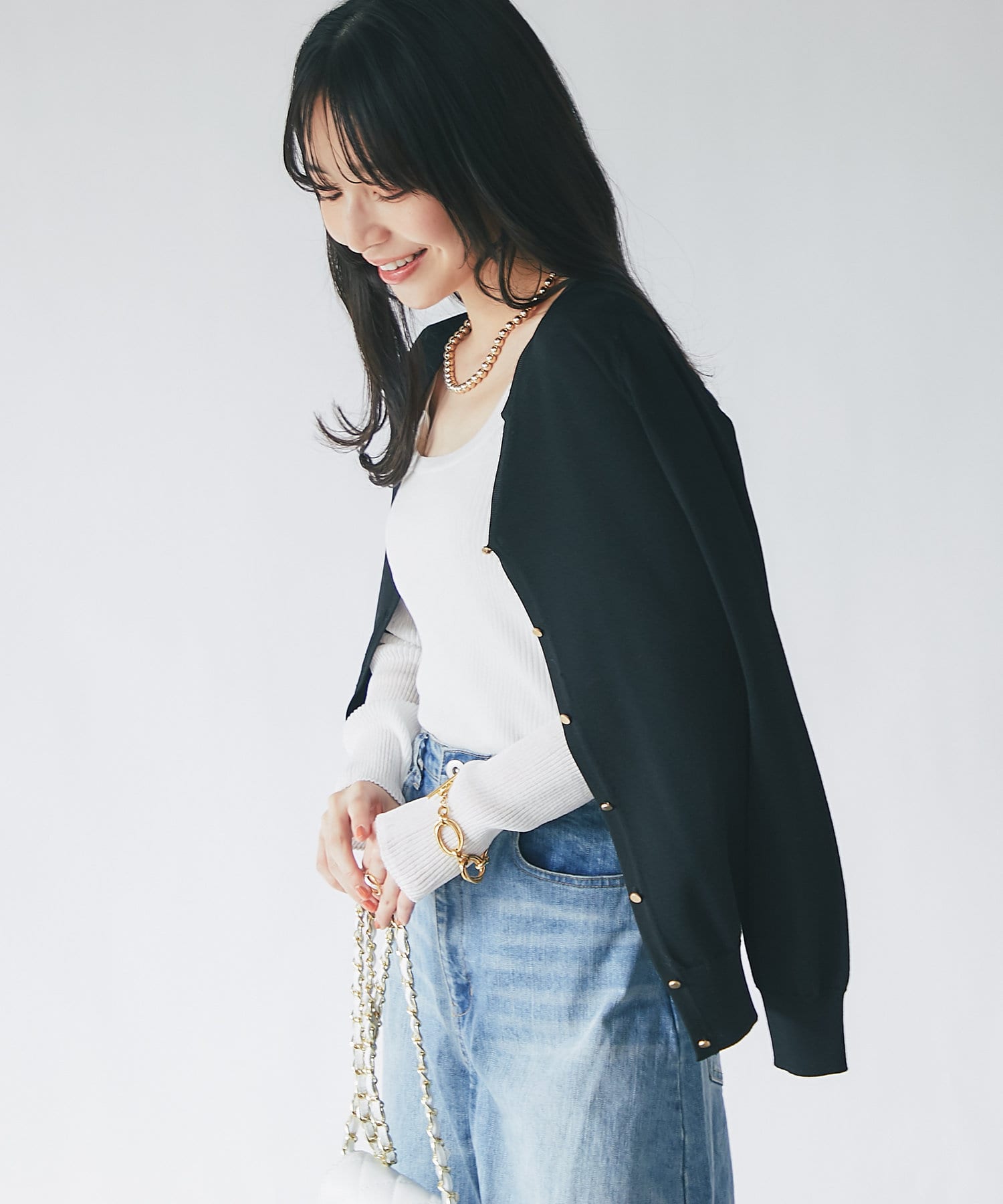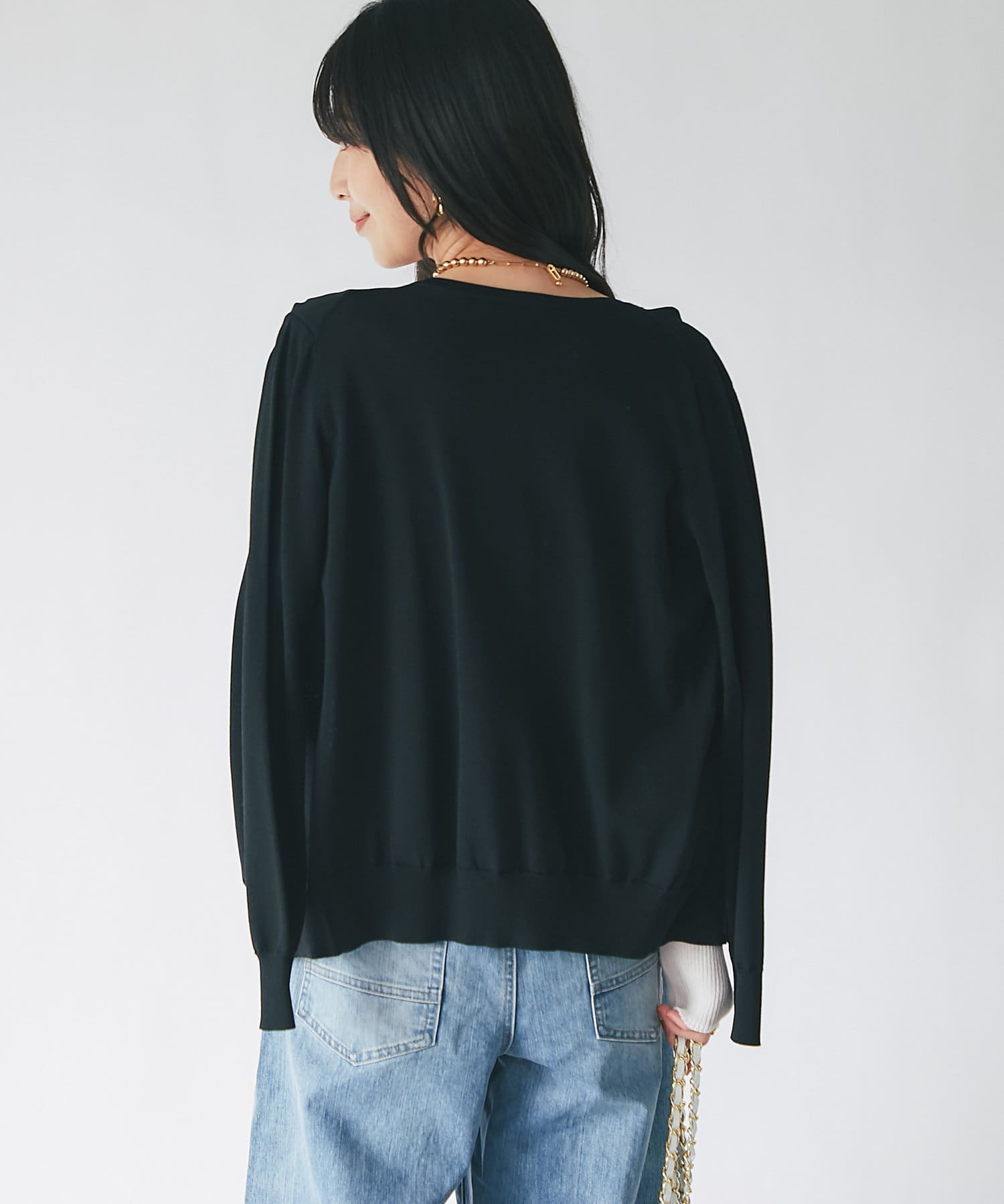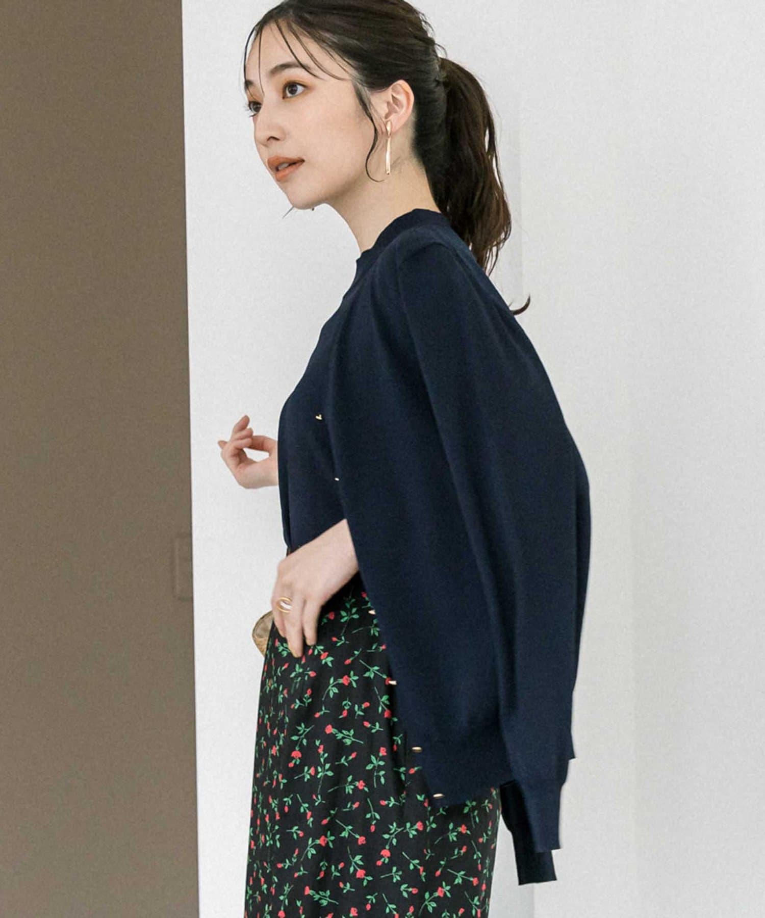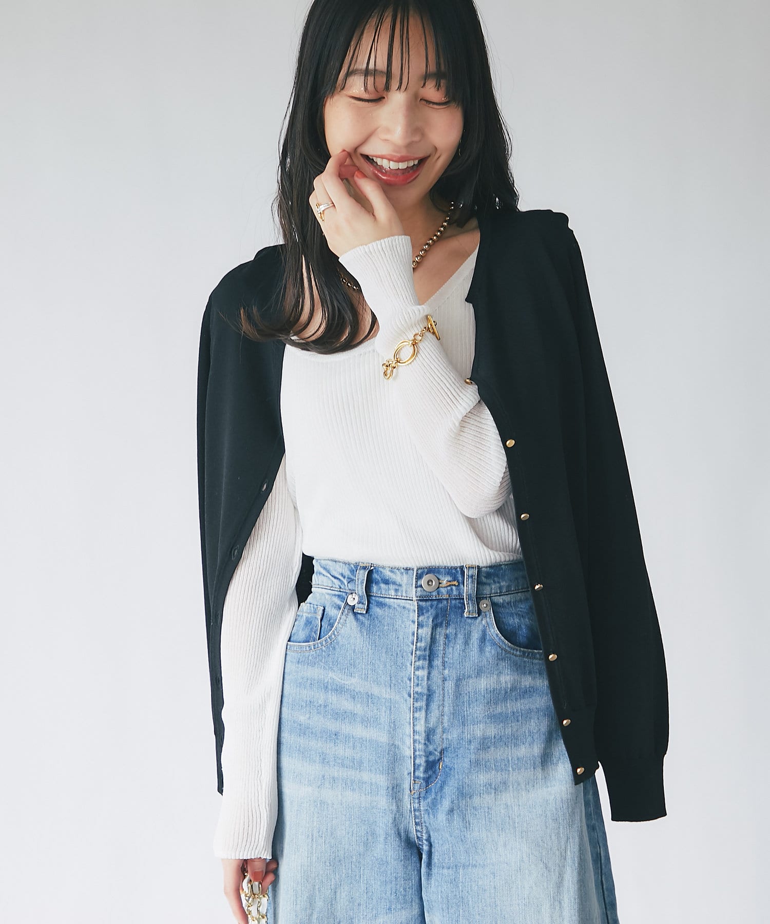 鎖骨をきれいに見せてくれるスキッパーネックのフェミニンなカーディガン。