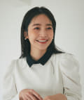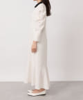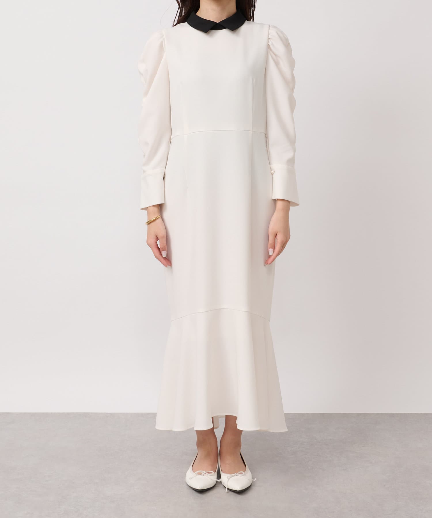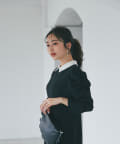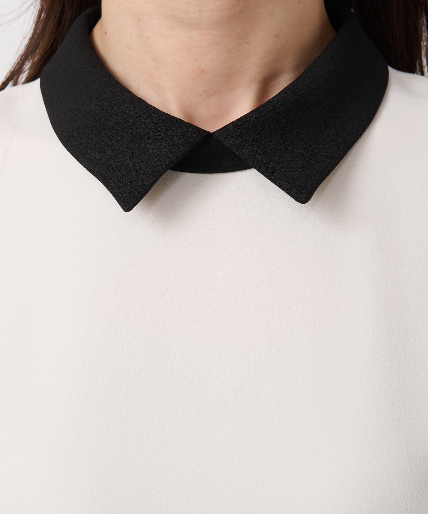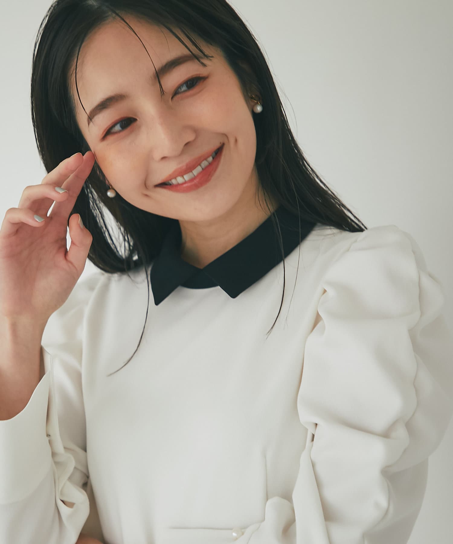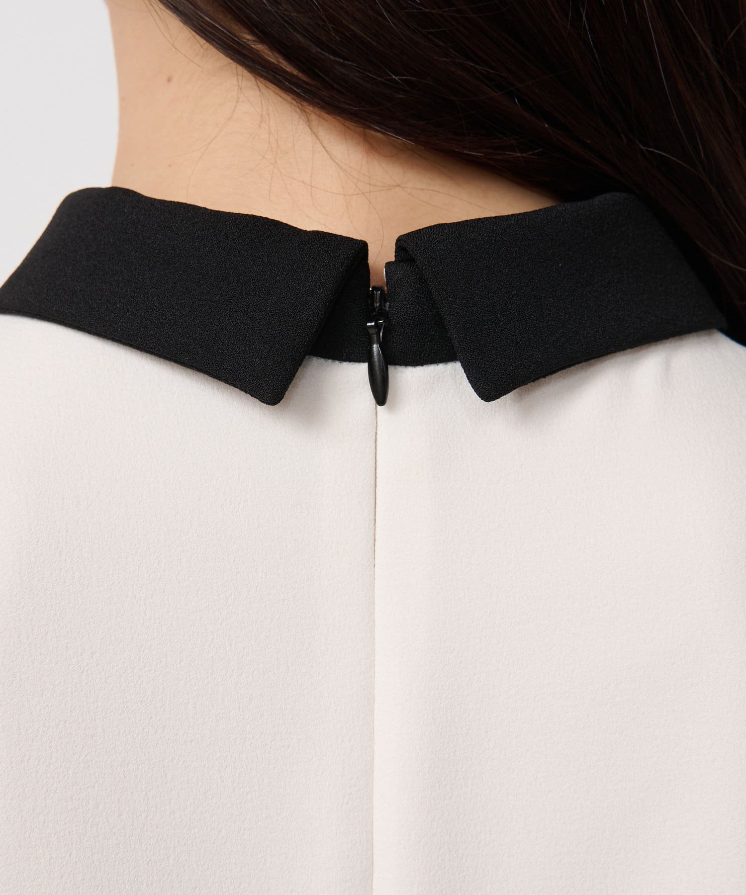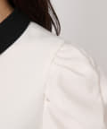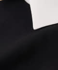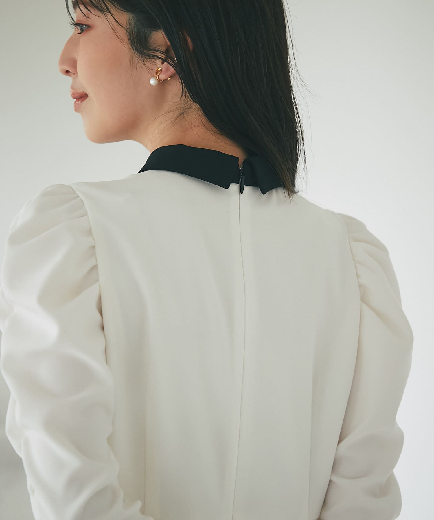 バイカラー襟と袖のパールボタンがアクセントになっています。