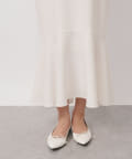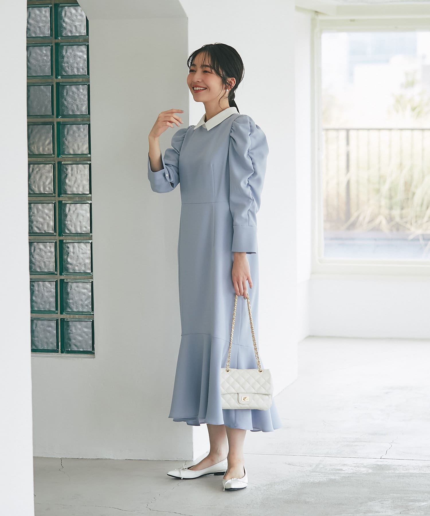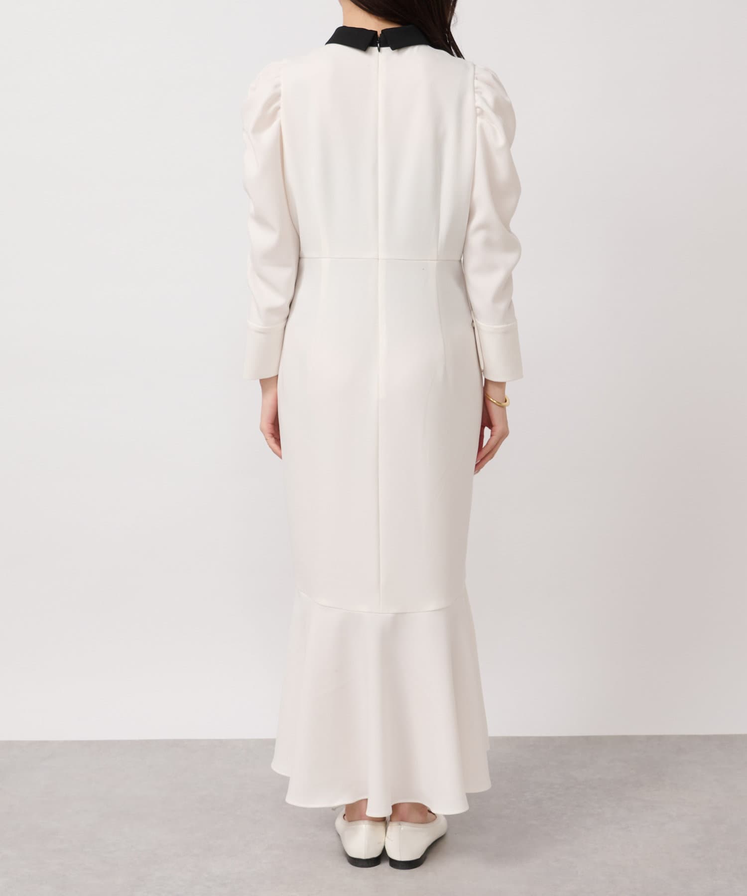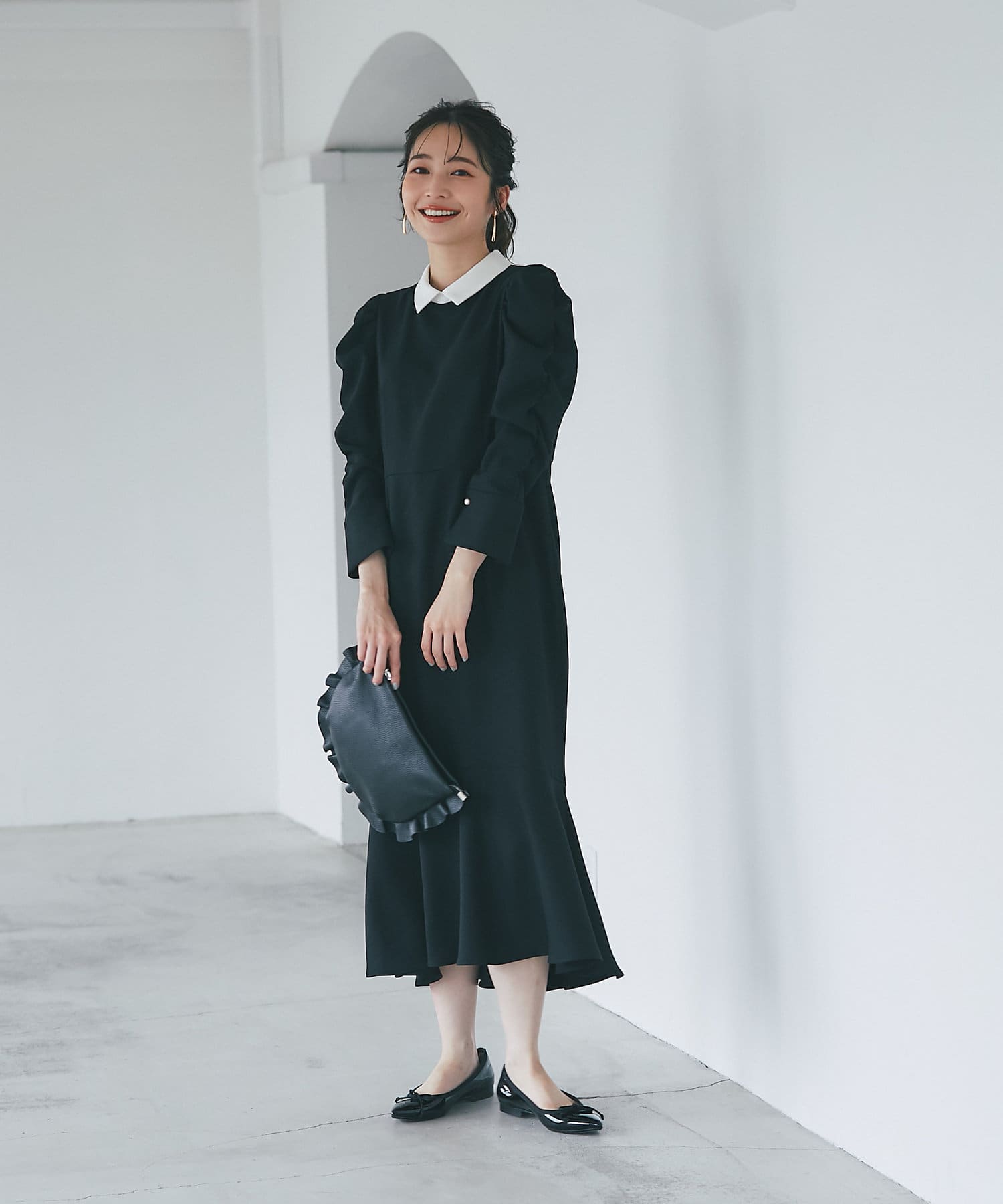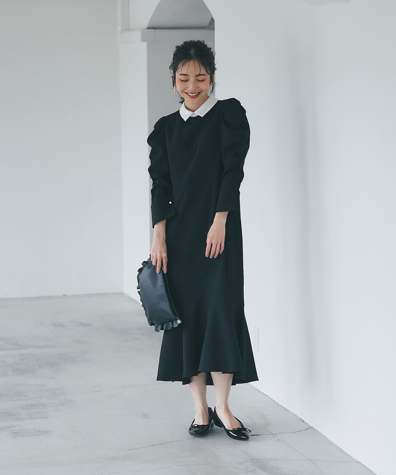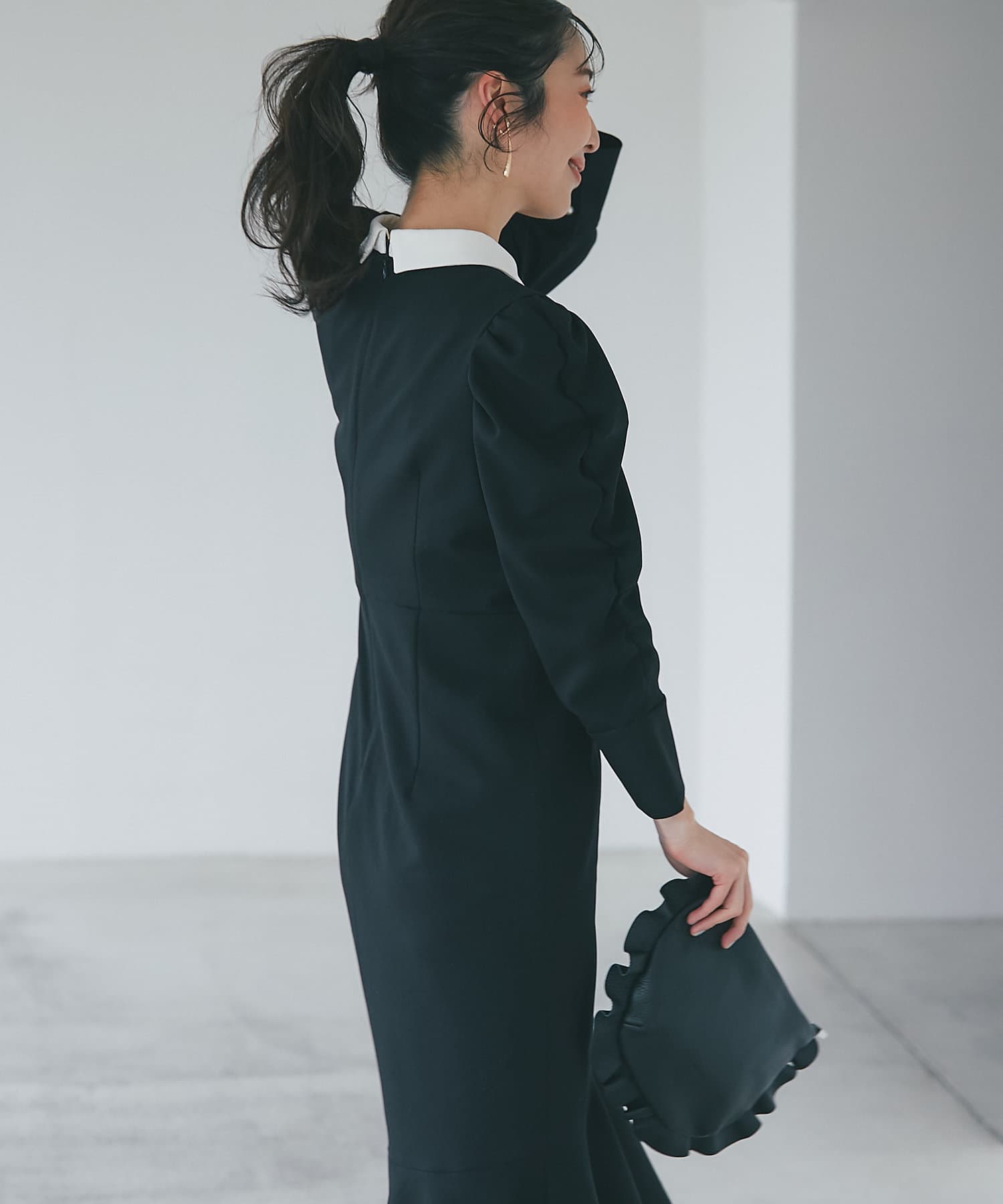 パワーショルダースリーブと揺れるマーメイドシルエットがフェミニンなワンピース。