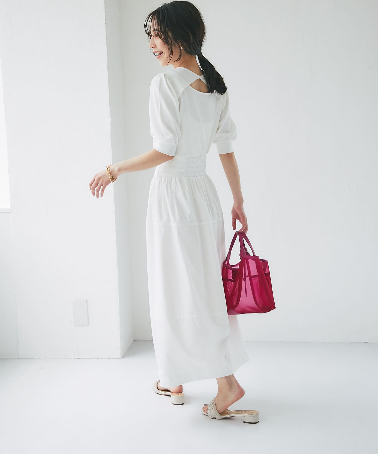 高め位置のベルトデザインでウエストをマークでき、華奢見え効果も狙える一枚。