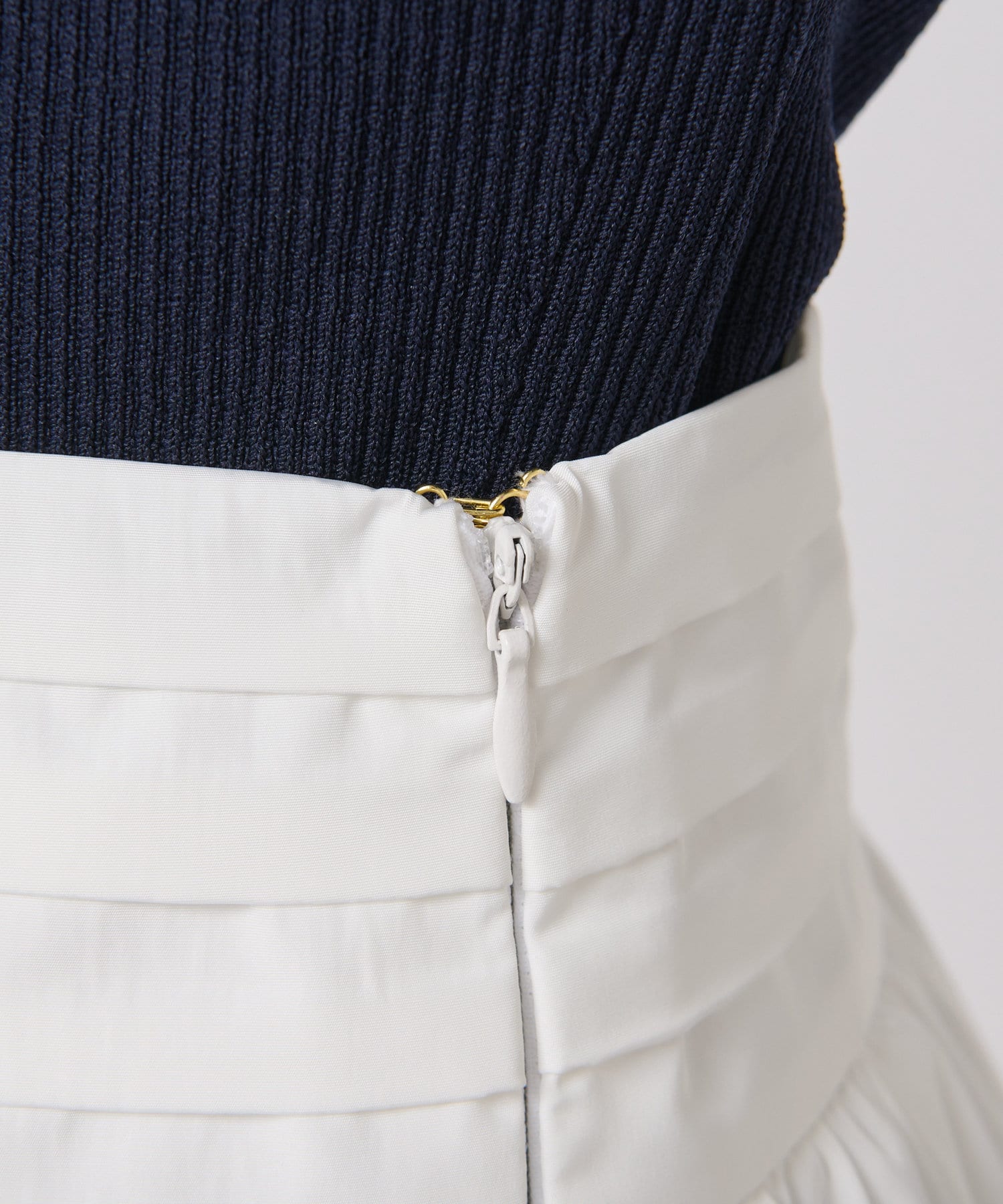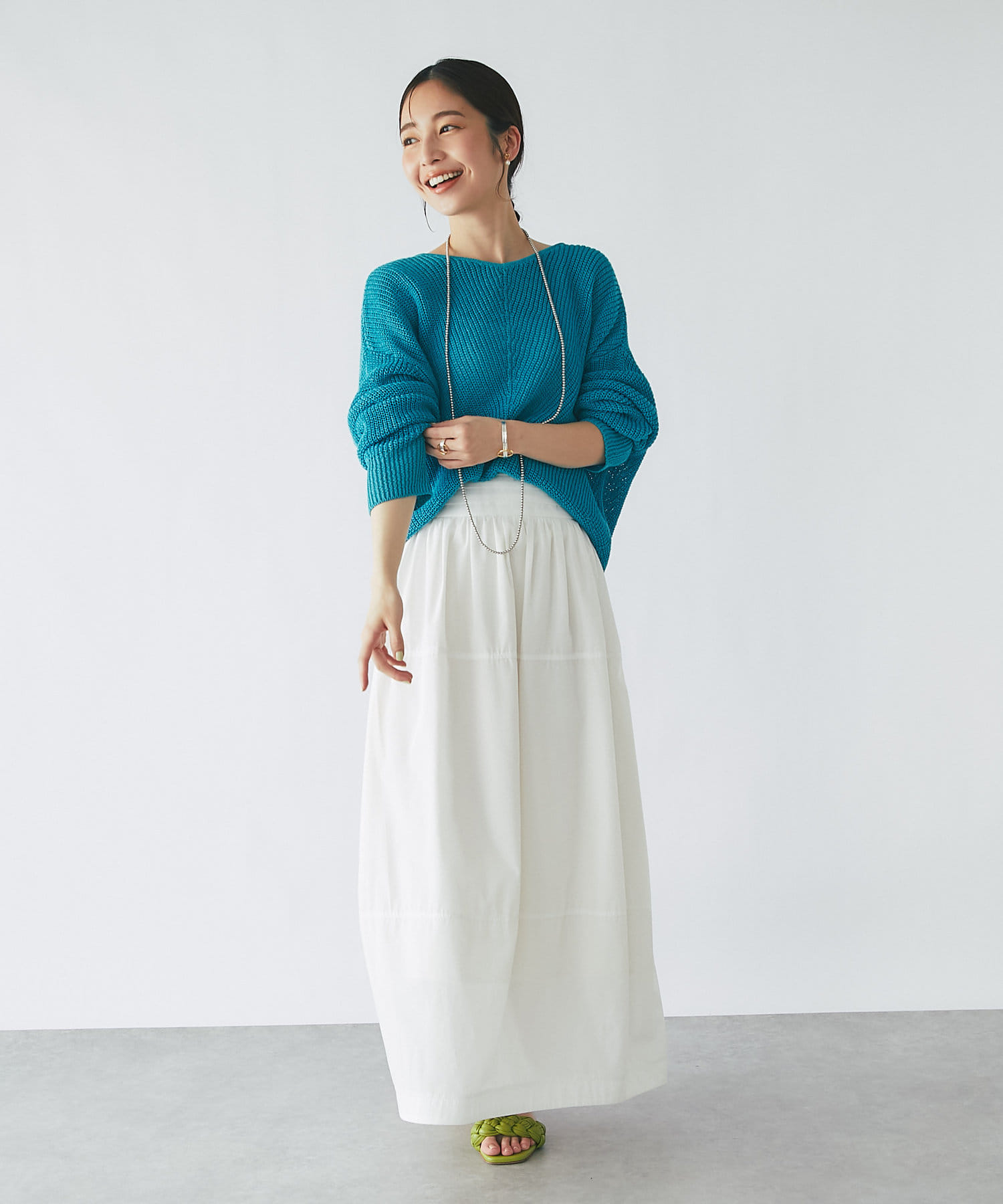 トップスをインしてウエストデザインを強調するとスタイルアップも期待できます。