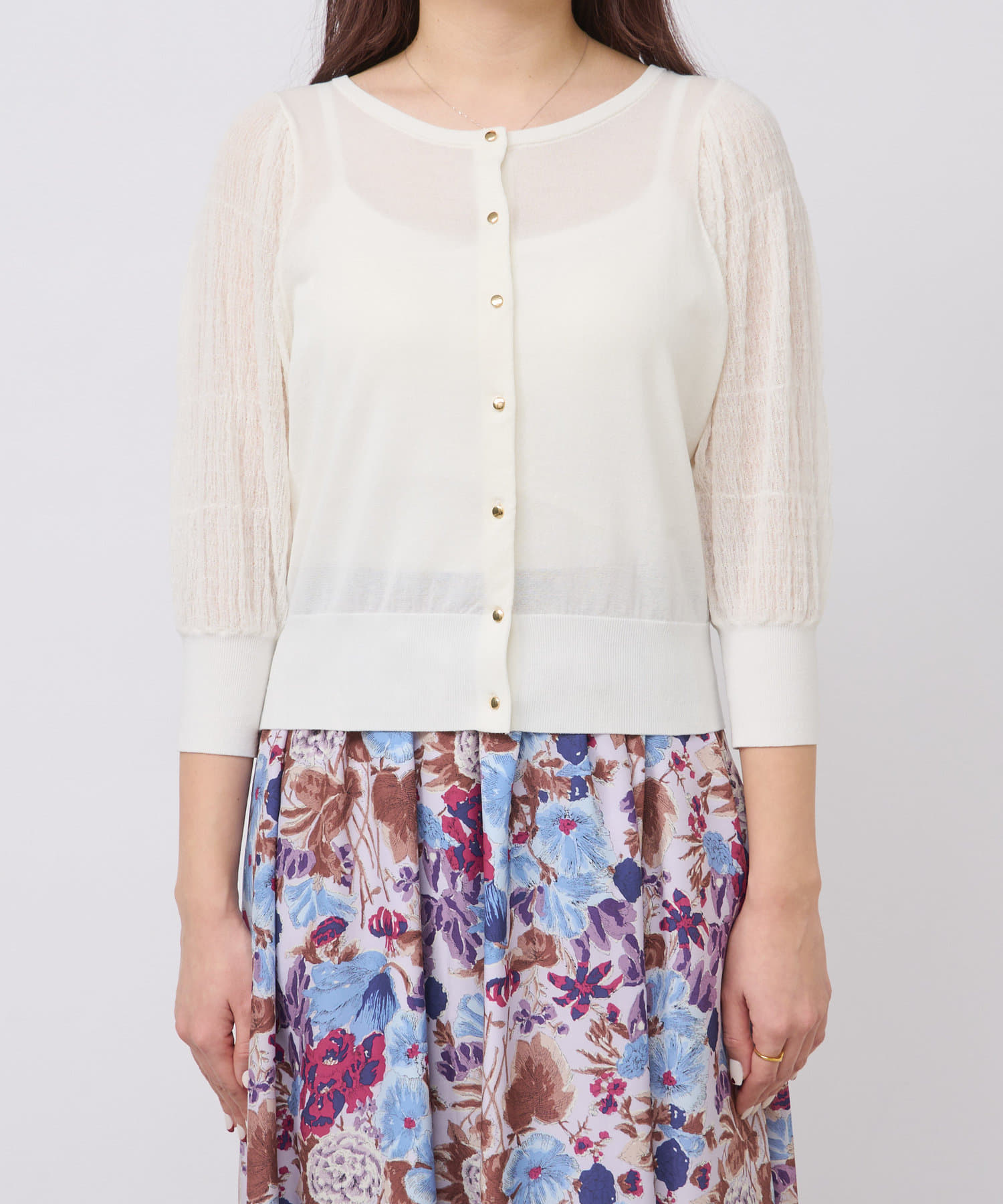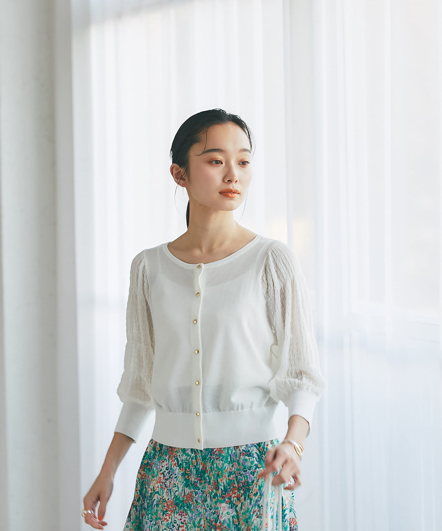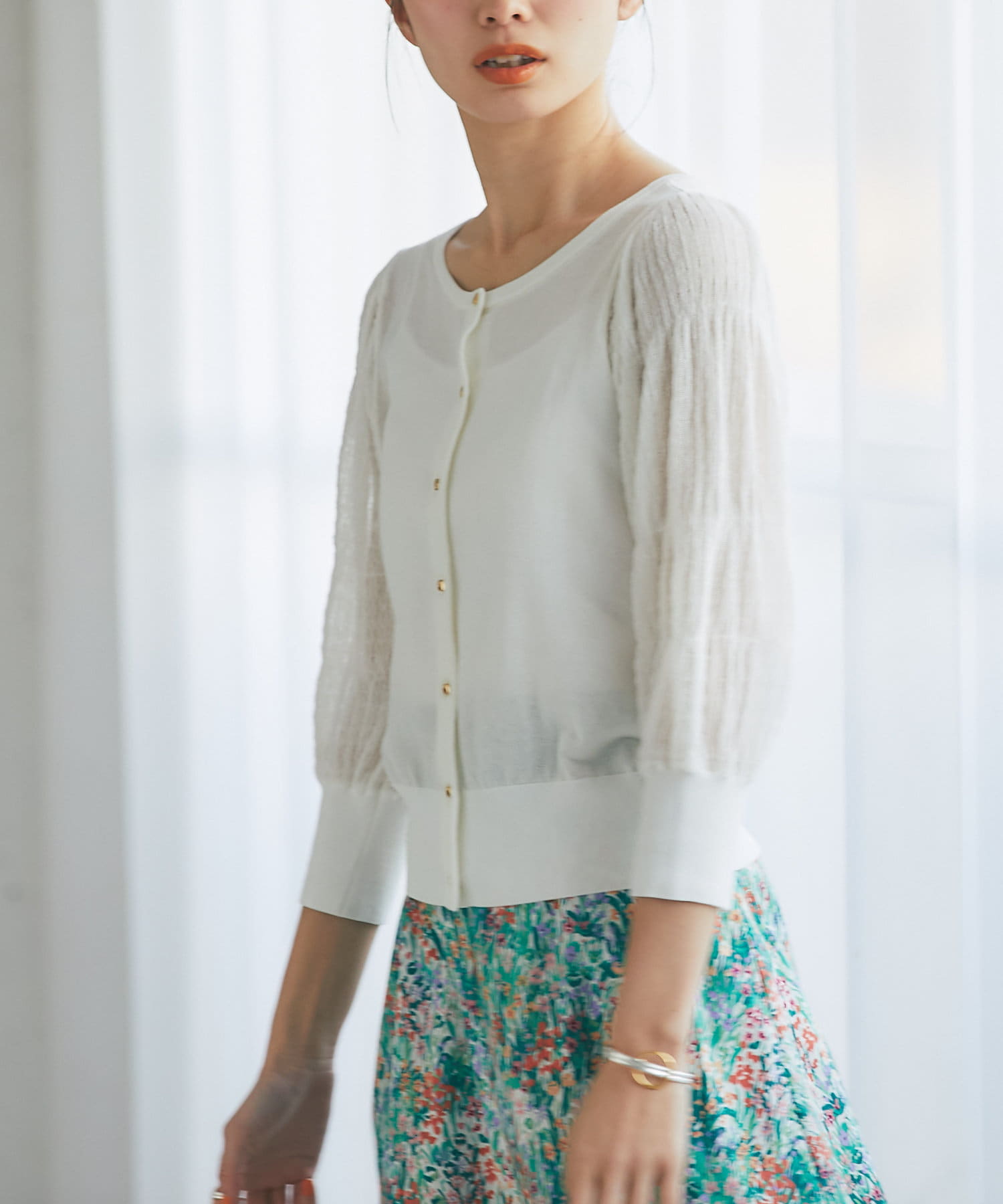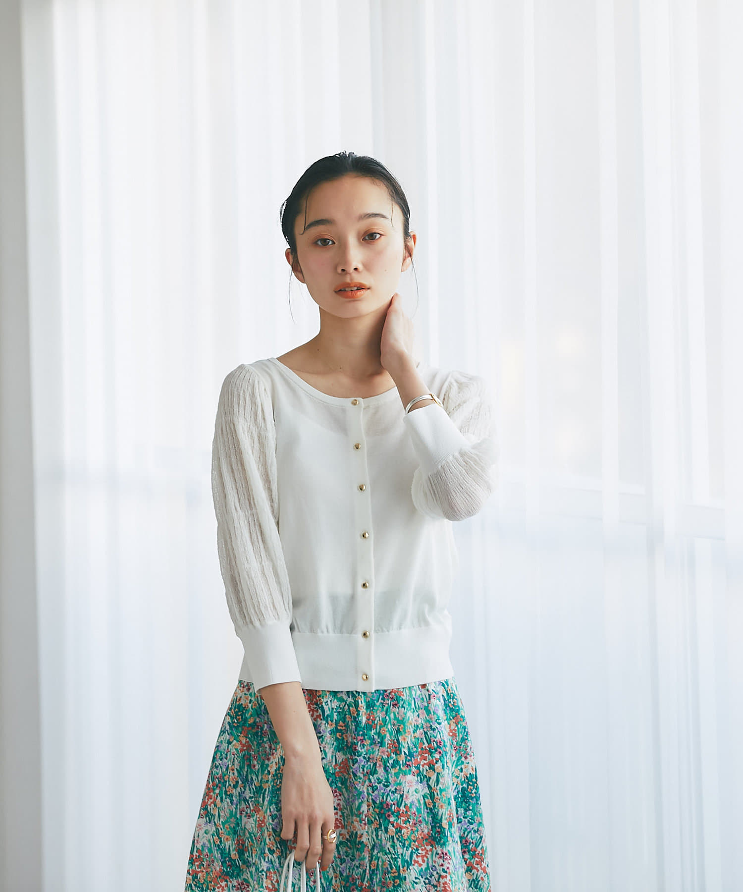 そでのシャーリングと程よい透け感がフェミニンなライトニットカーディガン