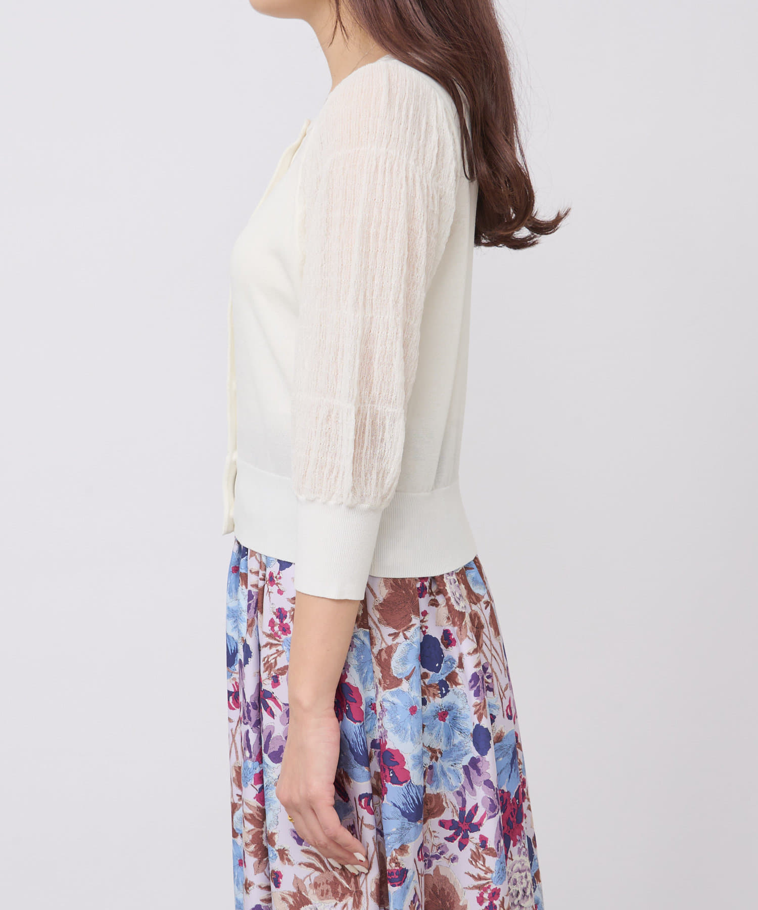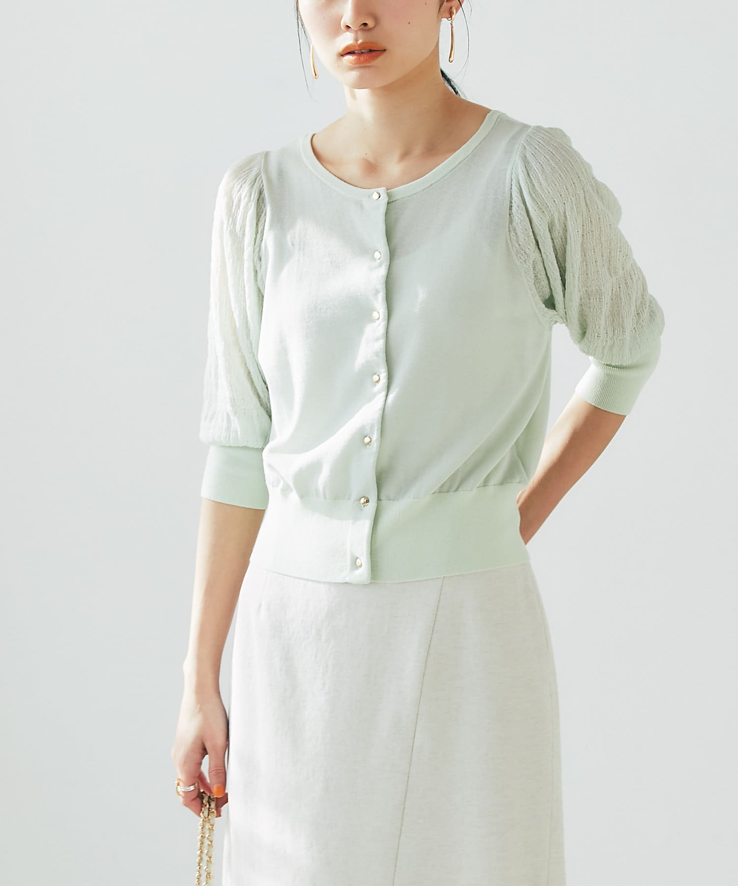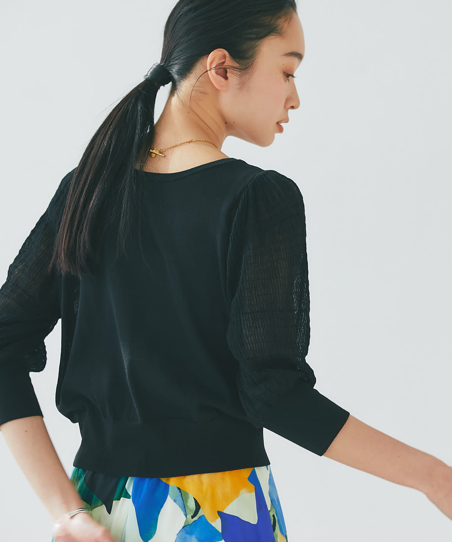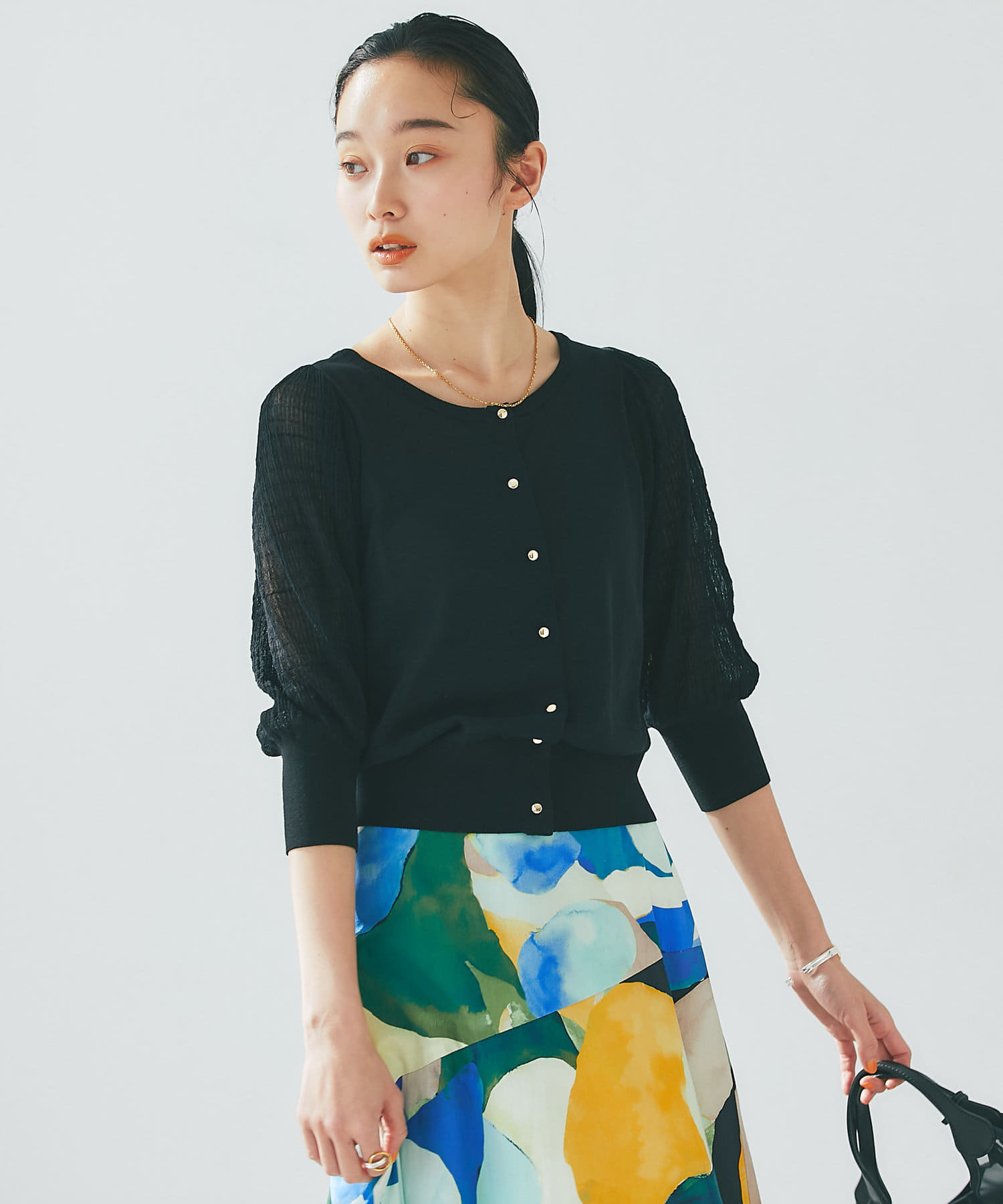 そでのシャーリングと程よい透け感がフェミニンなライトニットカーディガン