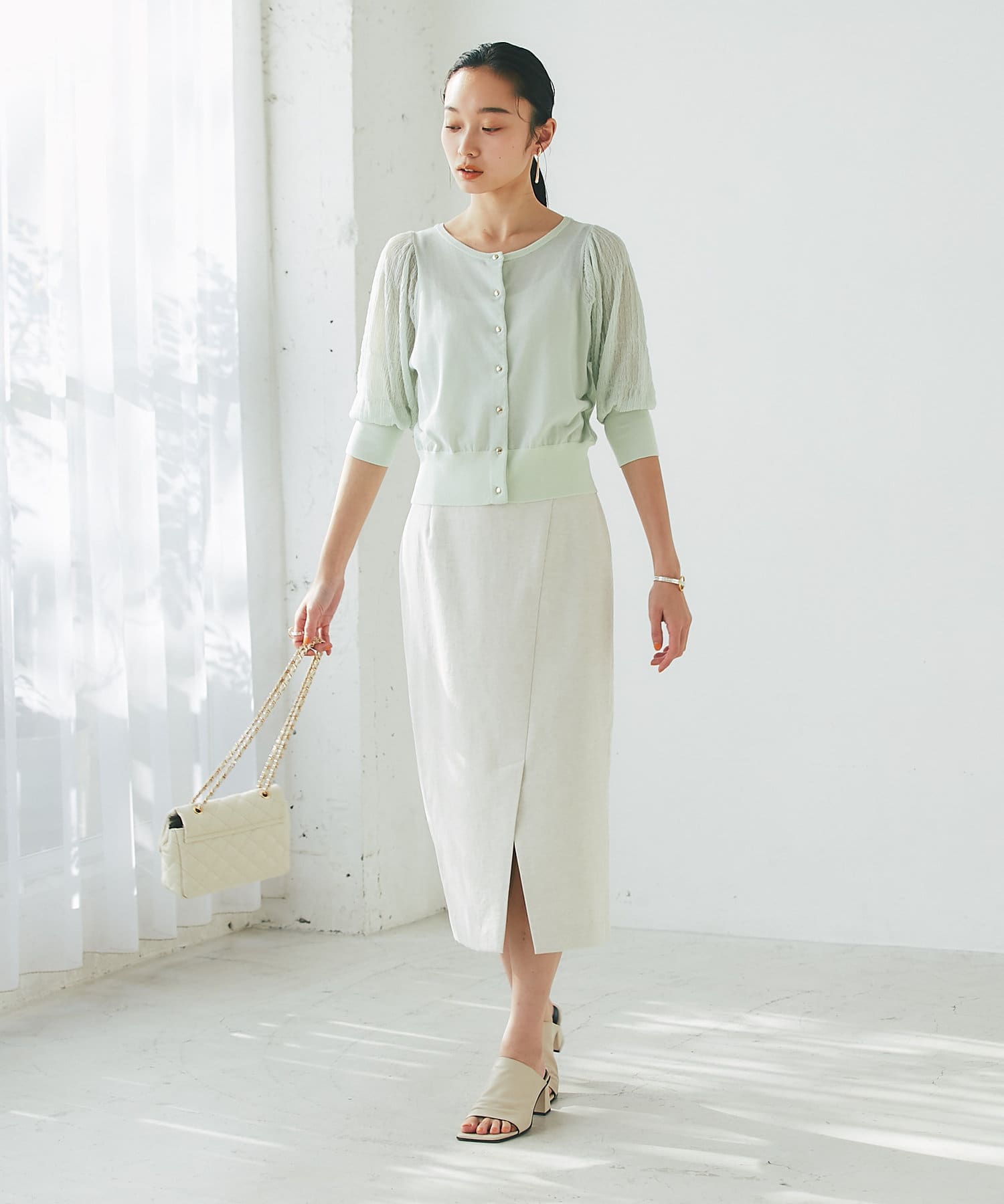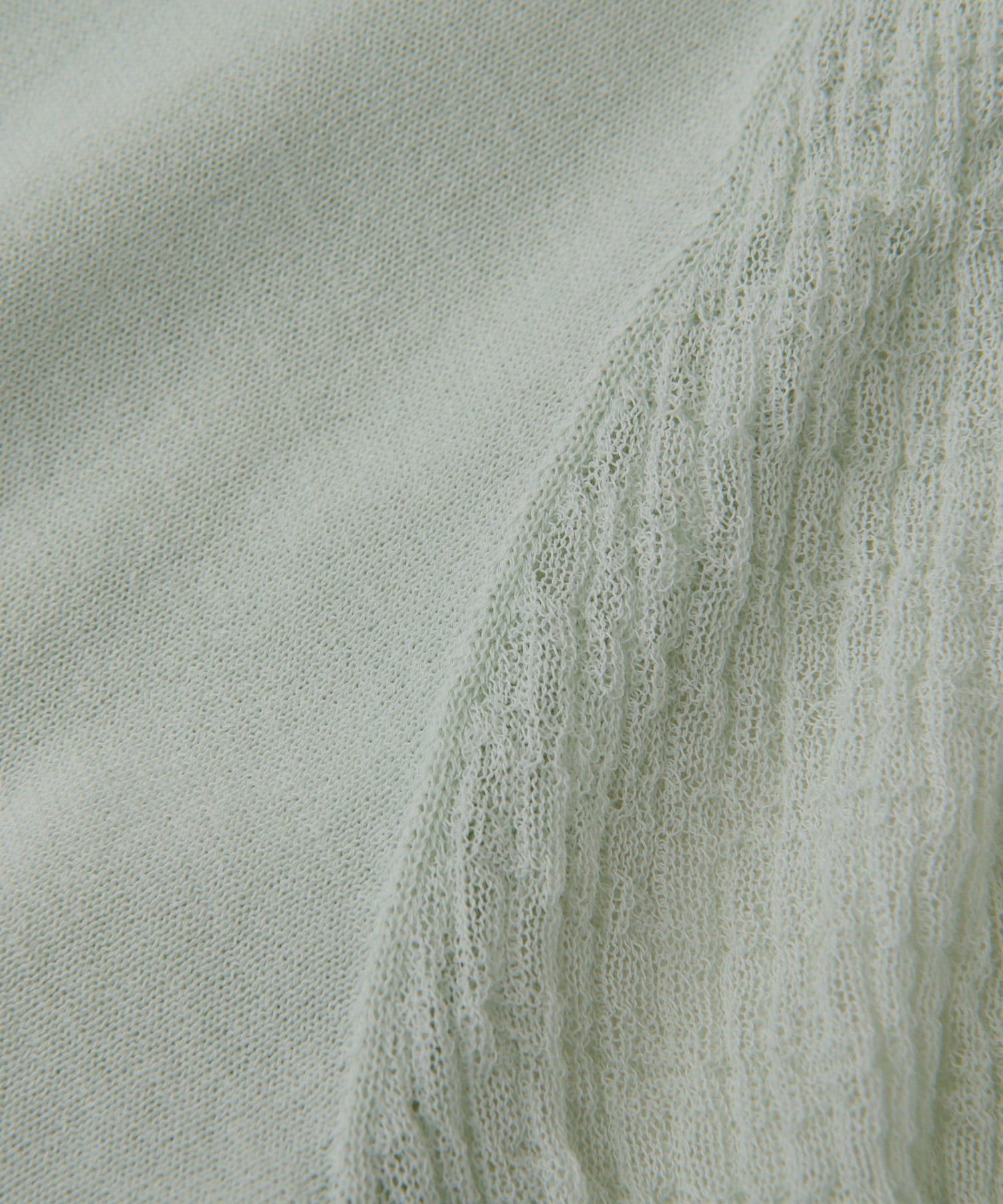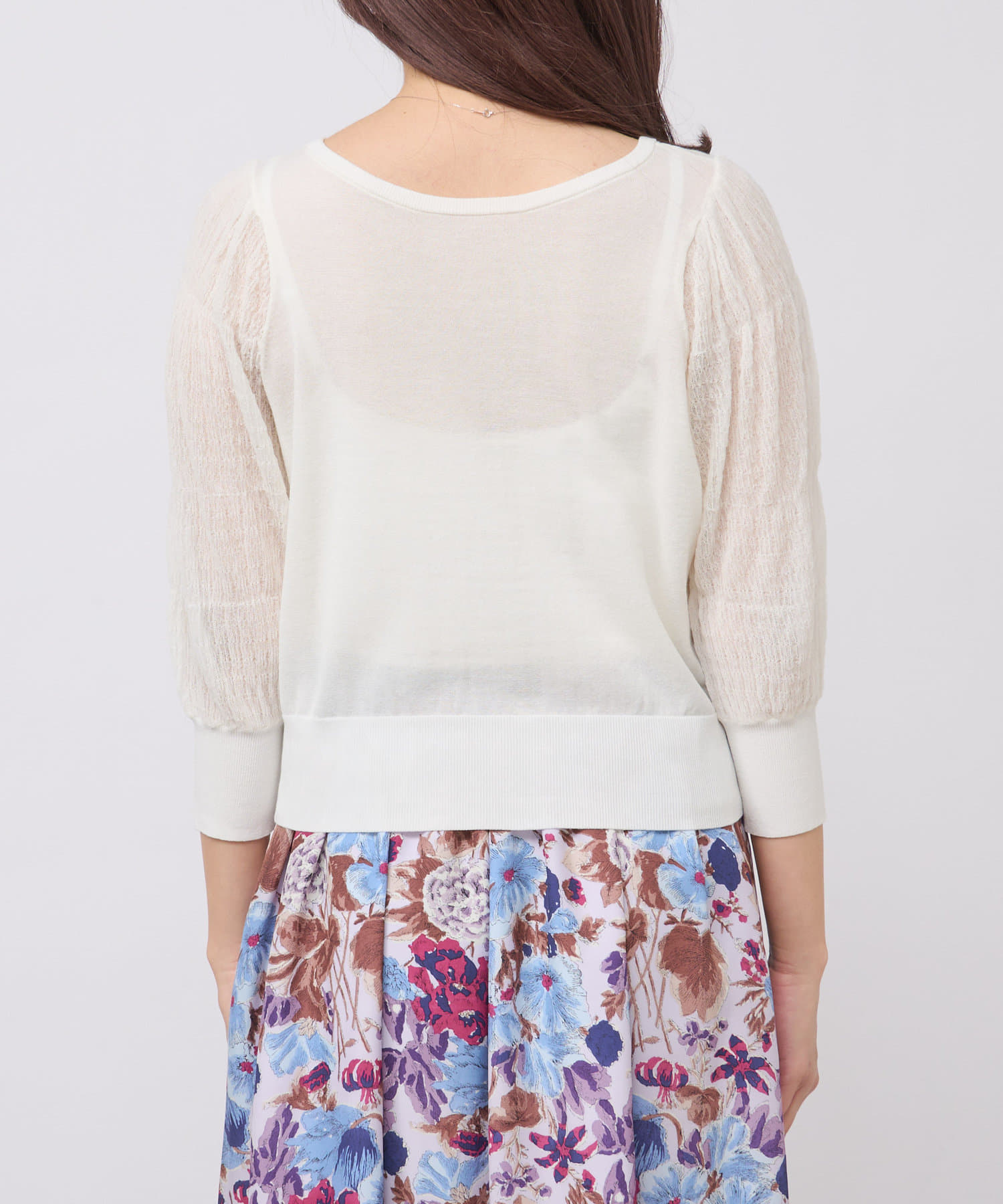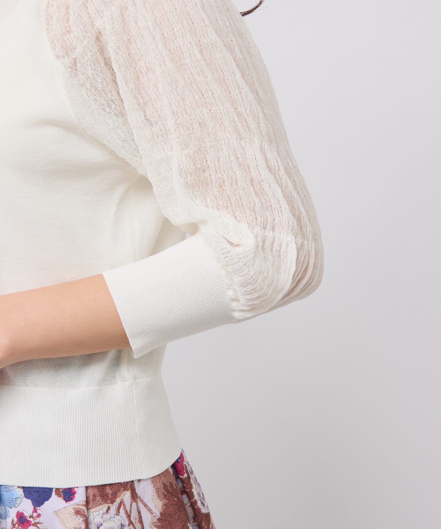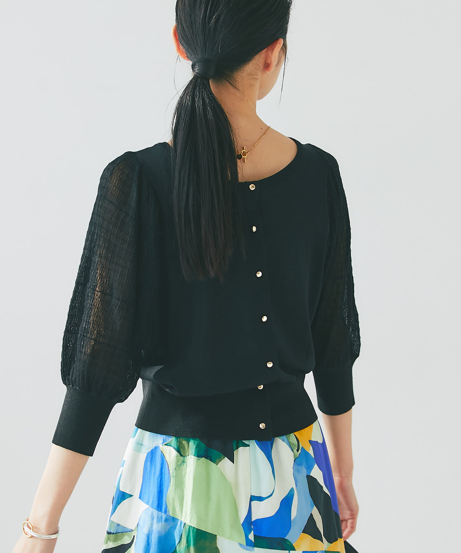 そでのシャーリングと程よい透け感がフェミニンなライトニットカーディガン