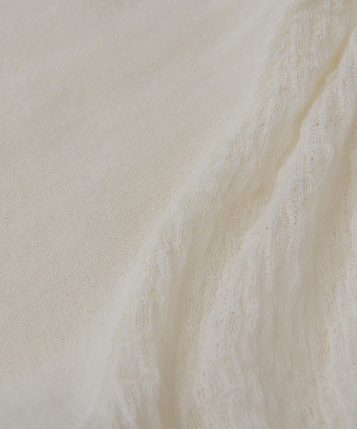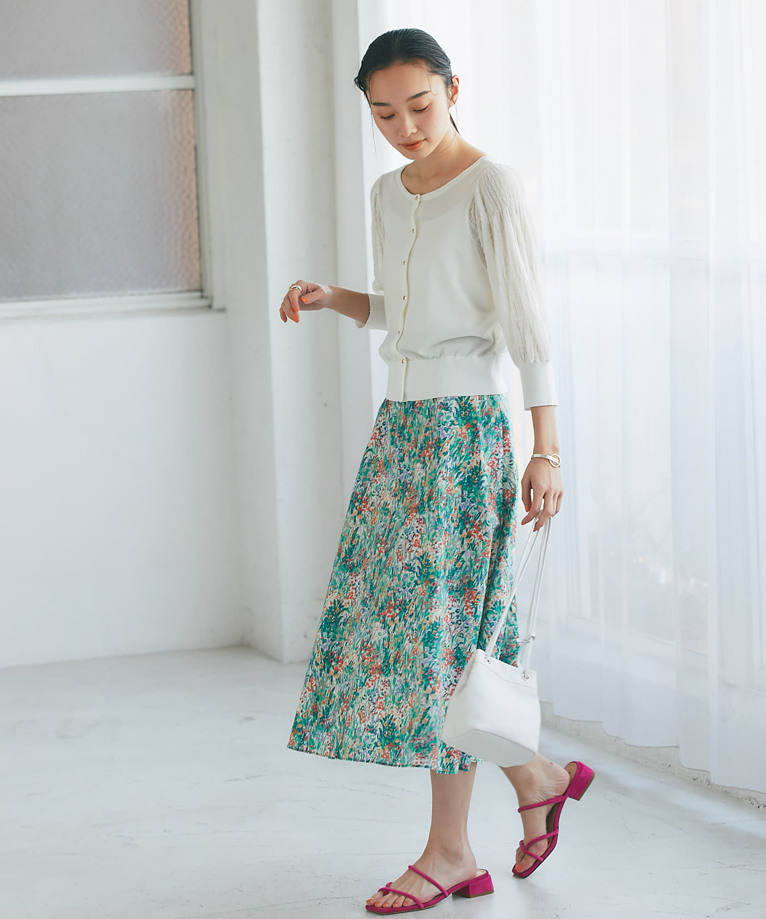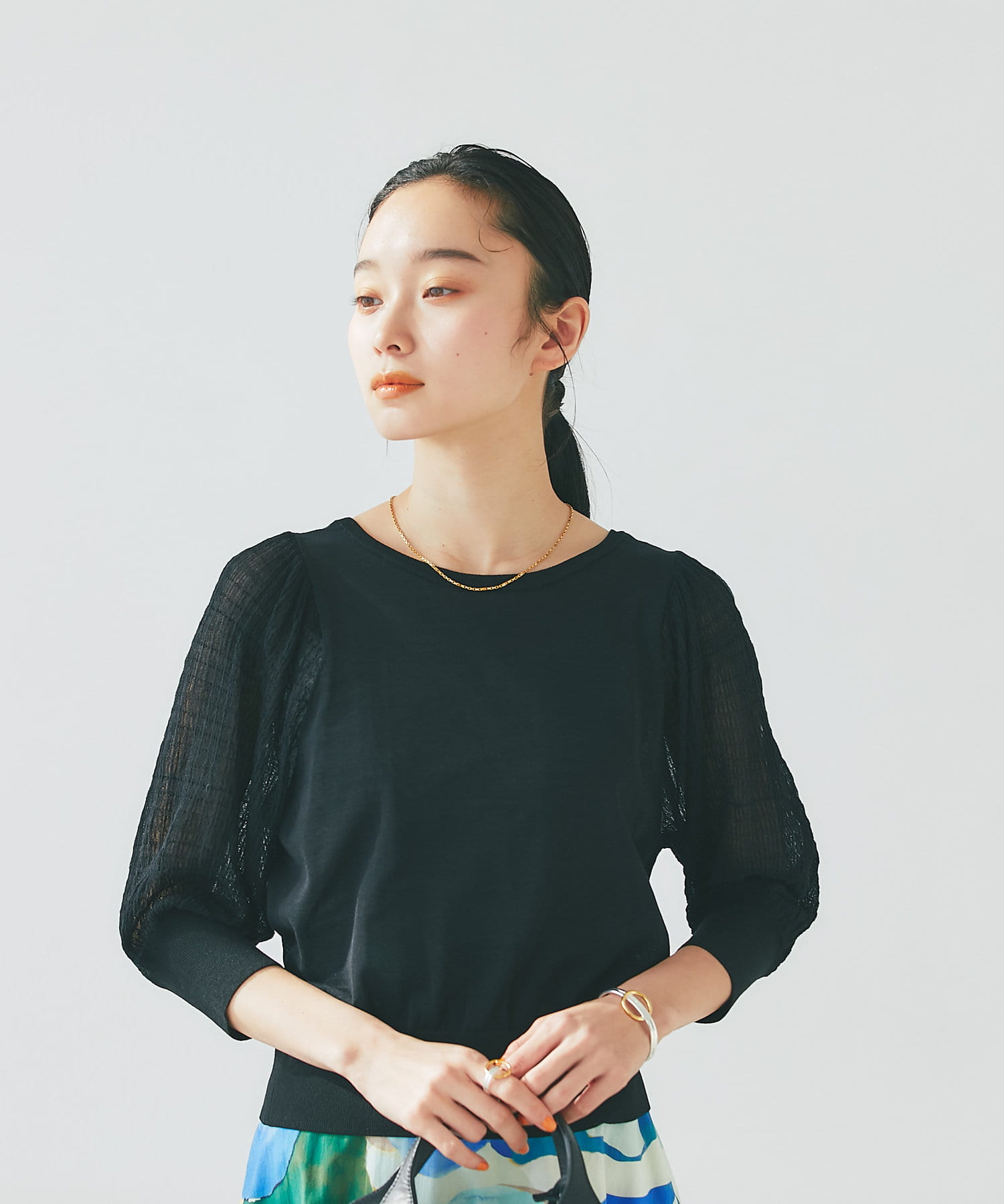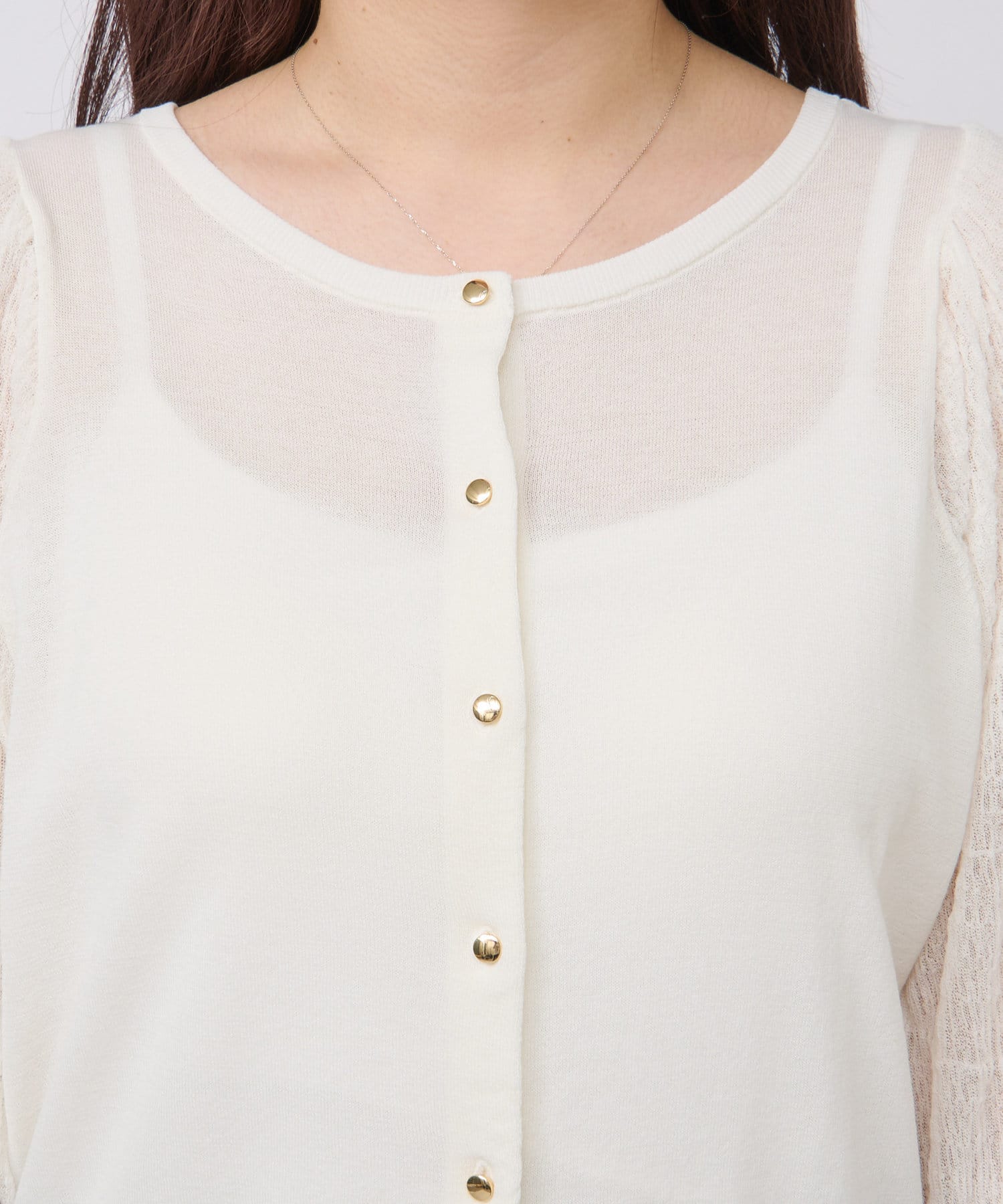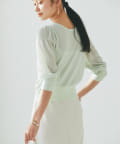 そでのシャーリングと程よい透け感がフェミニンなライトニットカーディガン