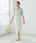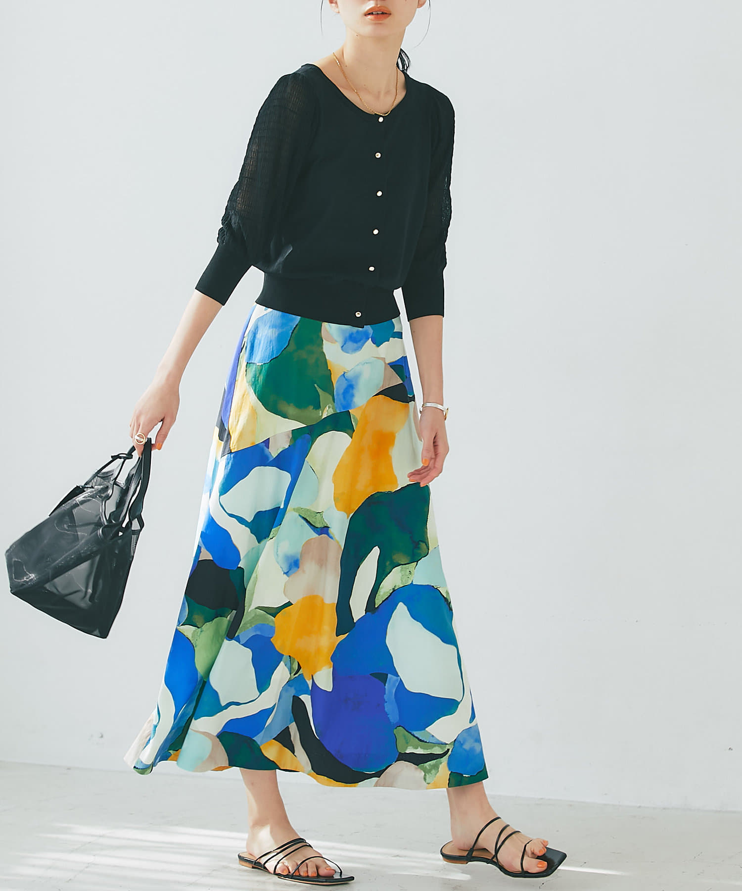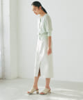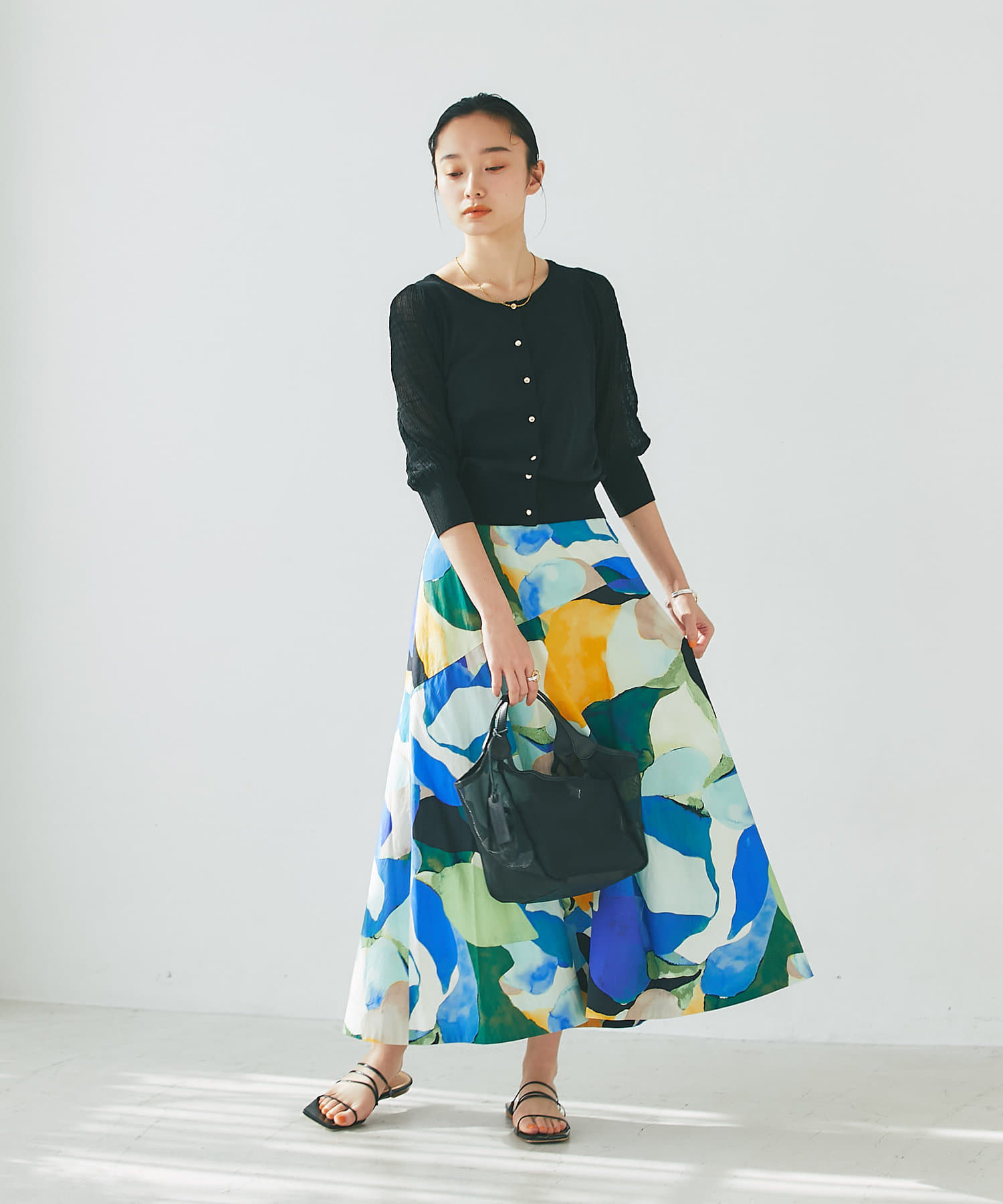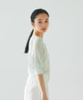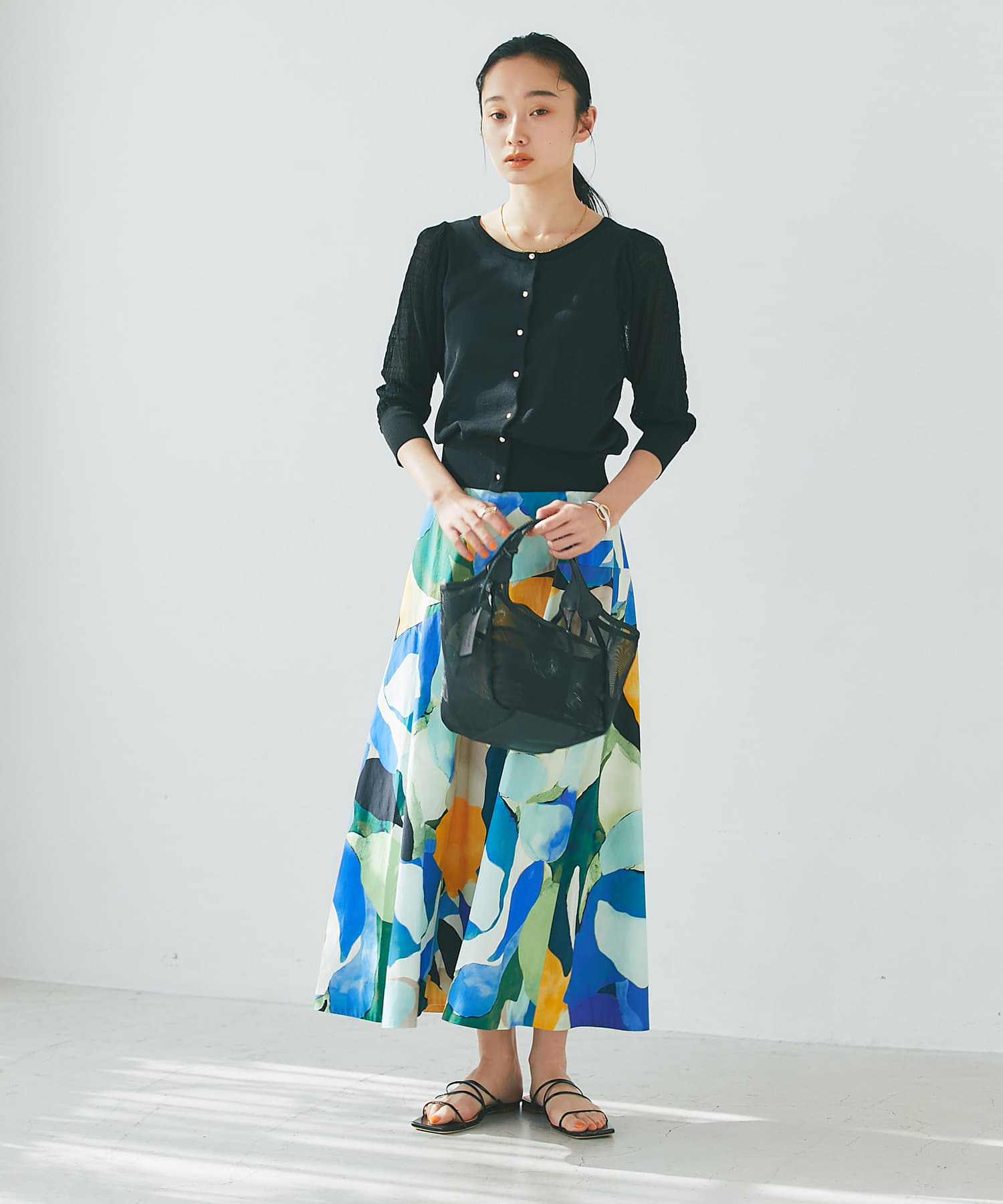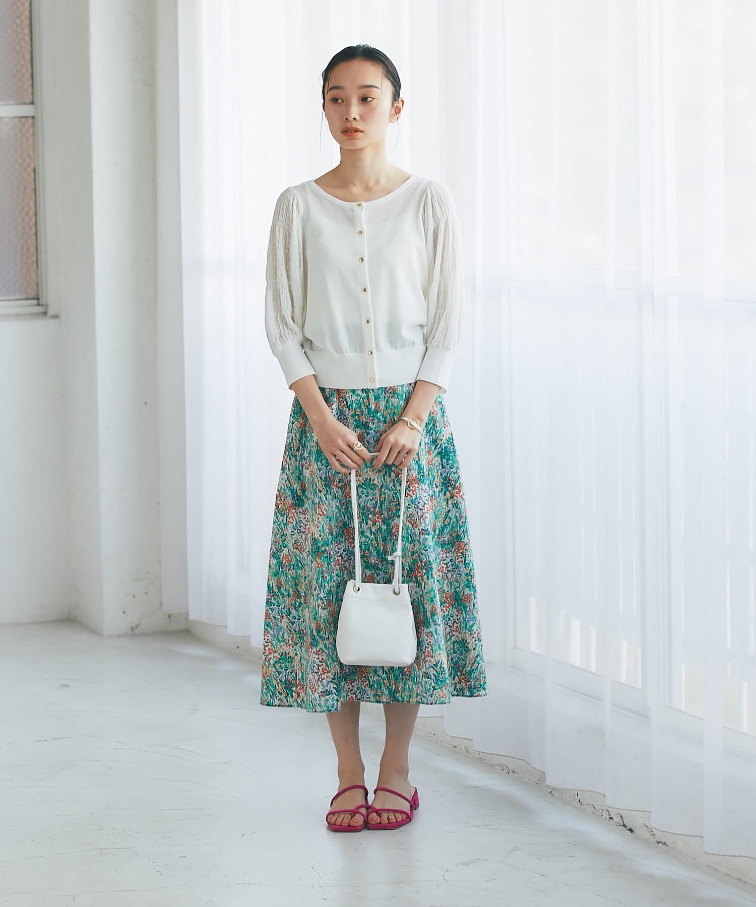 そでのシャーリングと程よい透け感がフェミニンなライトニットカーディガン