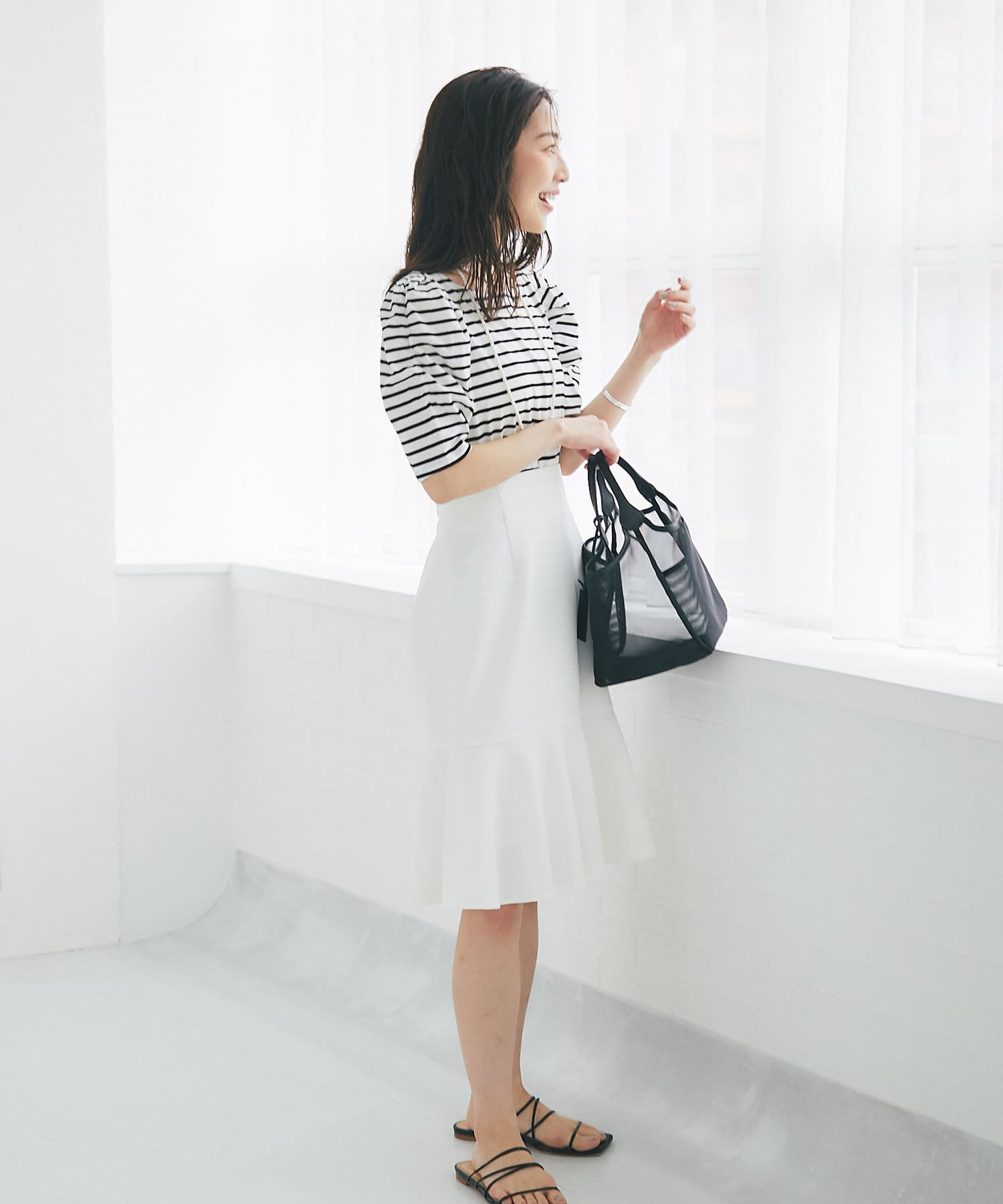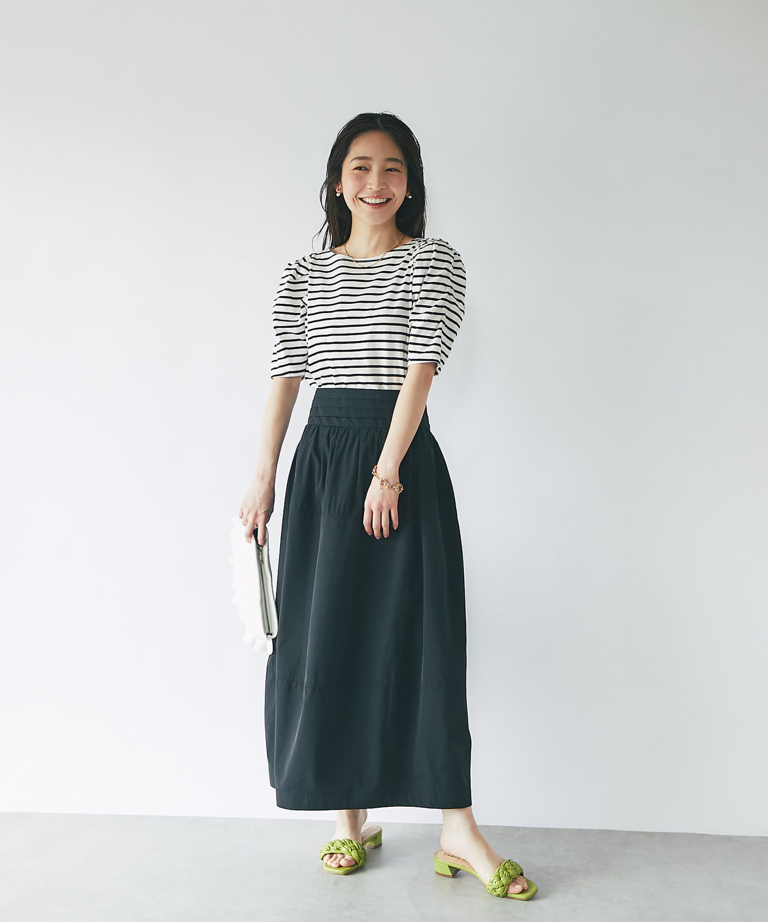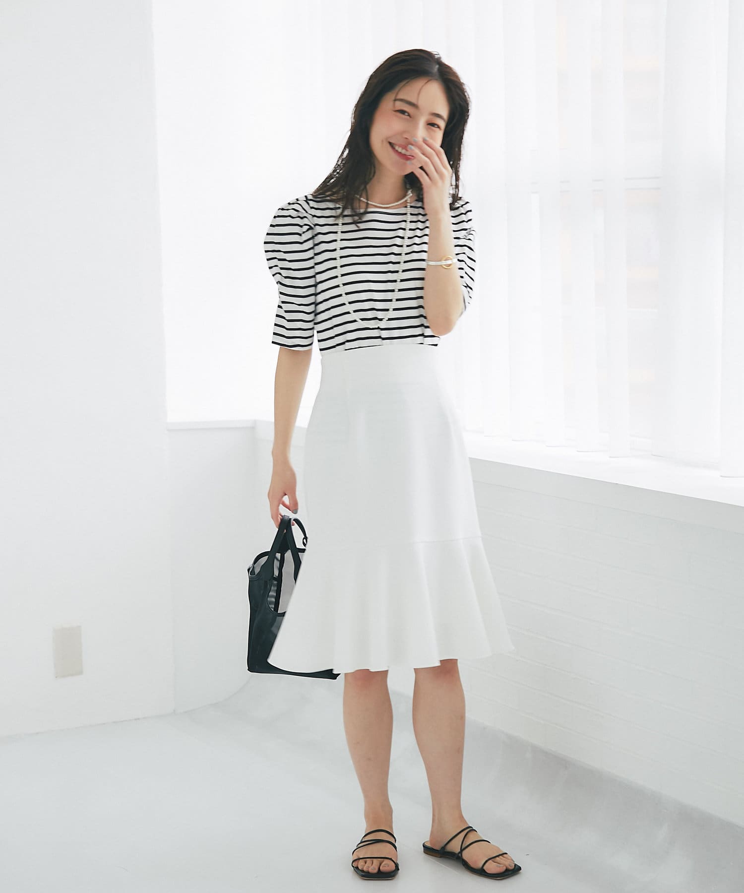 スカートと合わせてフェミニンに着こなすスタイルが特におすすめです。