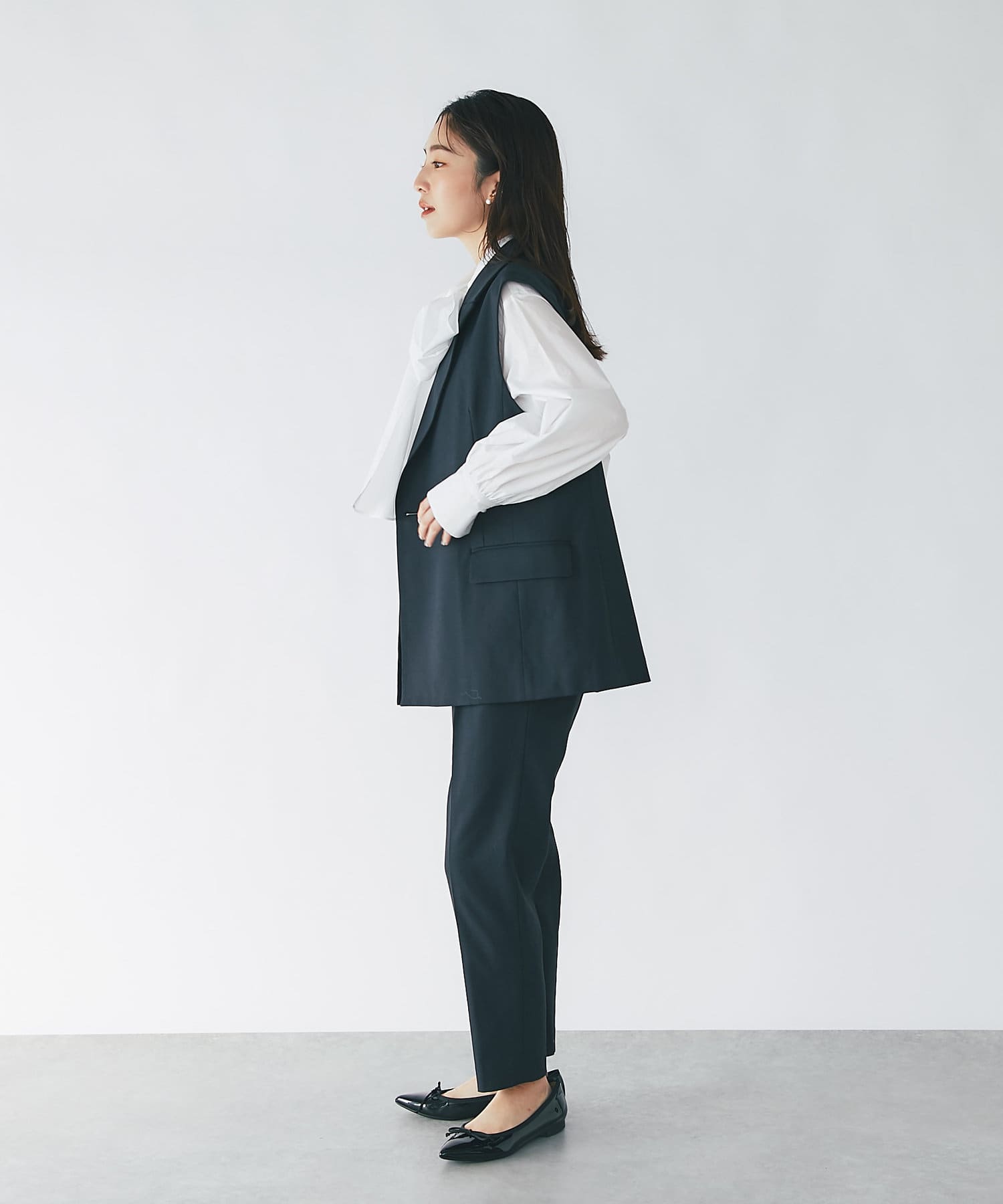 長めの丈感で腰回りをカバーでき、ジレのようにも着用できます。