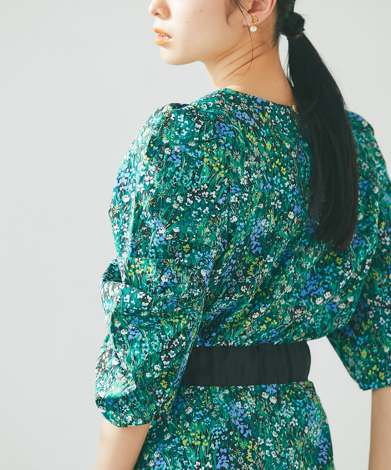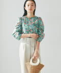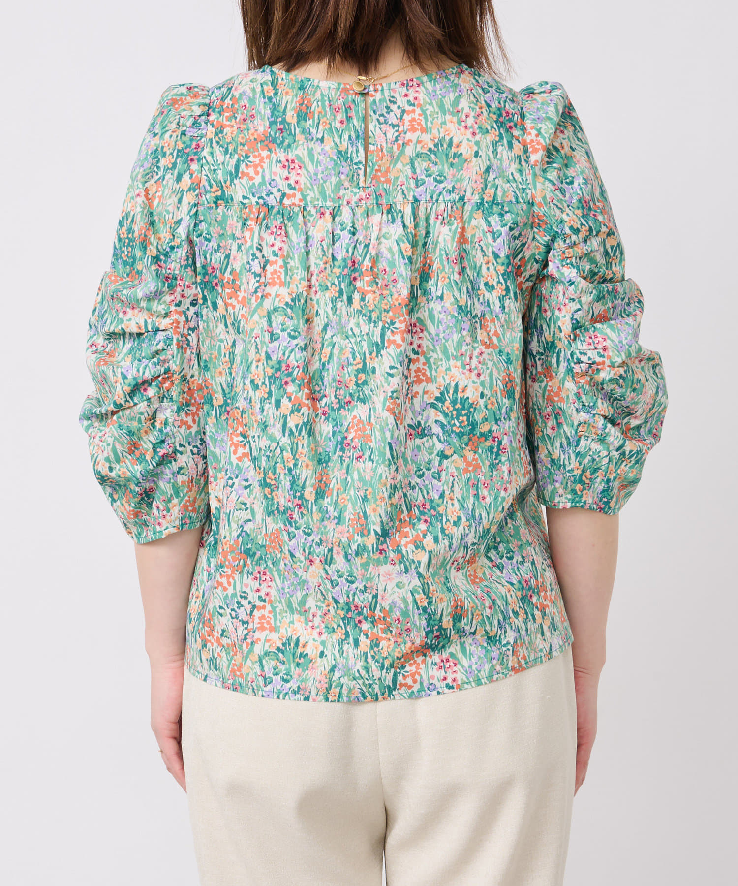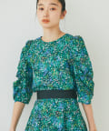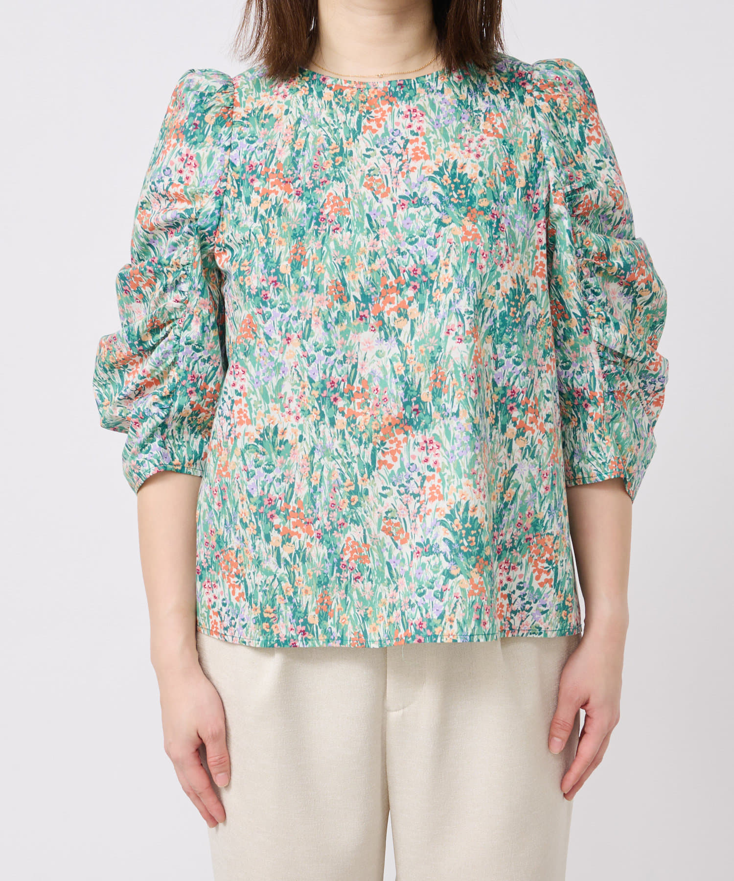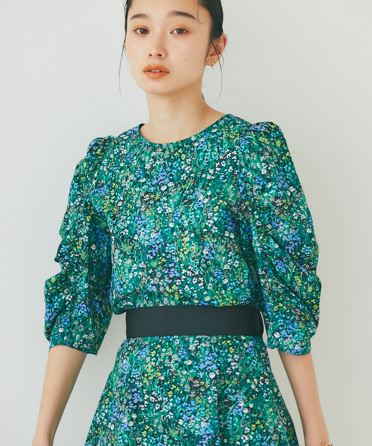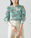 【セットアップ着用可能】フラワープリントギャザースリーブブラウス