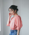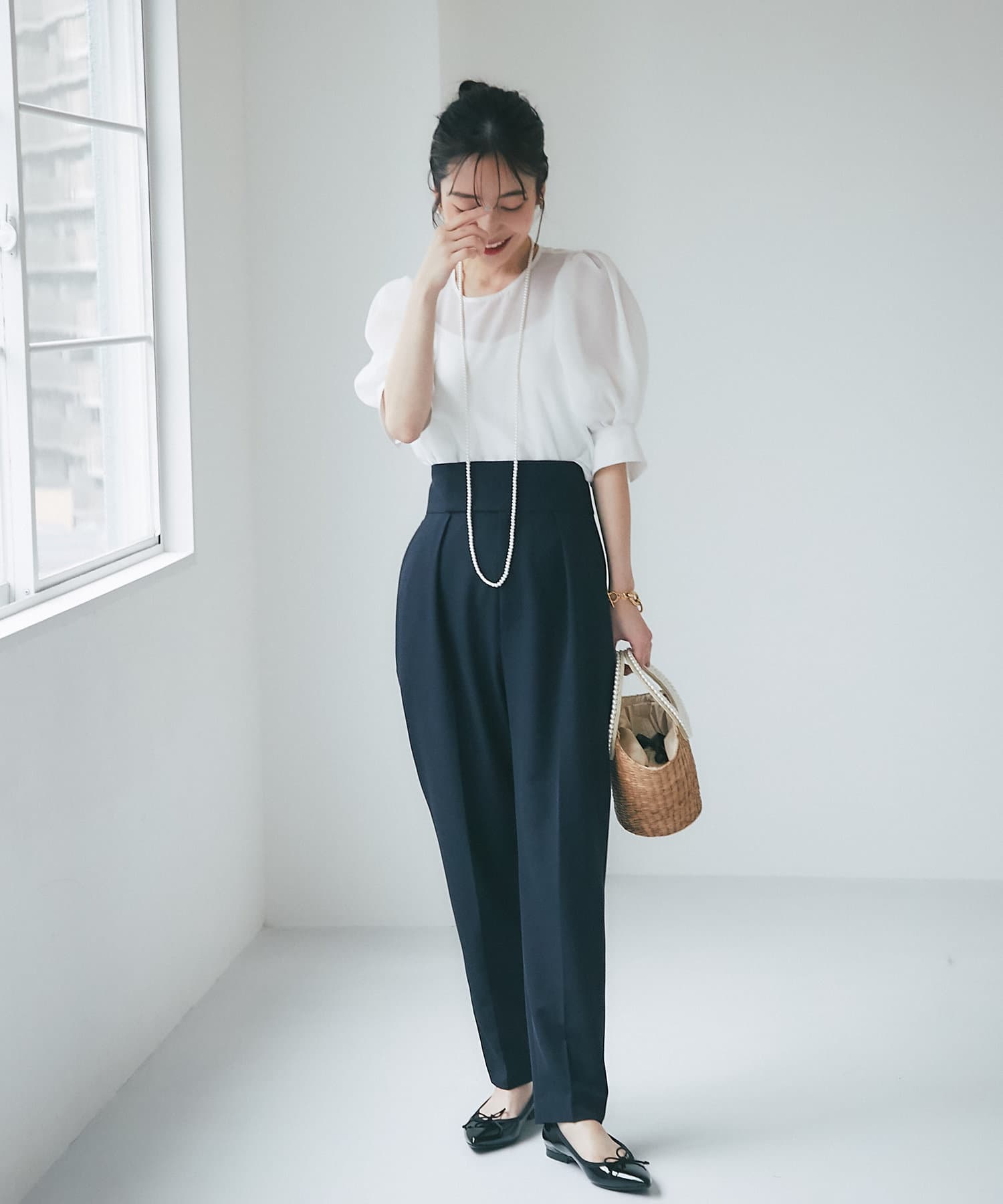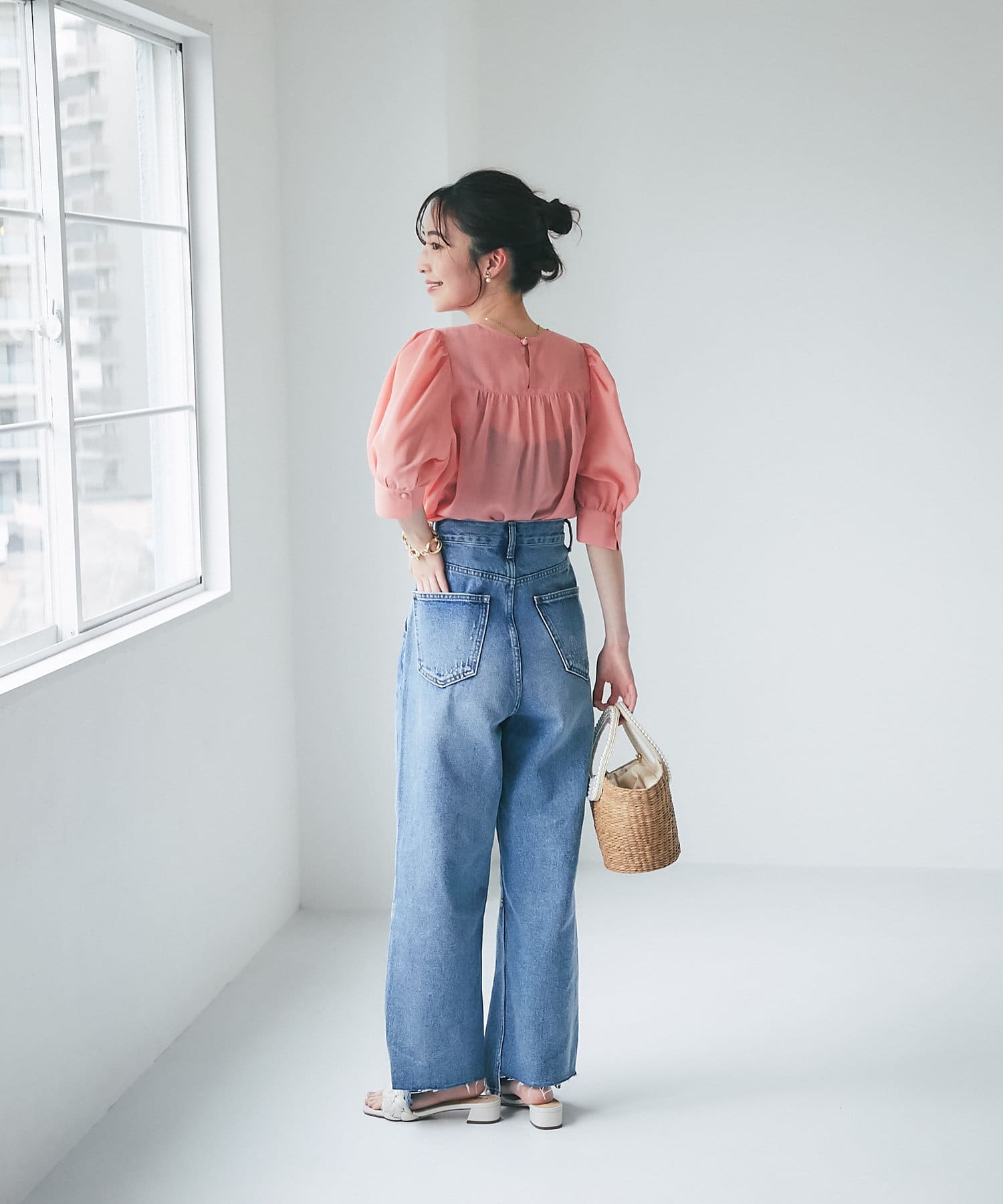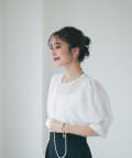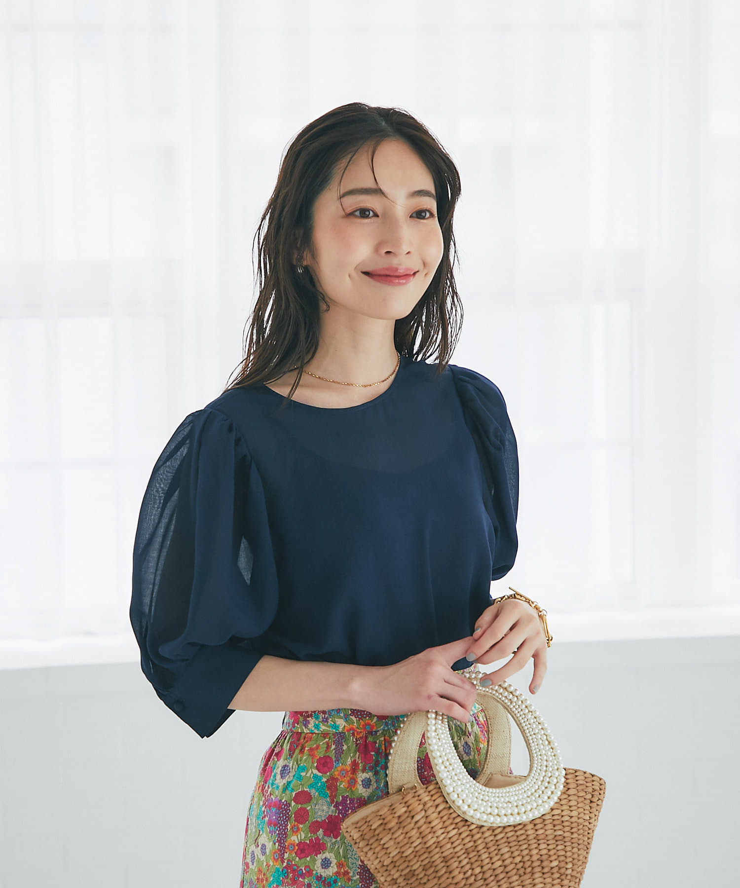 トレンドのシアーブラウスを、ボリュームスリーブデザインでボンボン流に大人可愛く仕上げました。