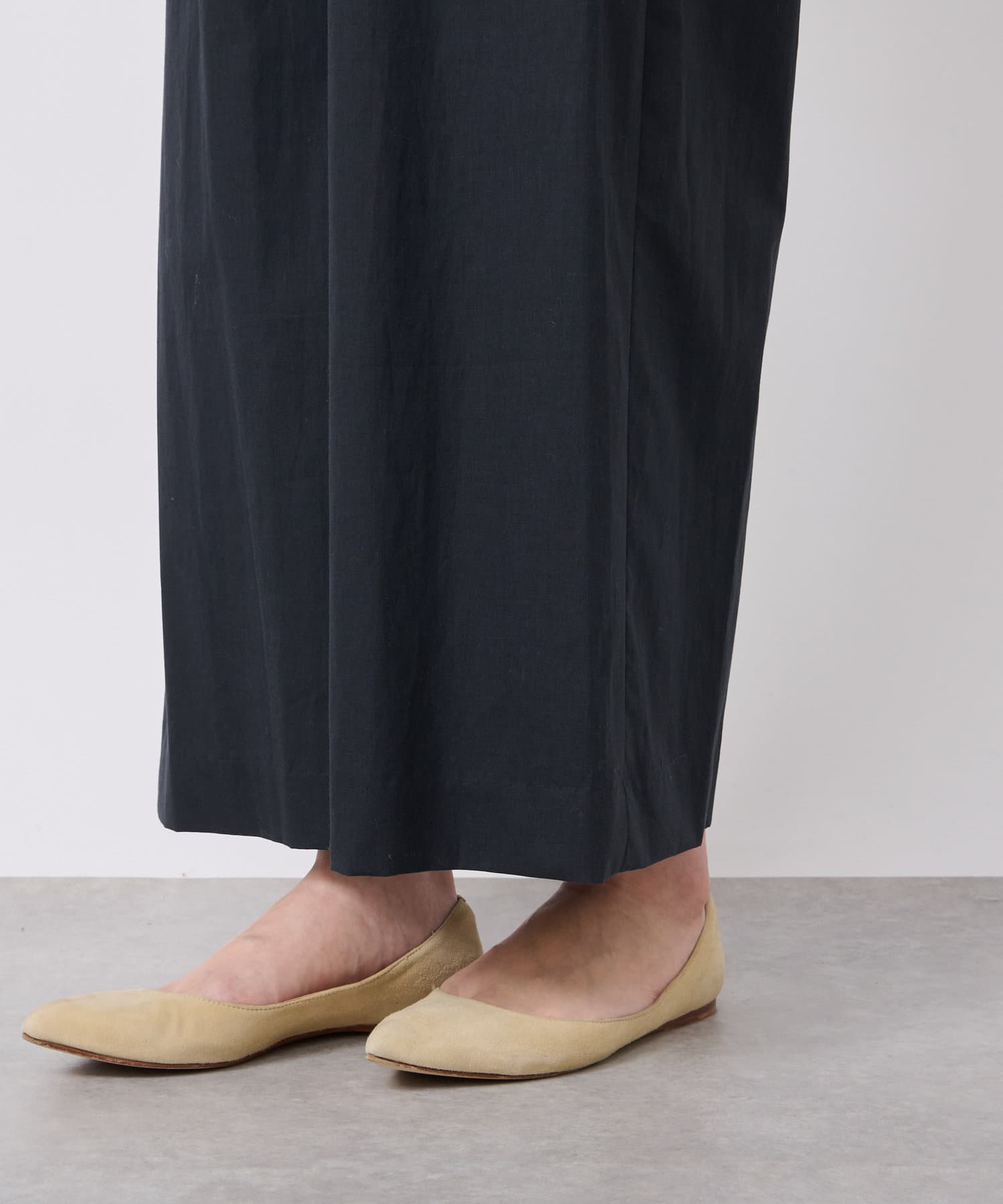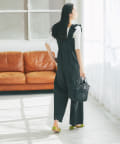 ワイドパンツシルエットにハイウエスト切り替えでスタイルアップ効果も。