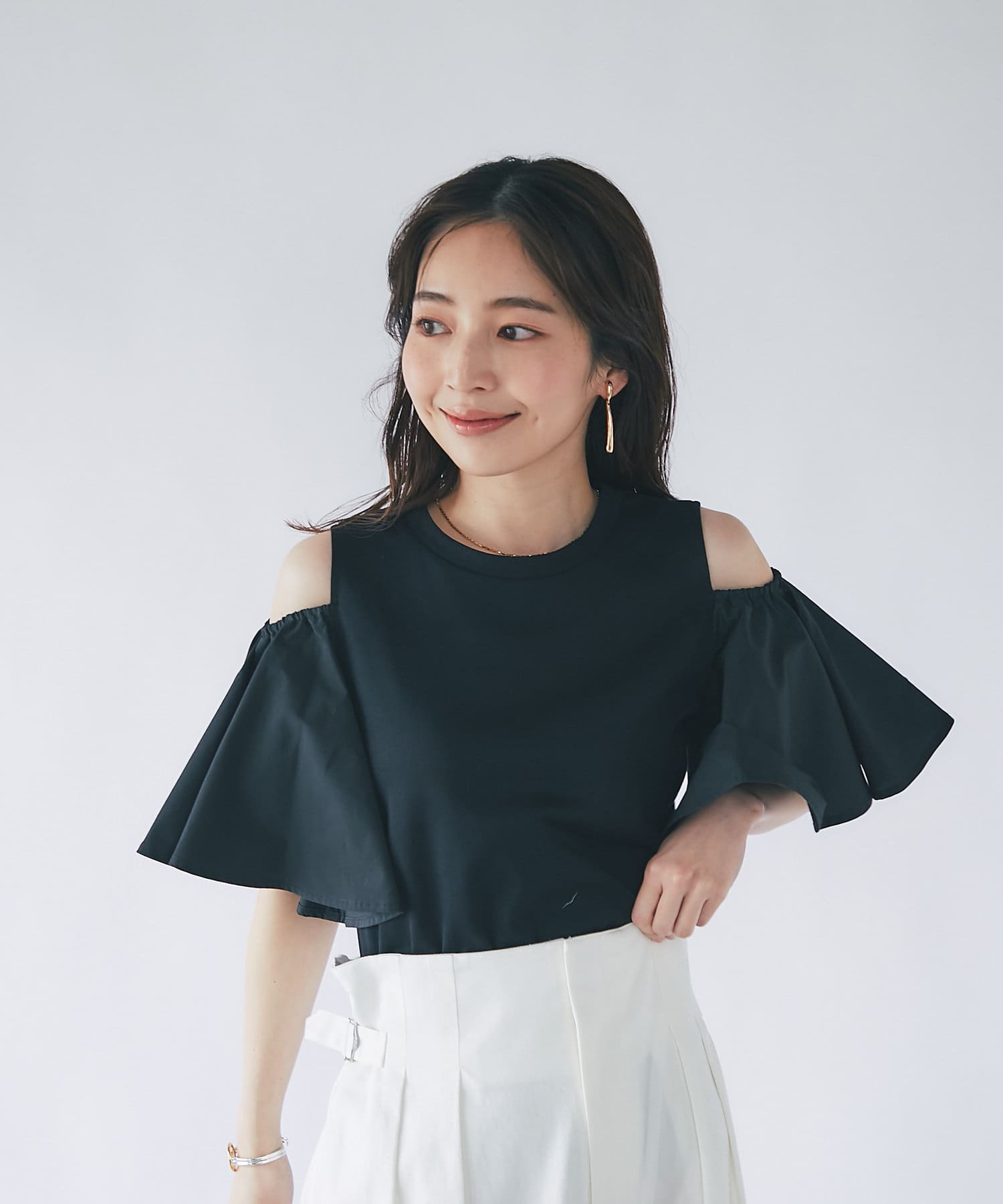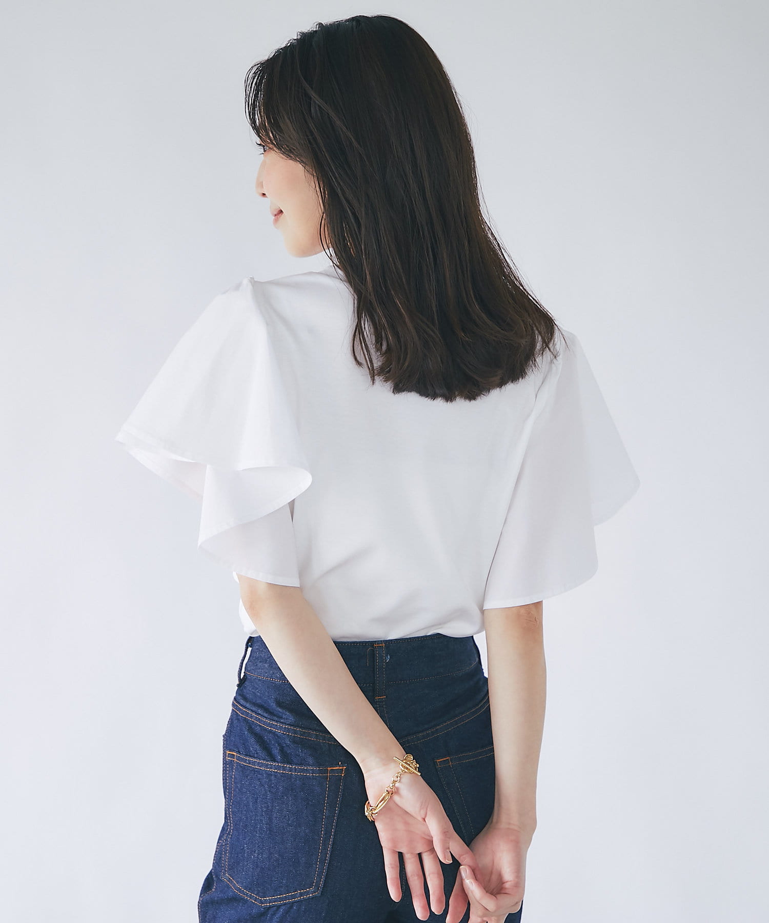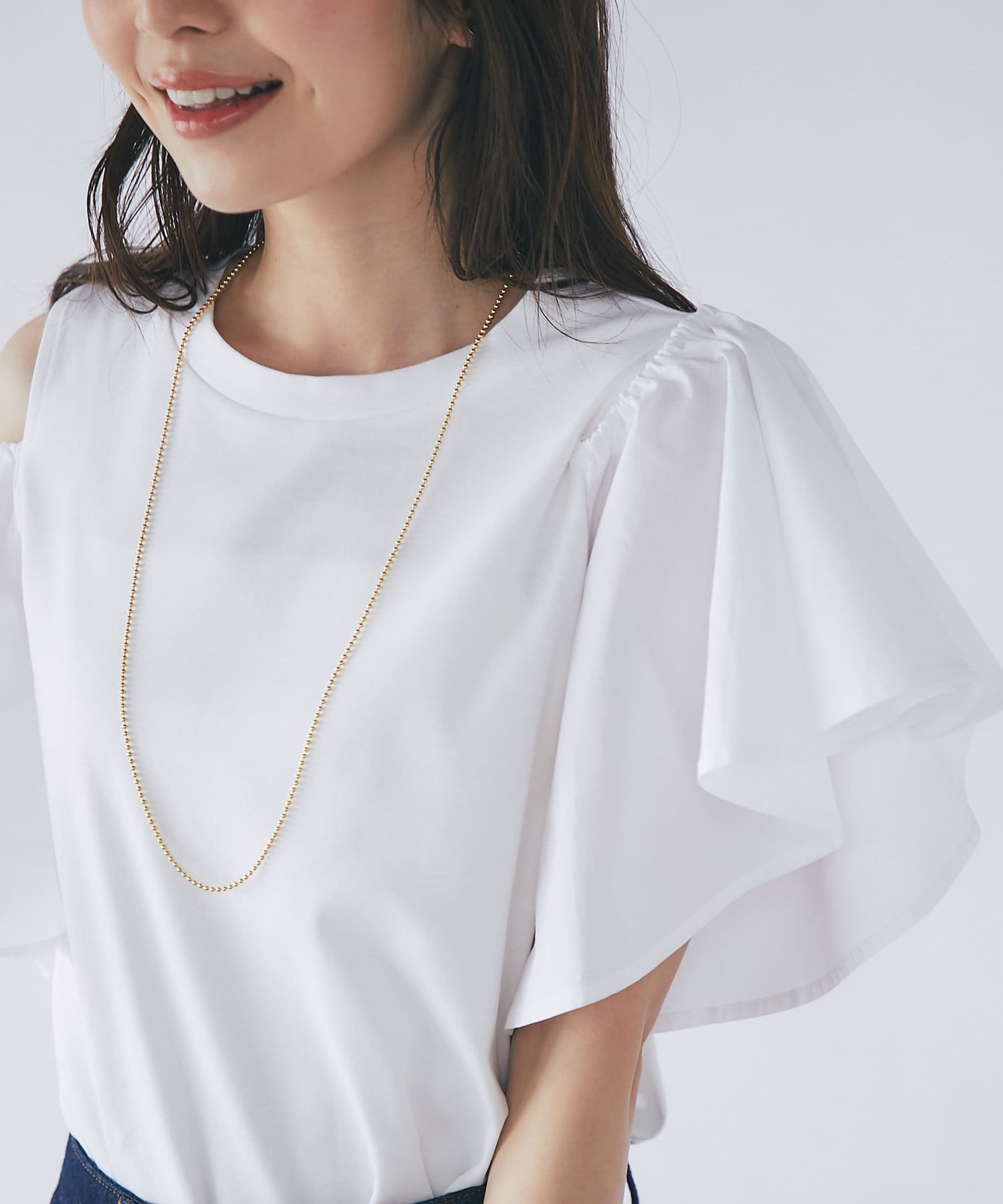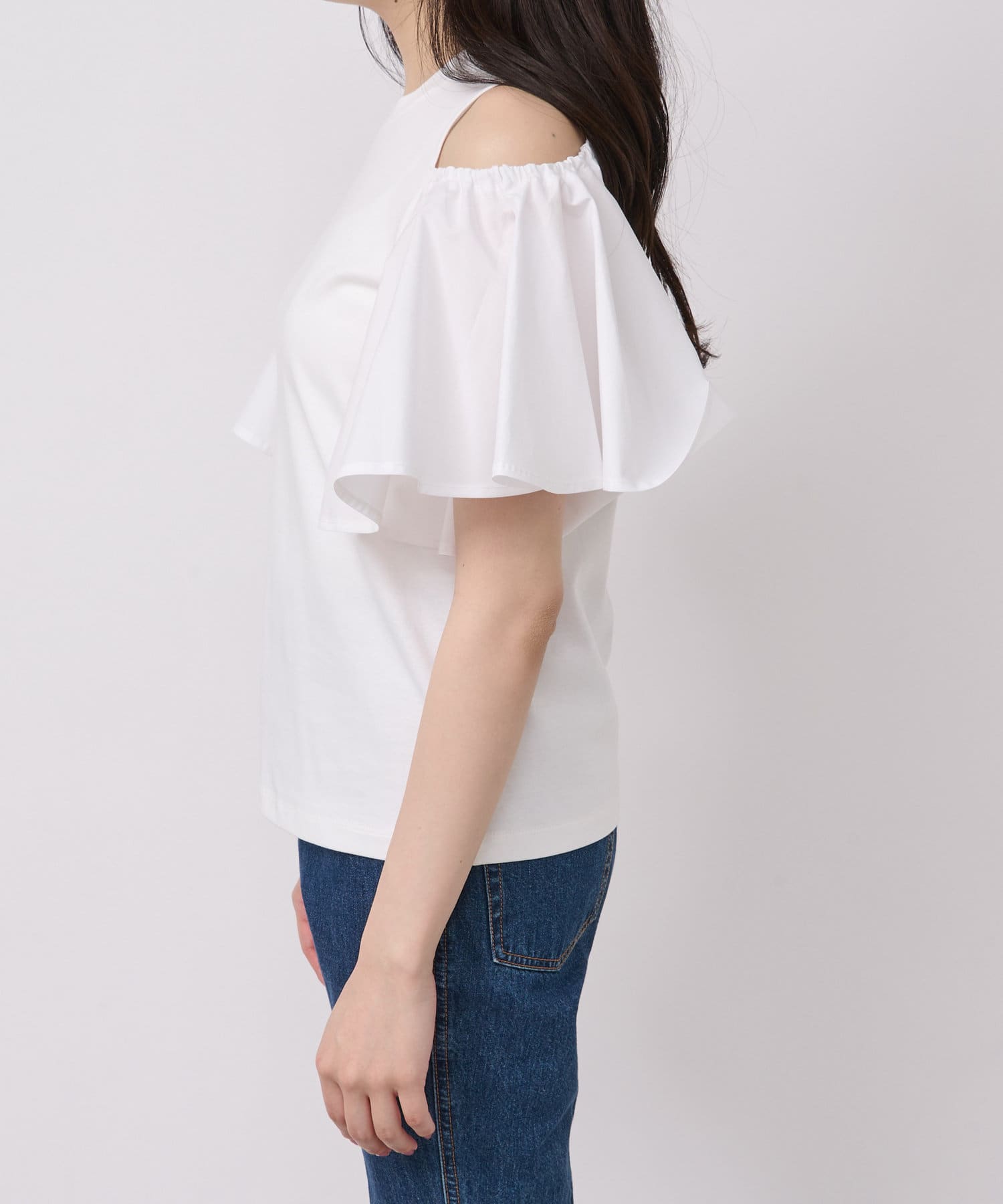 ラッフルスリーブのふわっとしたシルエットが目を引くカットソー