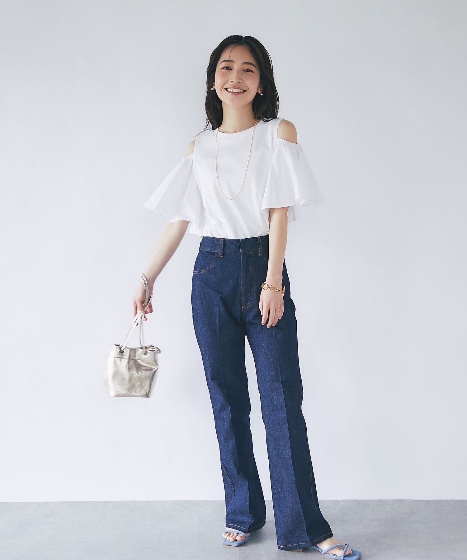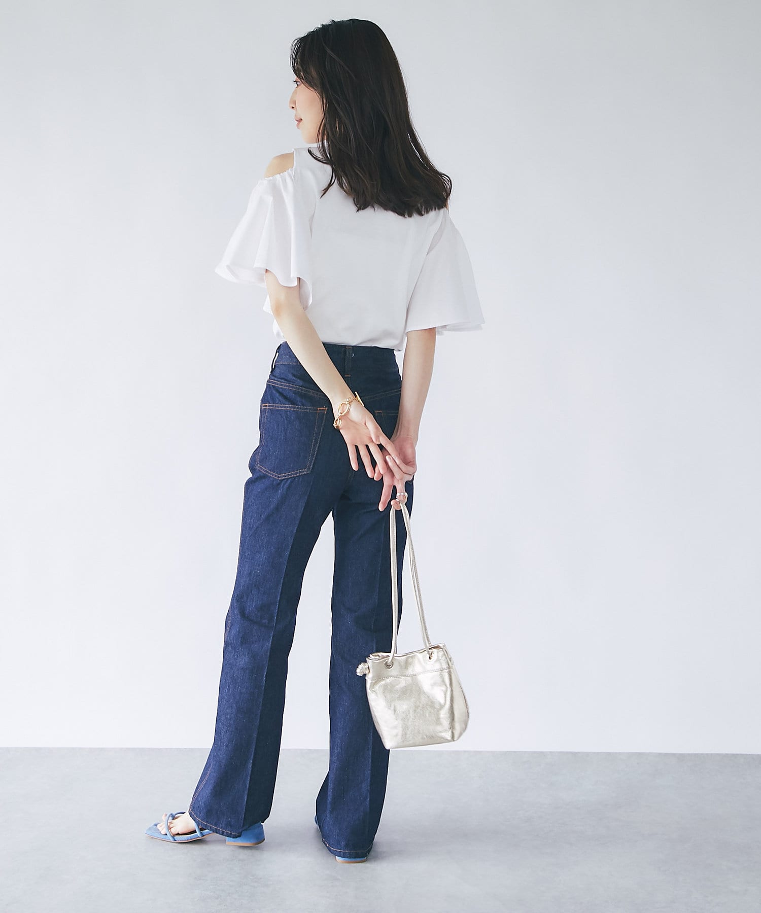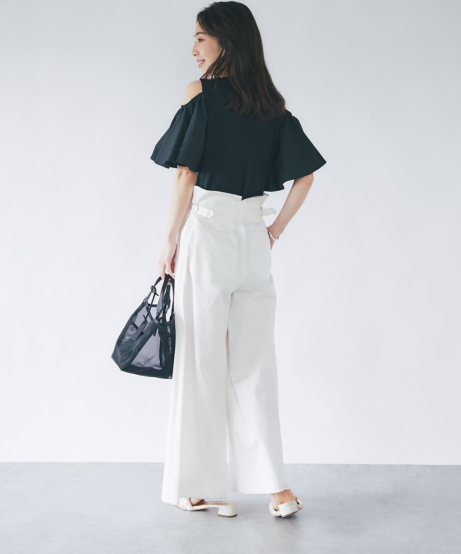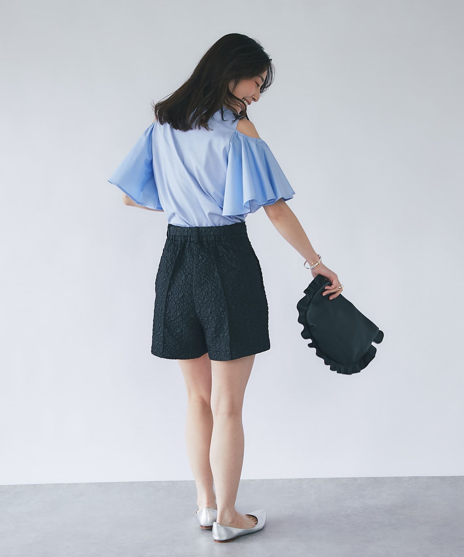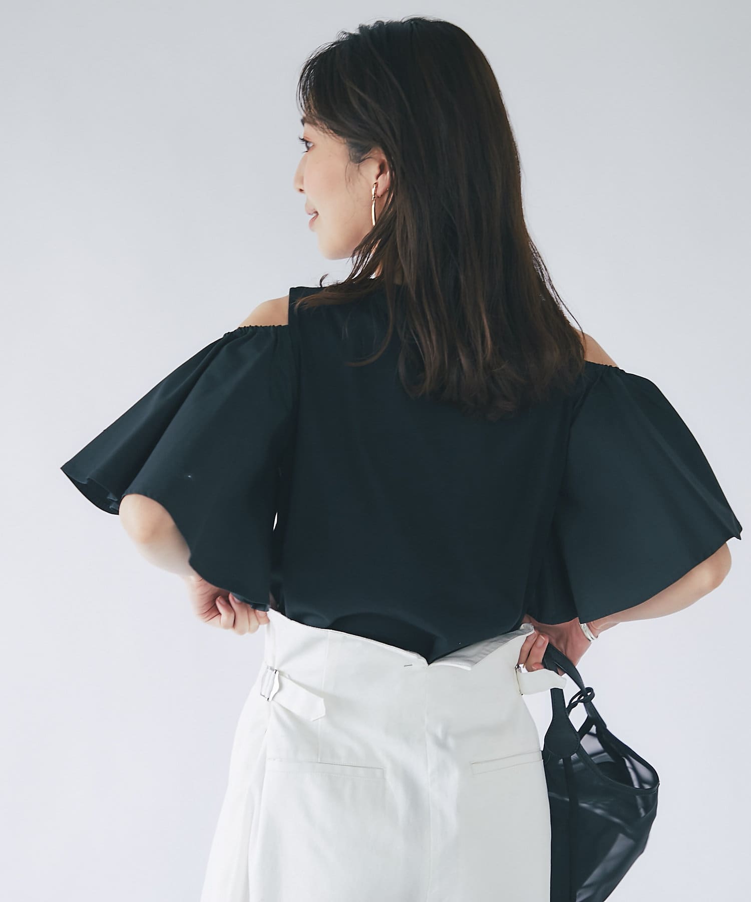袖のボタンをはずしてオープンショルダーとして肌見せを楽しめます。