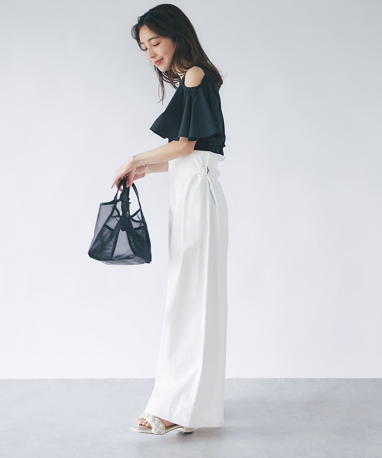 #大人カジュアル #きれいめカジュアル #Tシャツ #クルーネック #ベーシック #ベーシックカラー #上品カジュアル #スタイルアップ #大人女子 #モテ女子 #モテコーデ #モテ服 #シンプル #デイリーユース #オンスタイル #オフィスカジュアル #無地 #異素材 #ラッフル #オープンショルダー