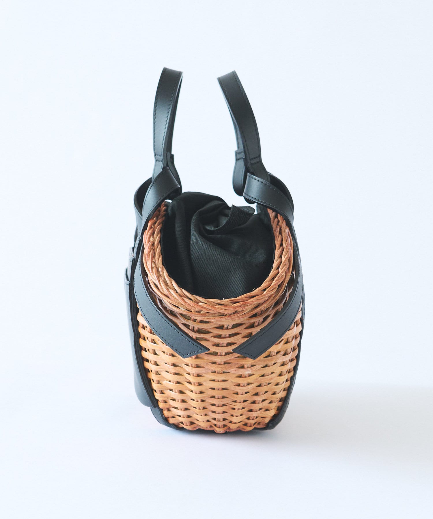 リボンのようなレザーハンドルが可愛いかごバッグ