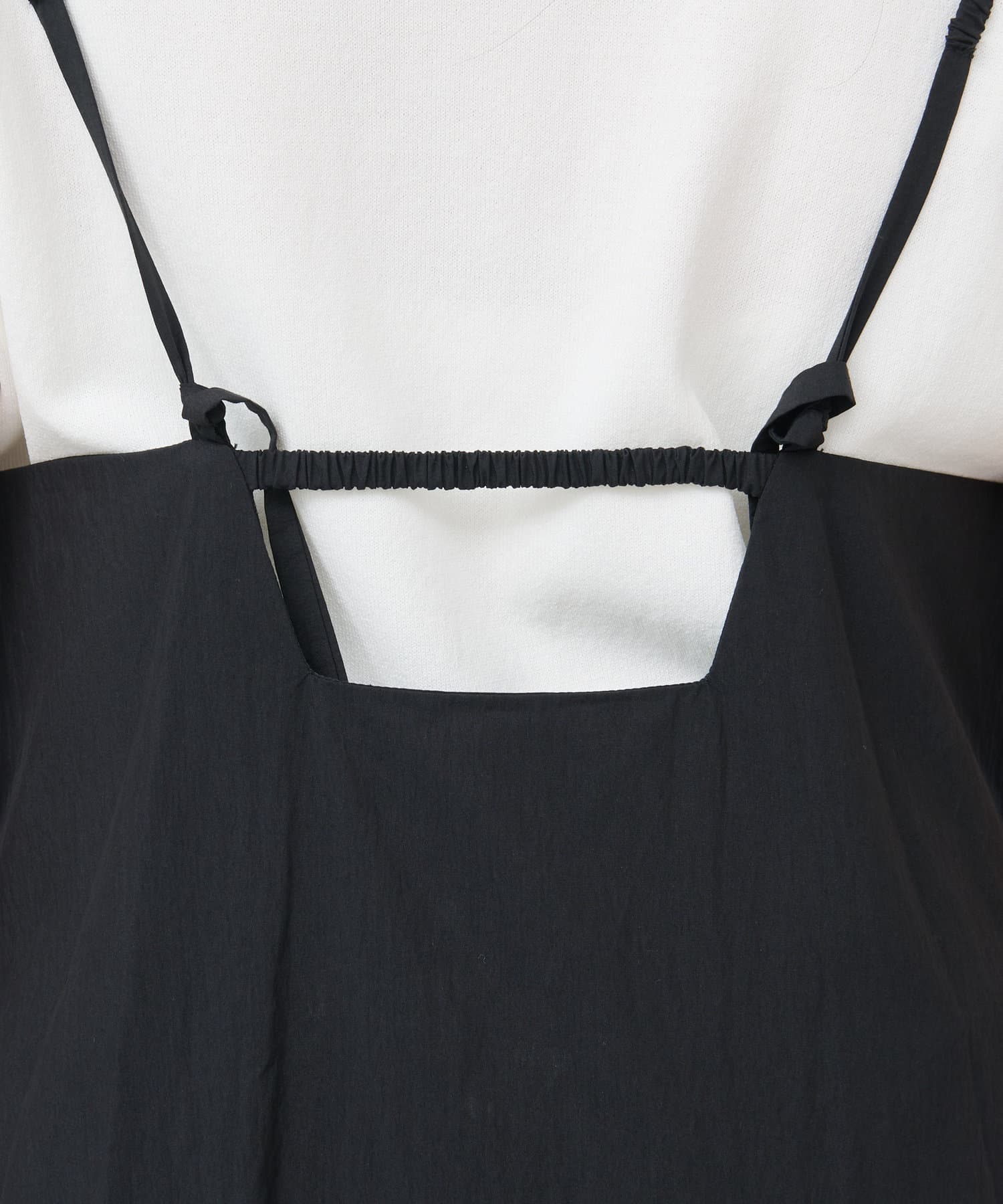ギャザーの入った肩紐と後ろのギャザー紐もデザインのポイントになっています。
