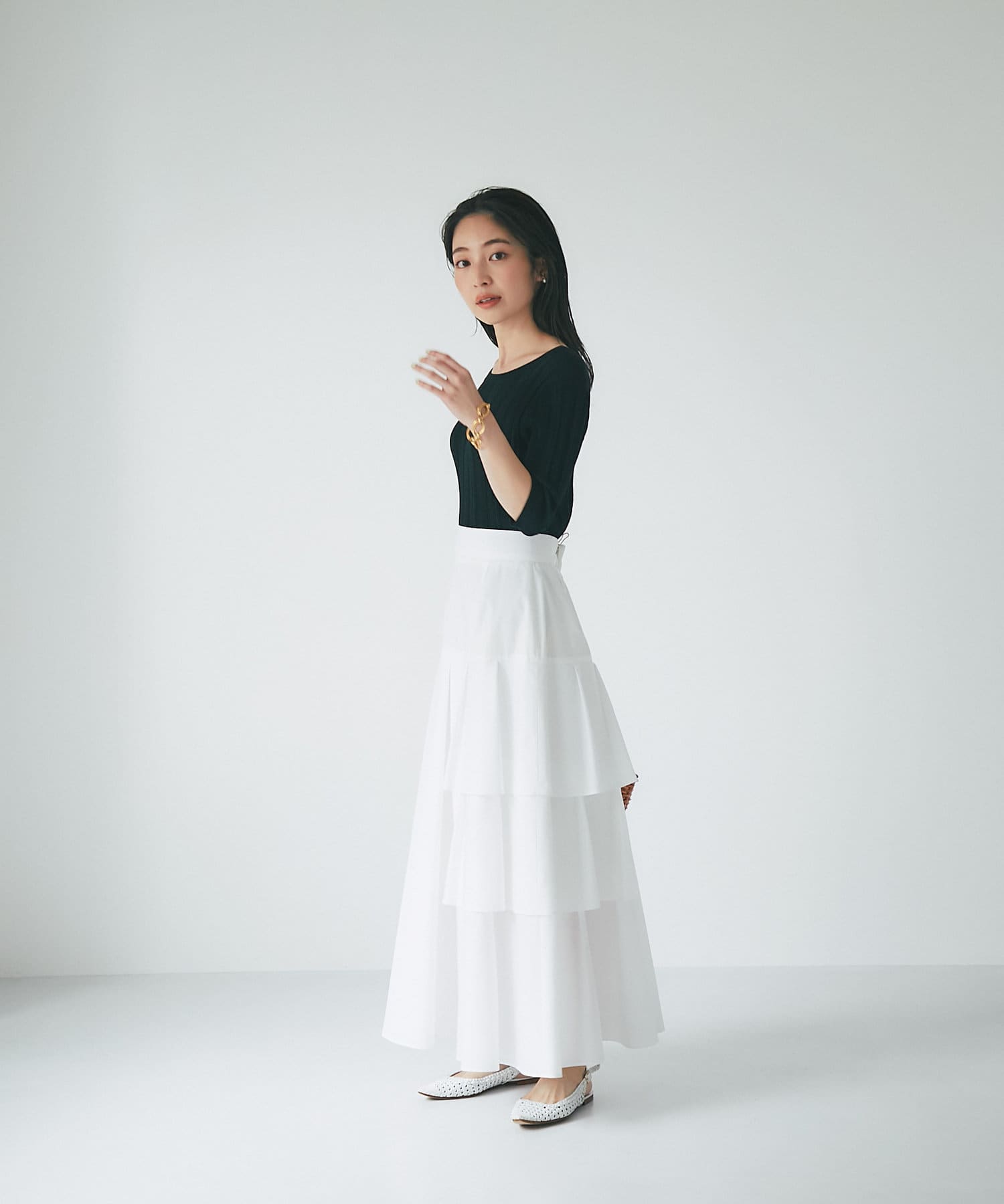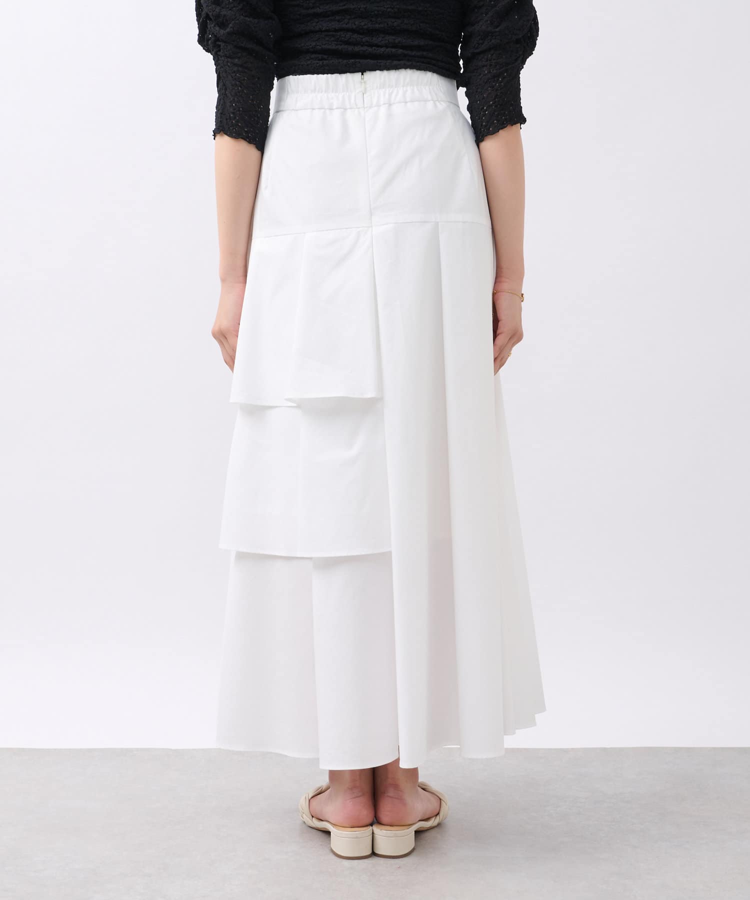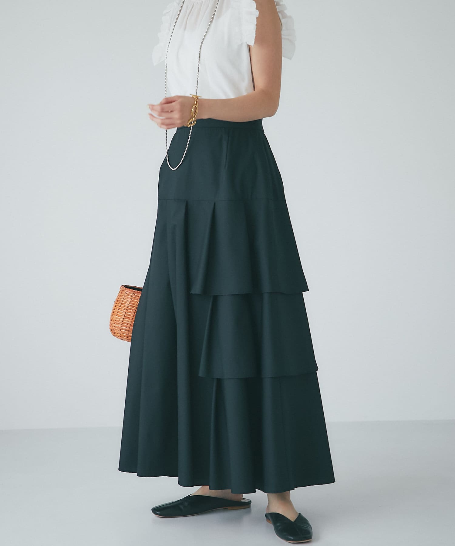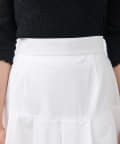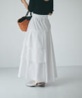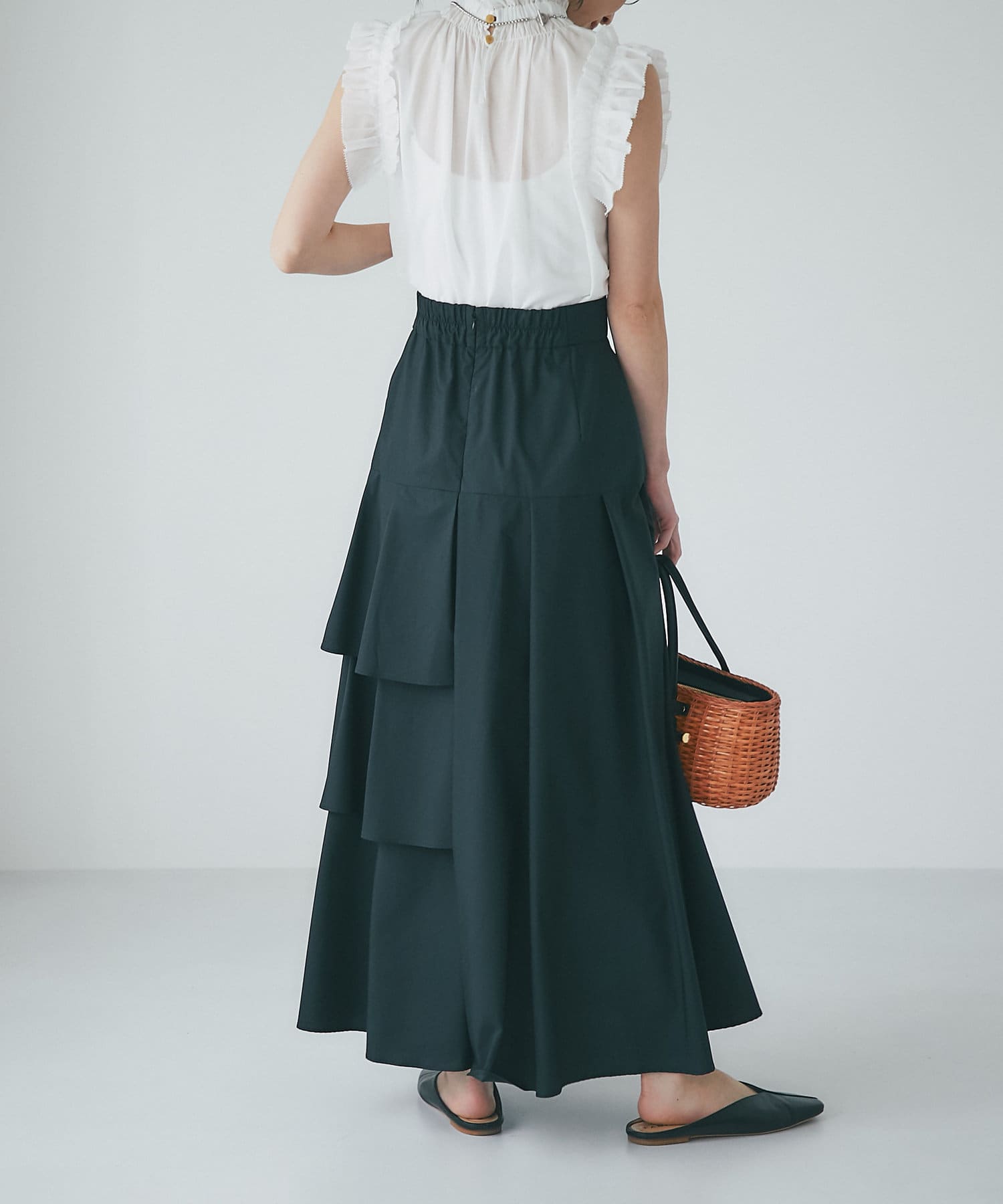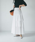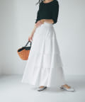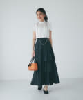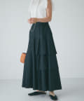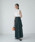 ハリのある素材でタックは立体的に、動くと揺れるティアード裾がフェミニンです。