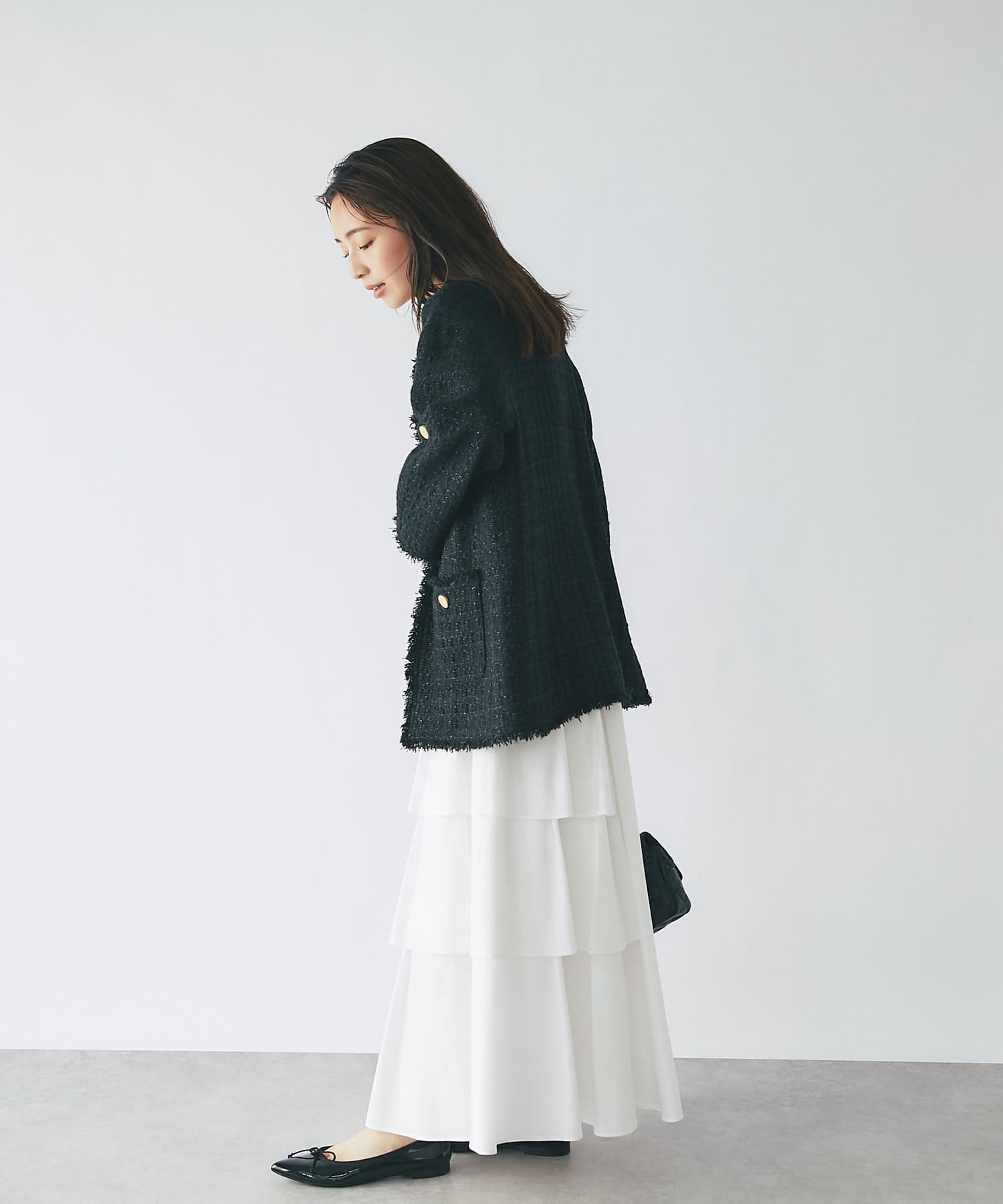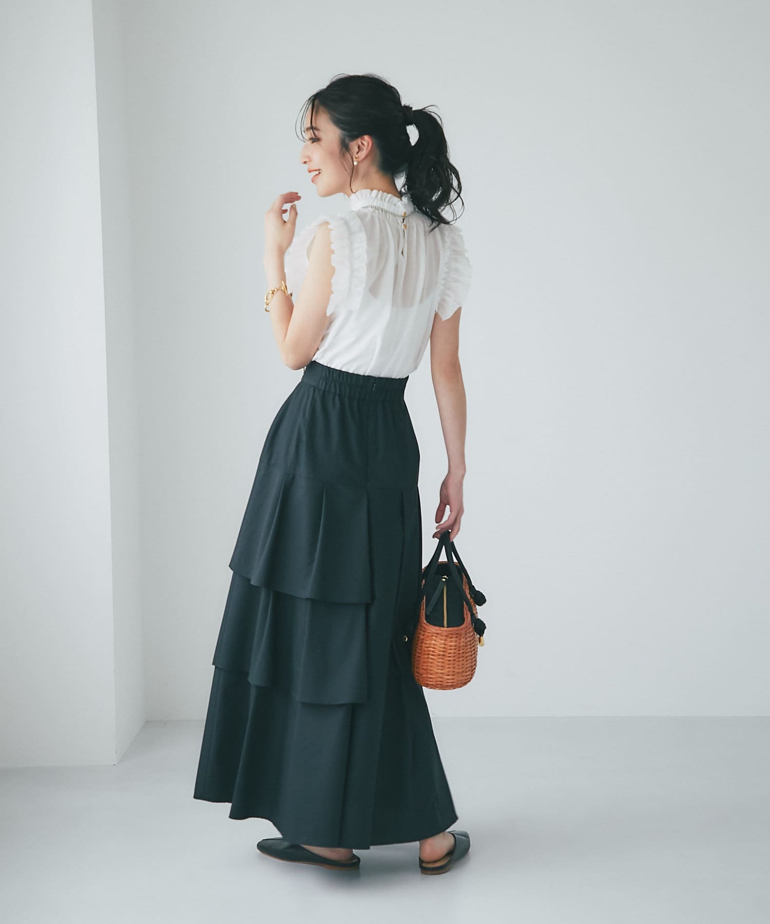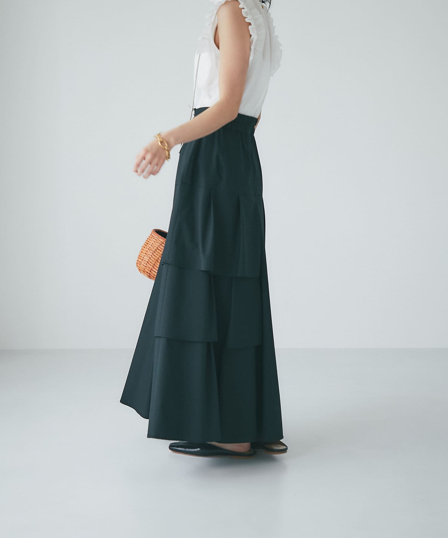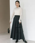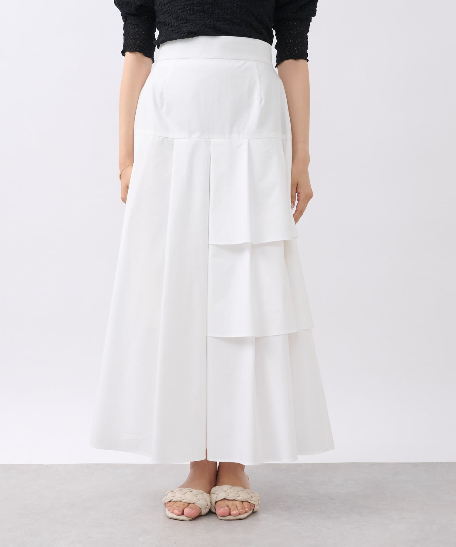 ハリのある素材でタックは立体的に、動くと揺れるティアード裾がフェミニンです。