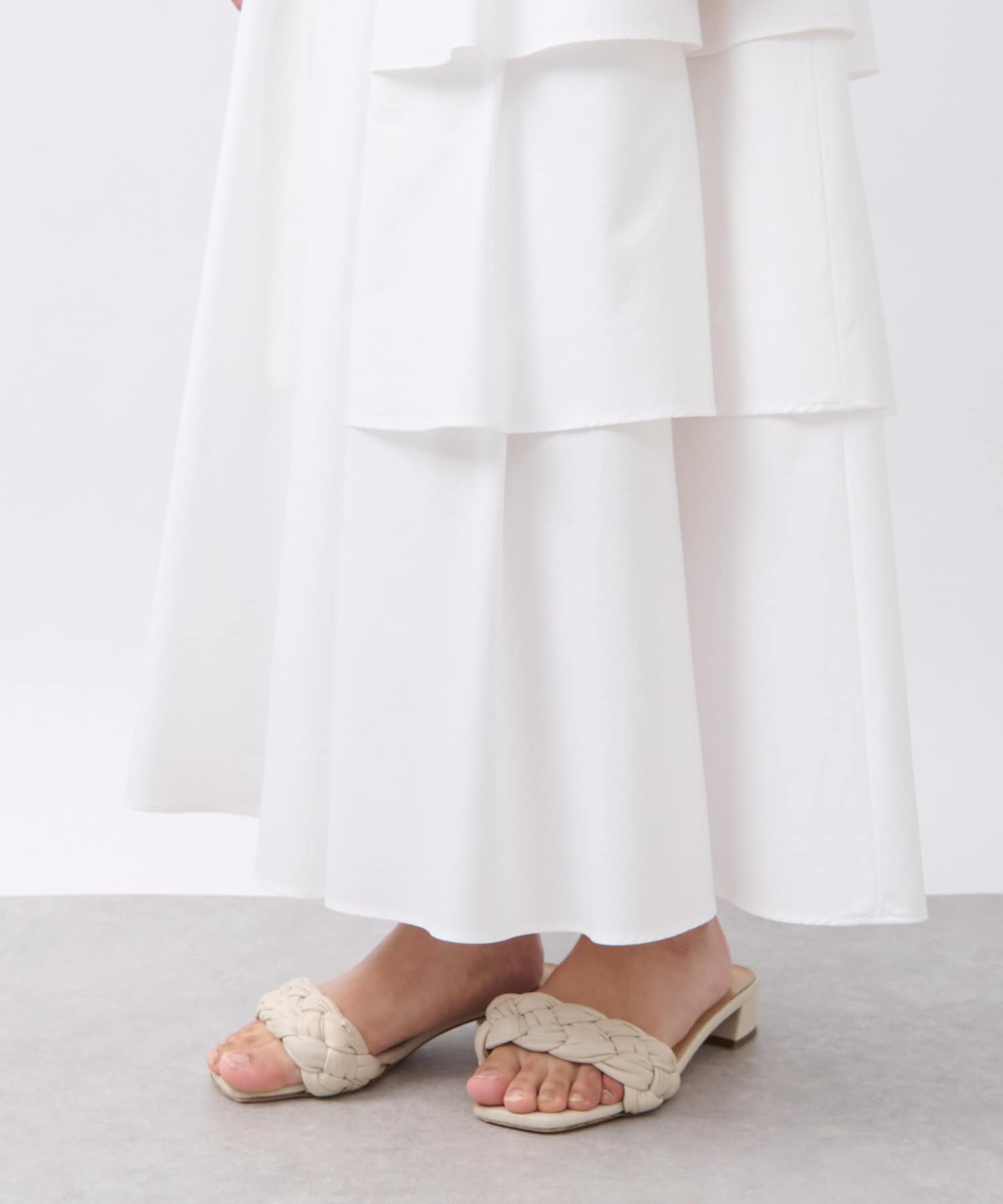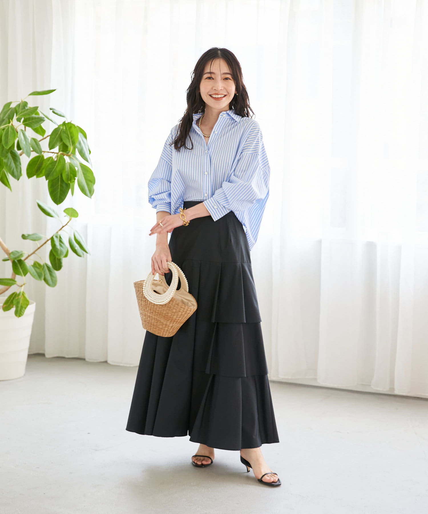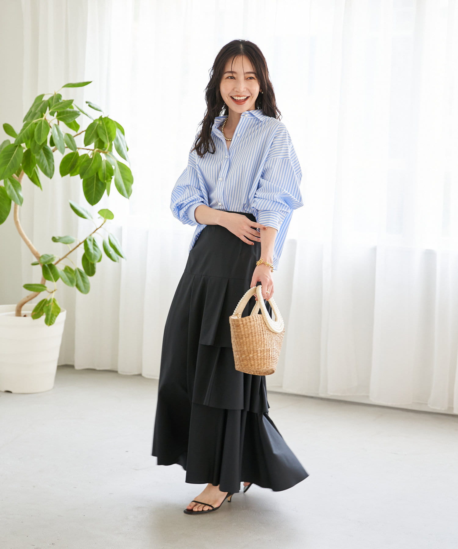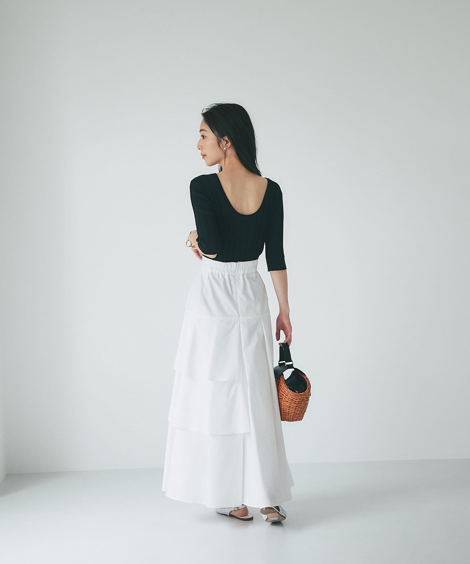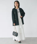 ハリのある素材でタックは立体的に、動くと揺れるティアード裾がフェミニンです。