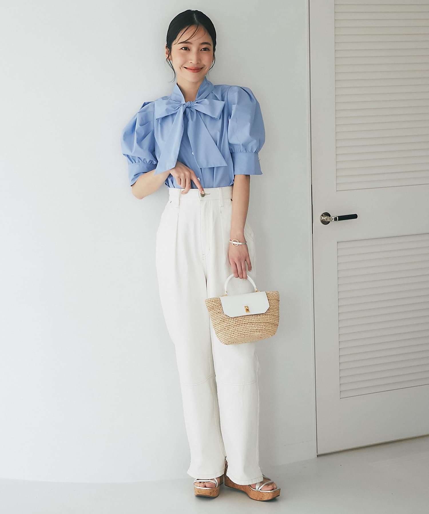 #大人カジュアル #きれいめコーデ #上品カジュアル #上品 #ボウタイ #無地 #リボン #パール #ブラウス #パフスリーブ #トレンド #オケージョン #華やか #きちんと見え #モテ女子 #モテ服 #スタイルアップ #ベーシックカラー #デザインブラウス #大人女子 #大人ガーリー