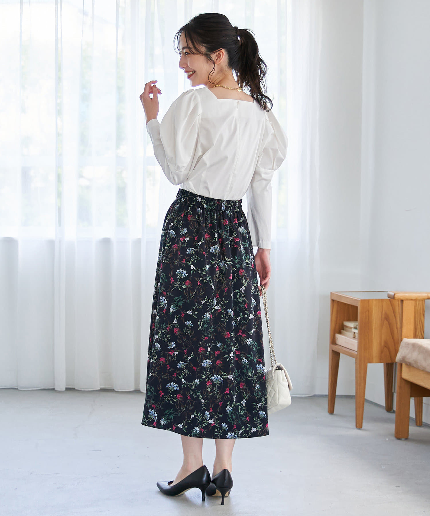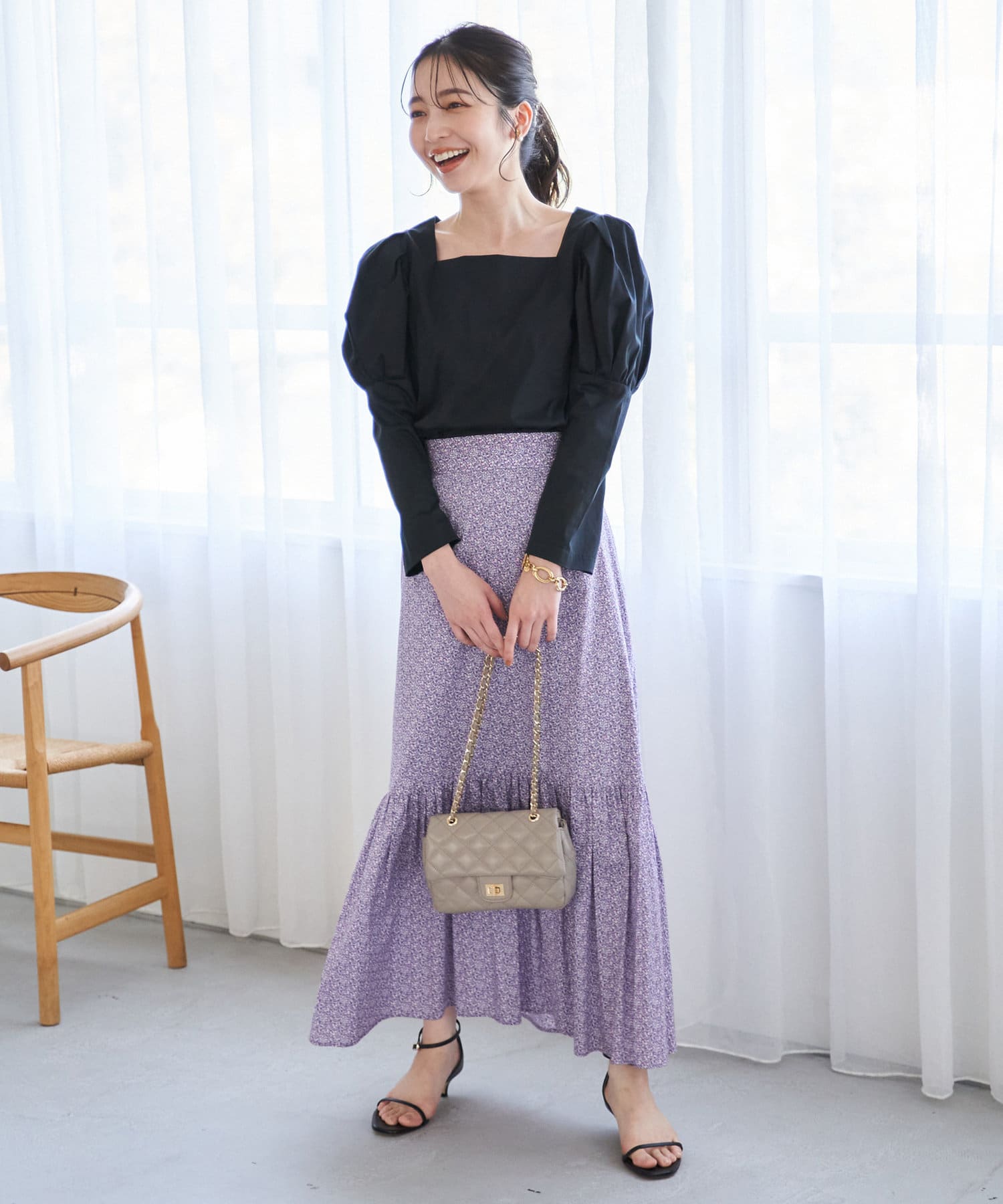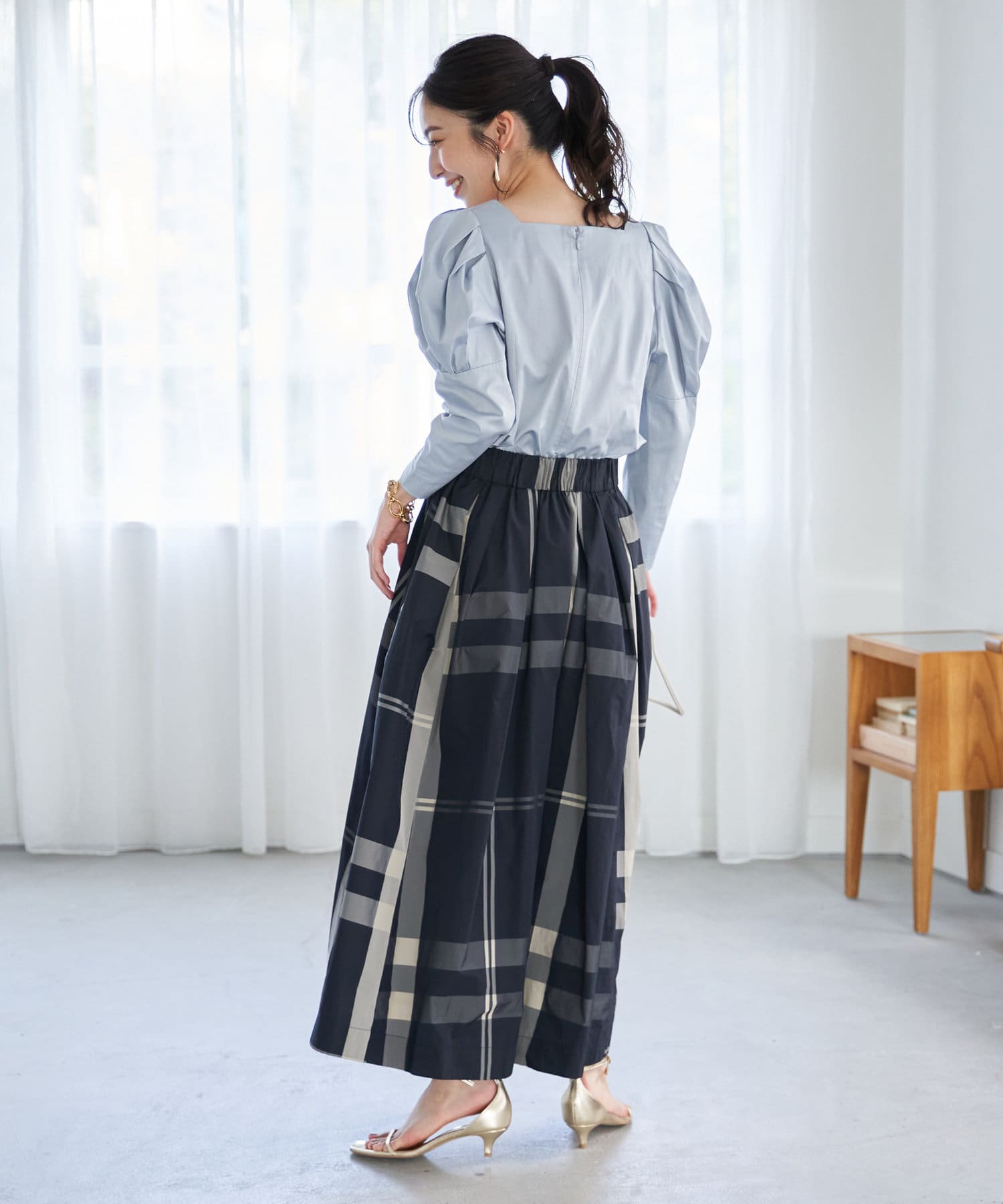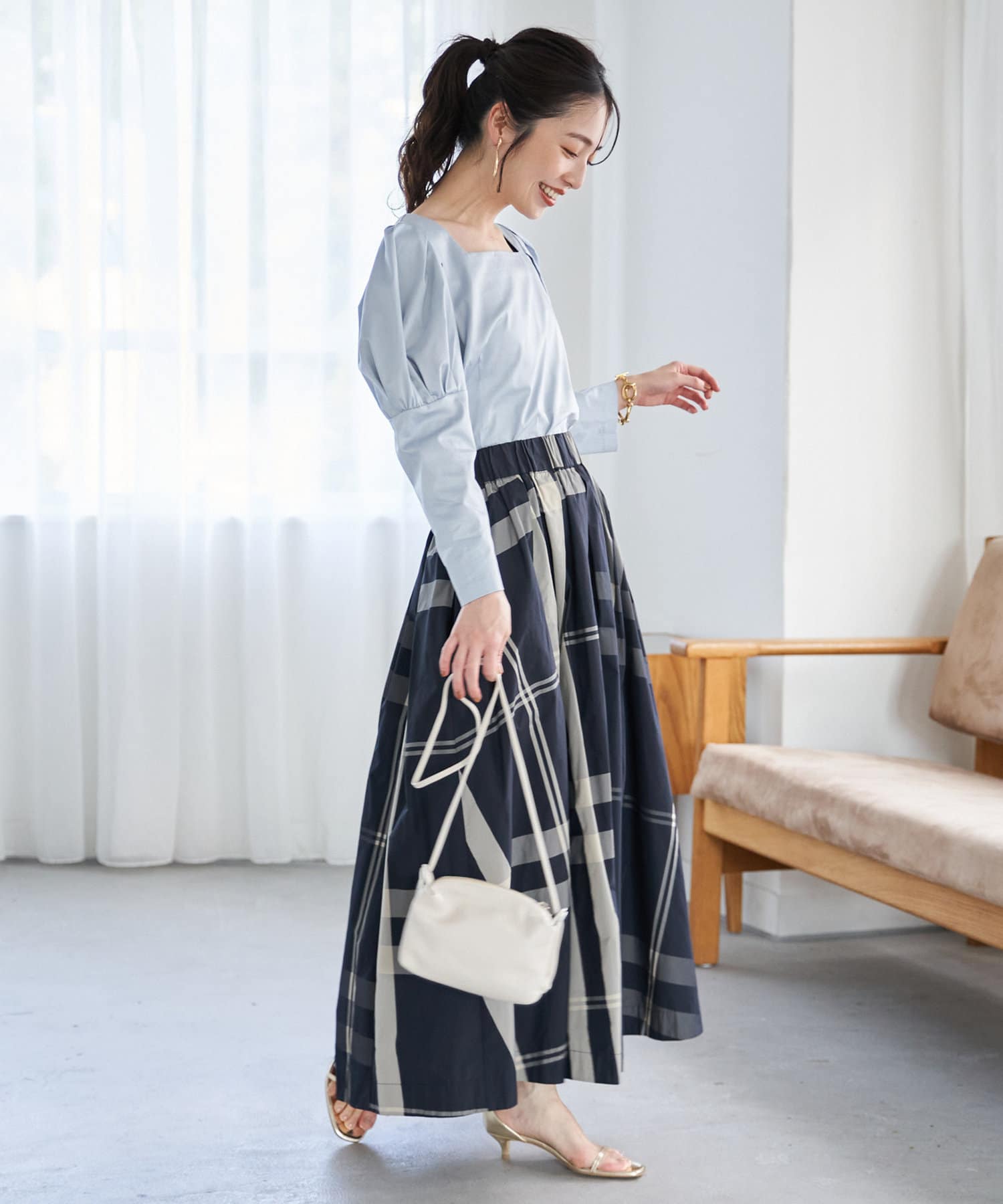 デコルテを美しく演出するスクエアネックと、袖のボリュームと手首の細さの対比で華奢見え効果にも期待できるアイテム。