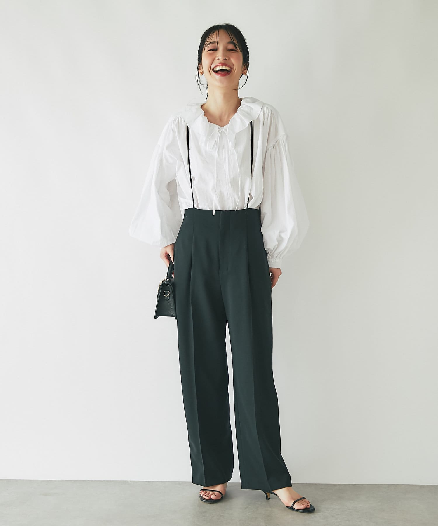 サスペンダーパンツやジレ・カーデのインナーに使用したレイヤードスタイルもおすすめ。