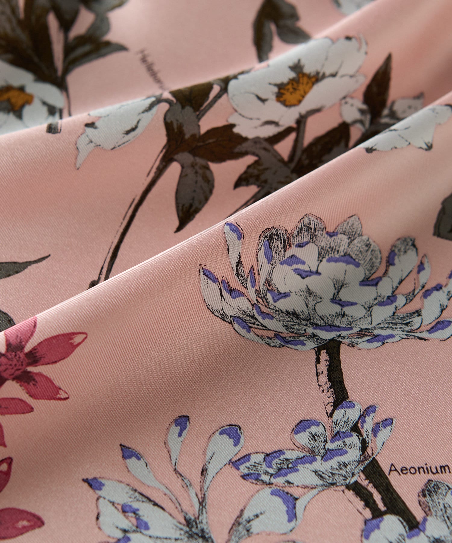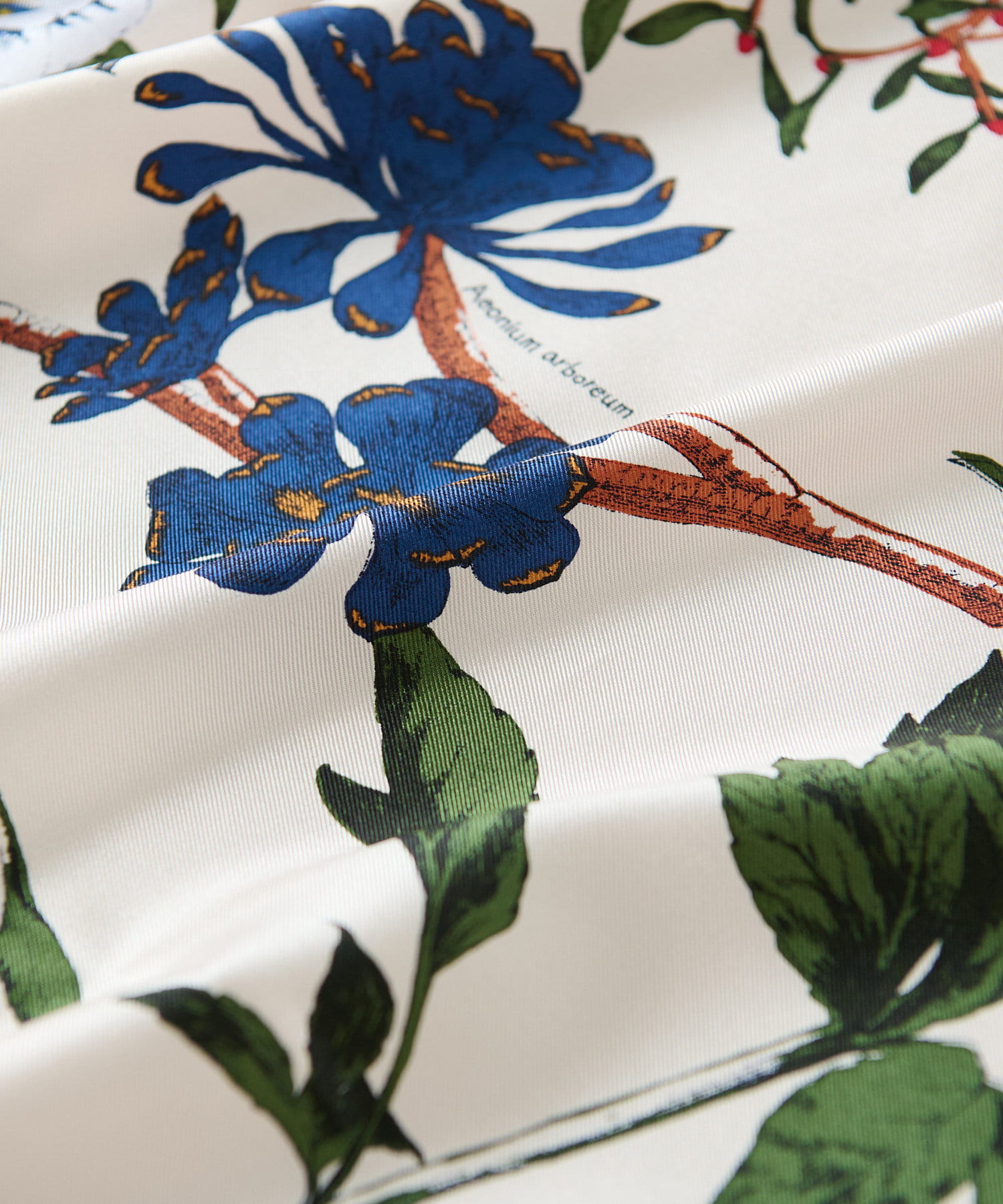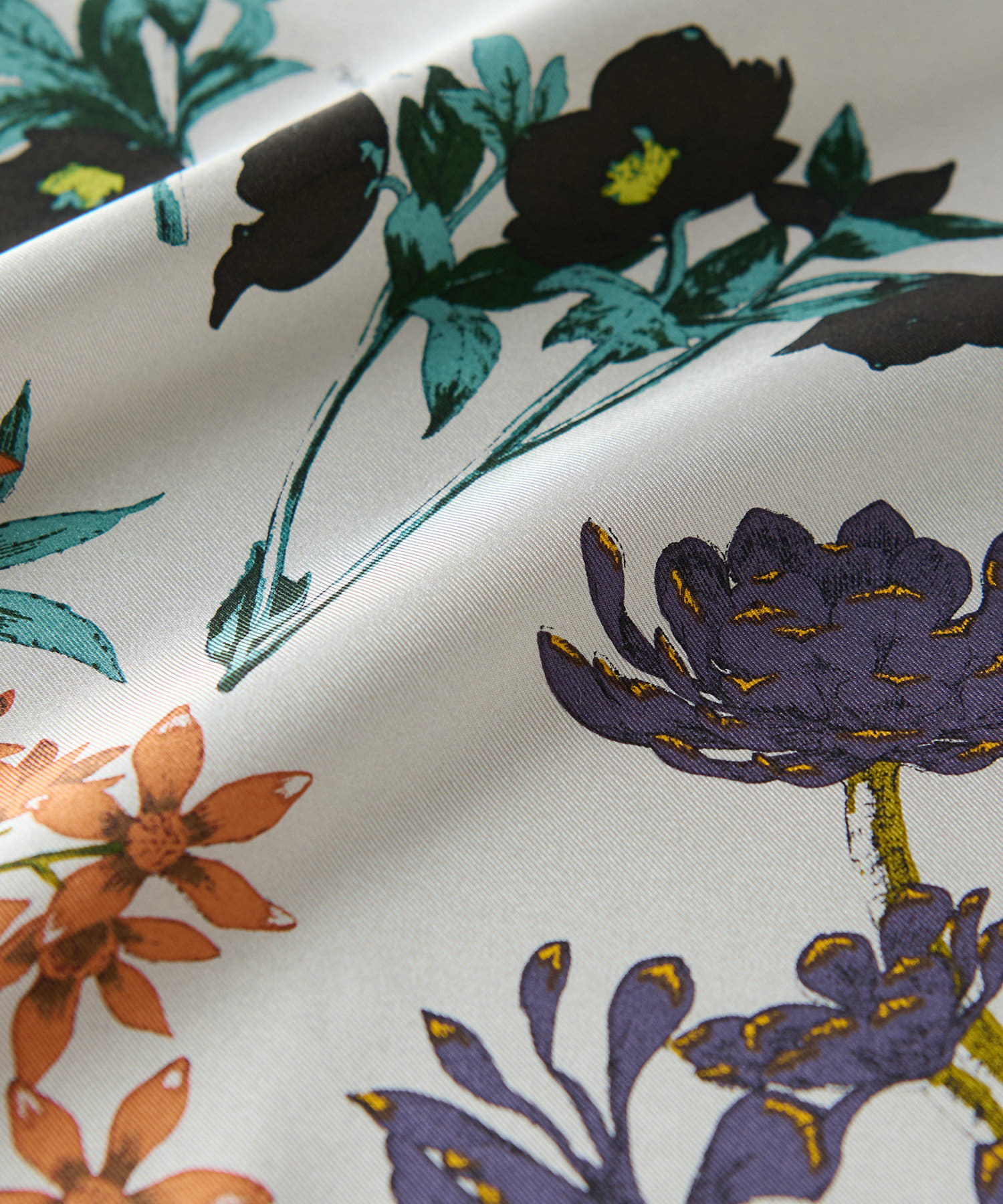 ヴィンテージスカーフからインスピレーションを得てつくられるスカーフやストールは、全て熟練の職人により一版ずつ手作業で丁寧に染め上げる手捺染(ハンドプリント)で作られています。